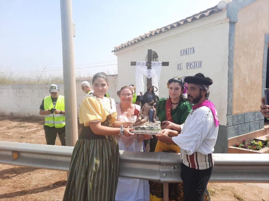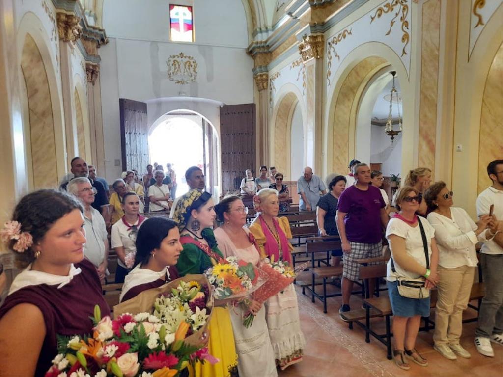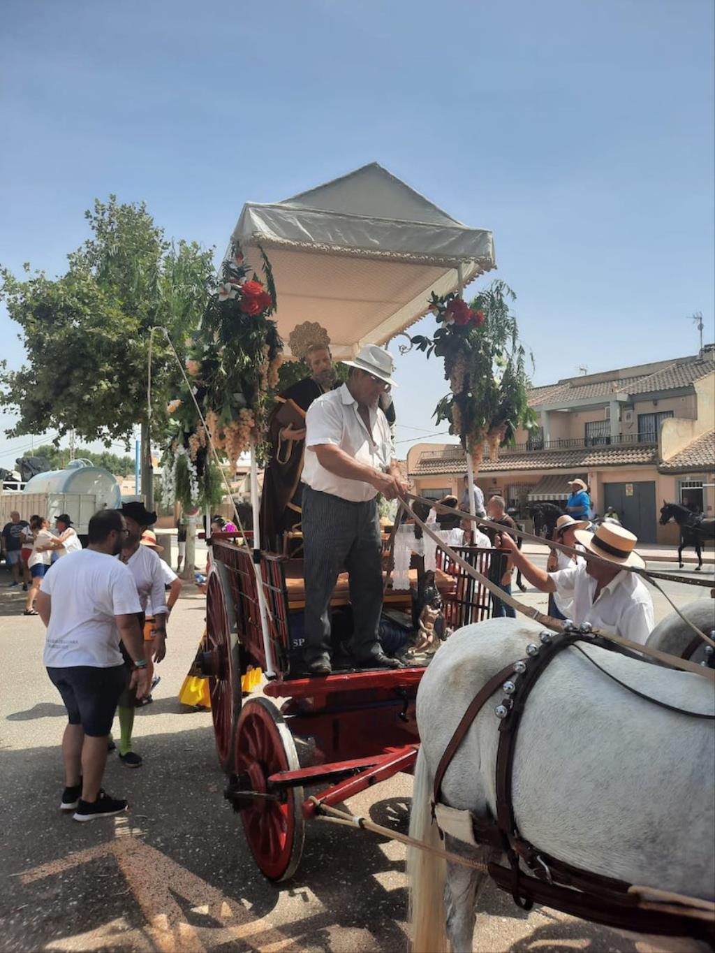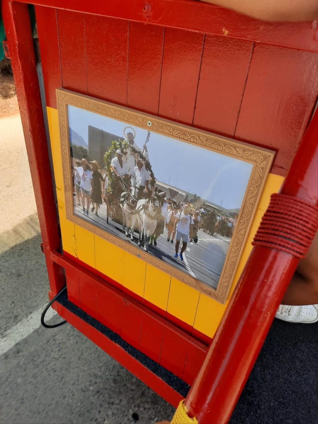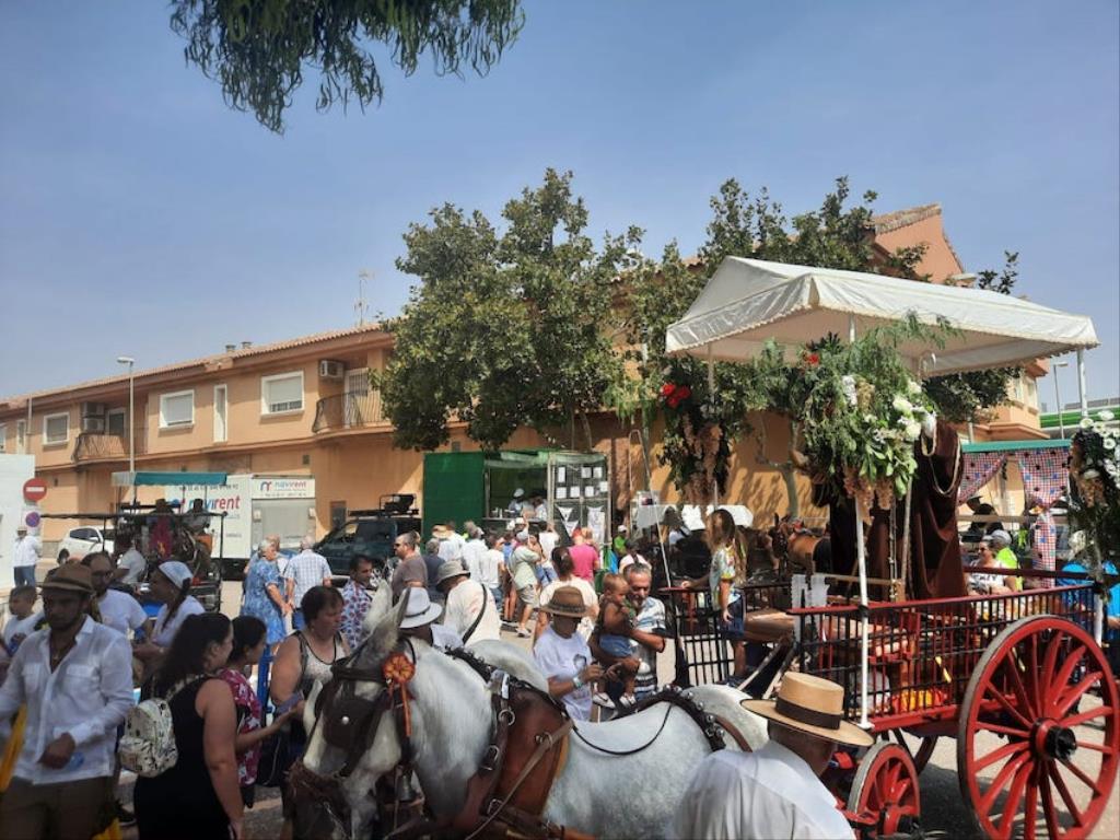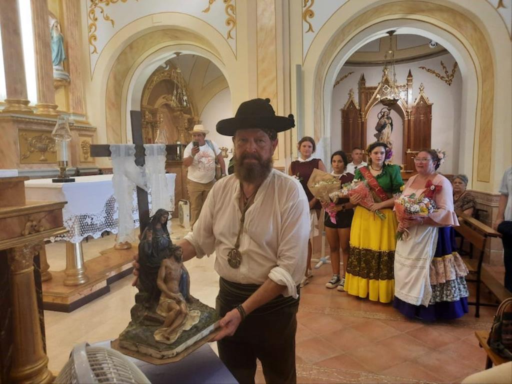 El pueblo siempre se vuelca con la llegada del patrono de Cartagena y este año no ha sido menos cuando la romería ha arribado por la romana vía Ylada, con parada en la ermita, donde la pequeña talla de Nuestra Señora de los Dolores se ha sumado al cortejo con dirección a la iglesia, donde ha tenido lugar una ofrenda floral. En la foto es sujetada la imagen por la madrina, Pilar Giménez, y por la maja, Esperanza Ayaso Sánchez.