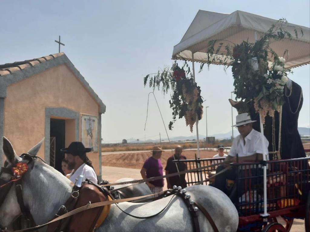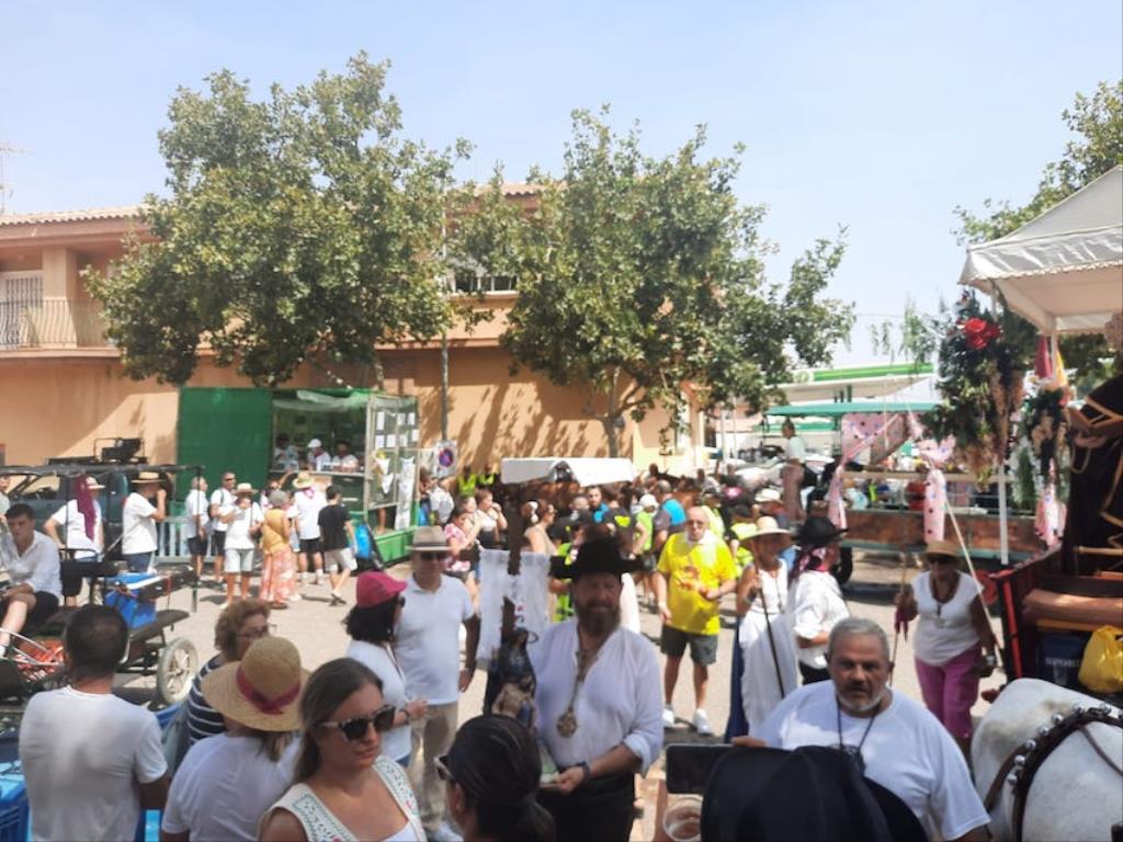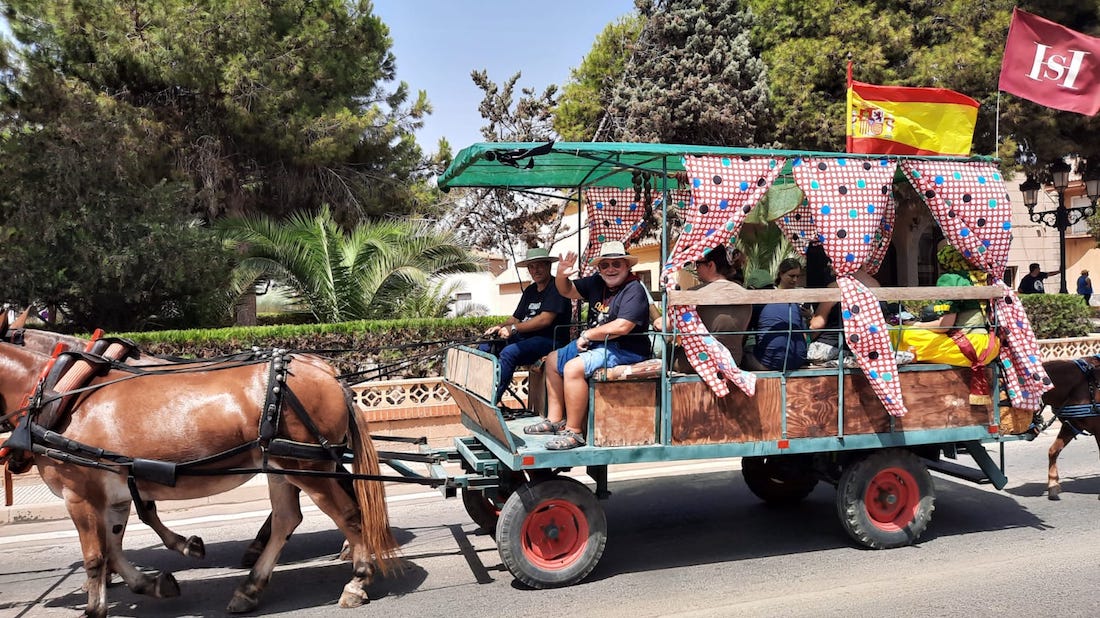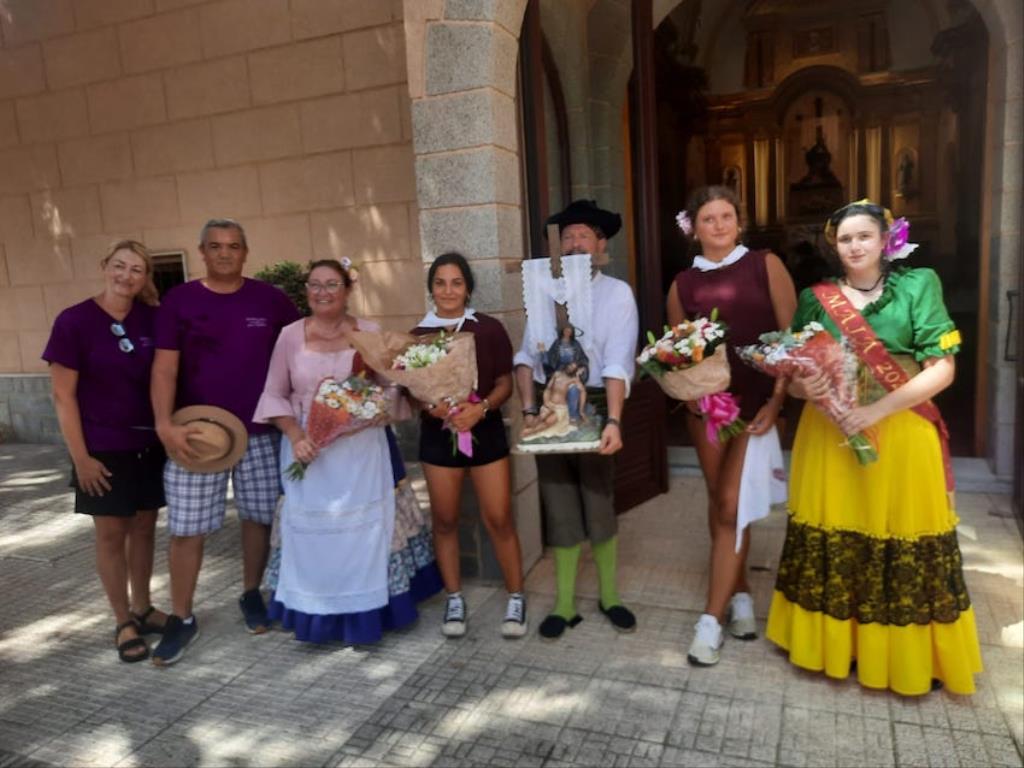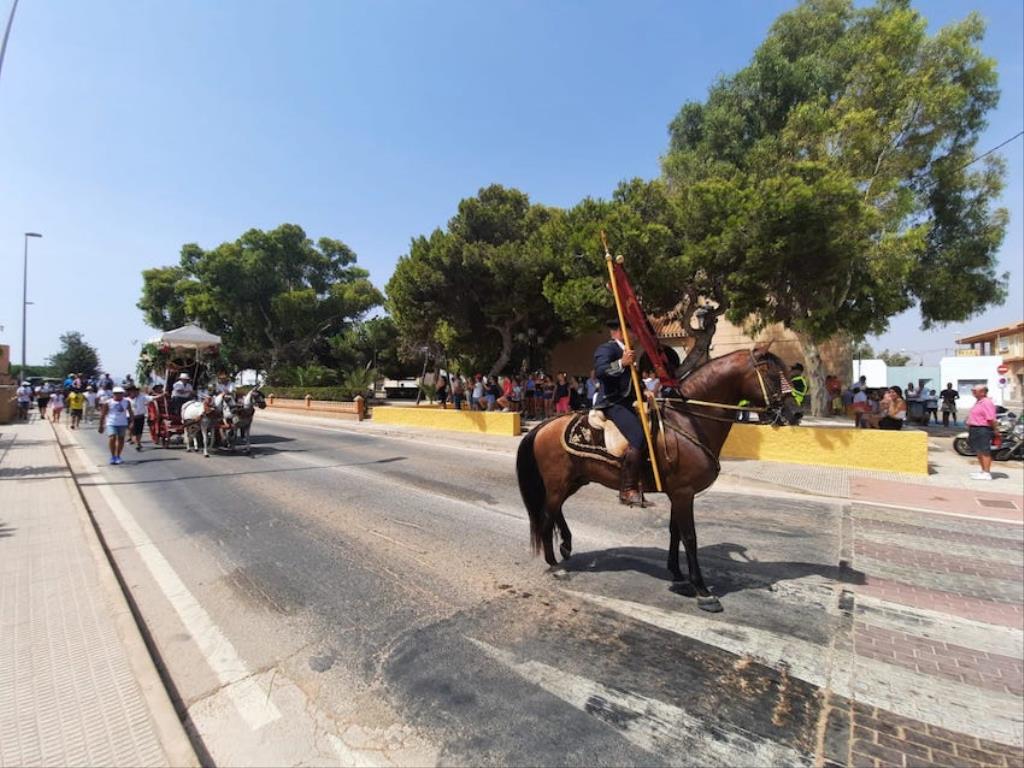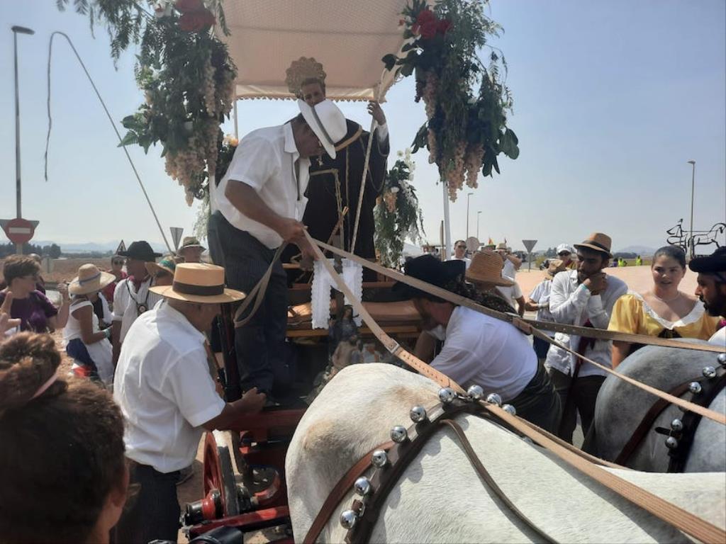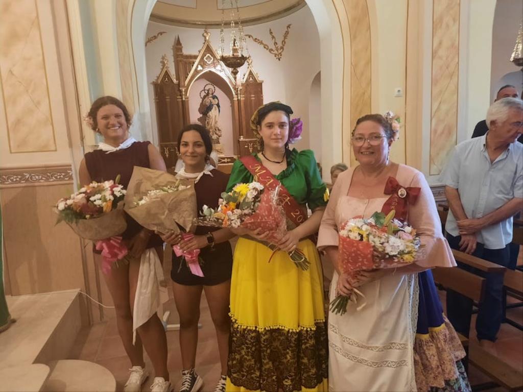 El pueblo siempre se vuelca con la llegada del patrono de Cartagena y este año no ha sido menos cuando la romería ha arribado por la romana vía Ylada, con parada en la ermita, donde la pequeña talla de Nuestra Señora de los Dolores se ha sumado al cortejo con dirección a la iglesia, donde ha tenido lugar una ofrenda floral. En la foto es sujetada la imagen por la madrina, Pilar Giménez, y por la maja, Esperanza Ayaso Sánchez.
