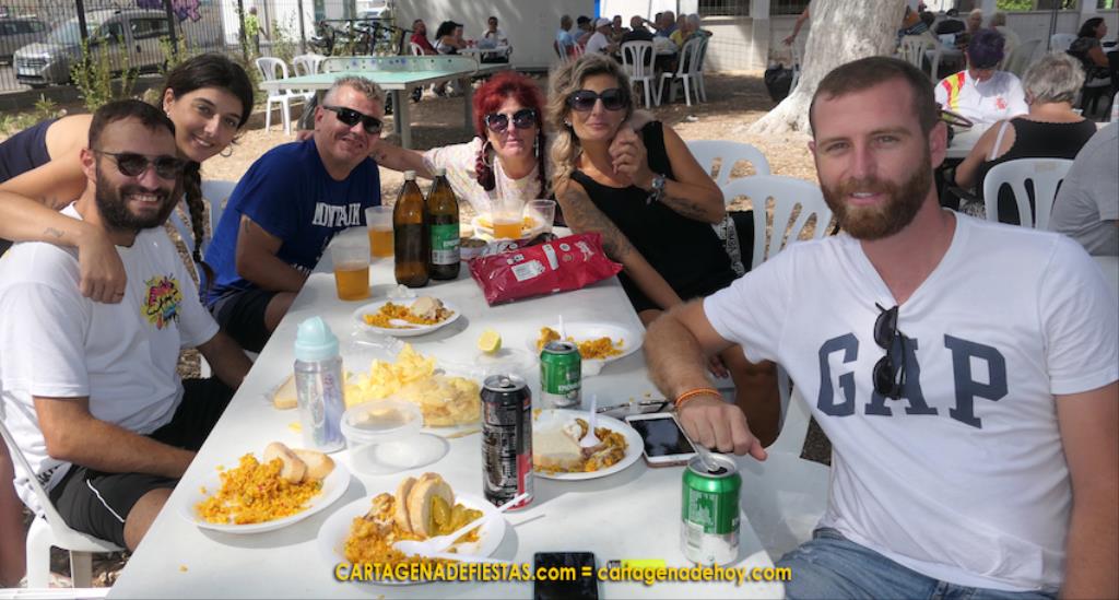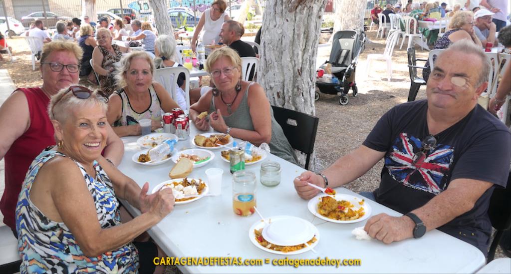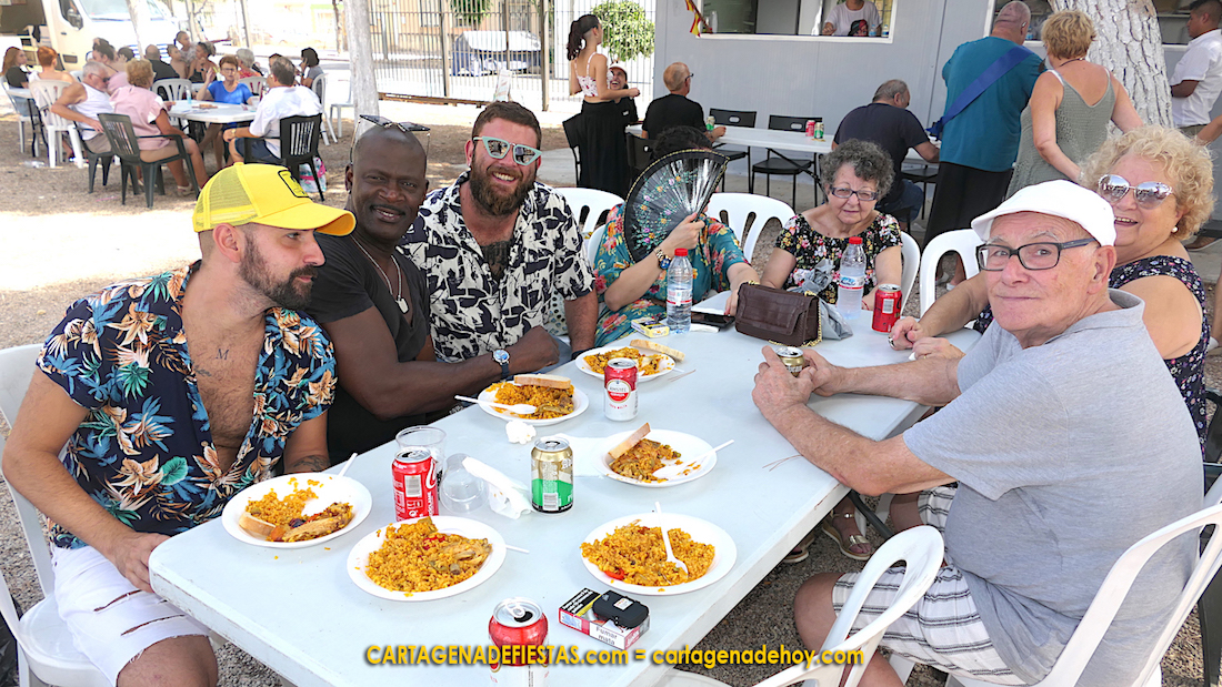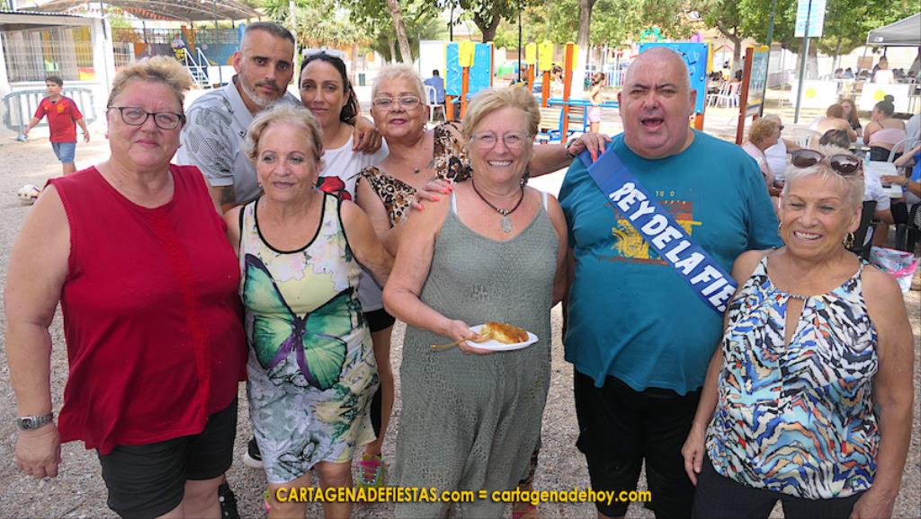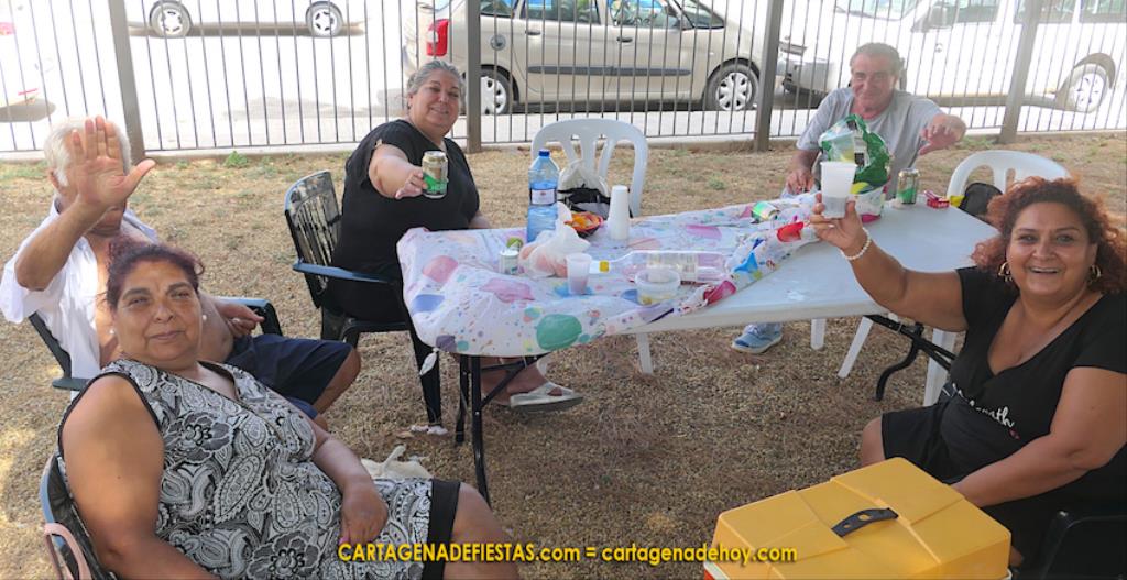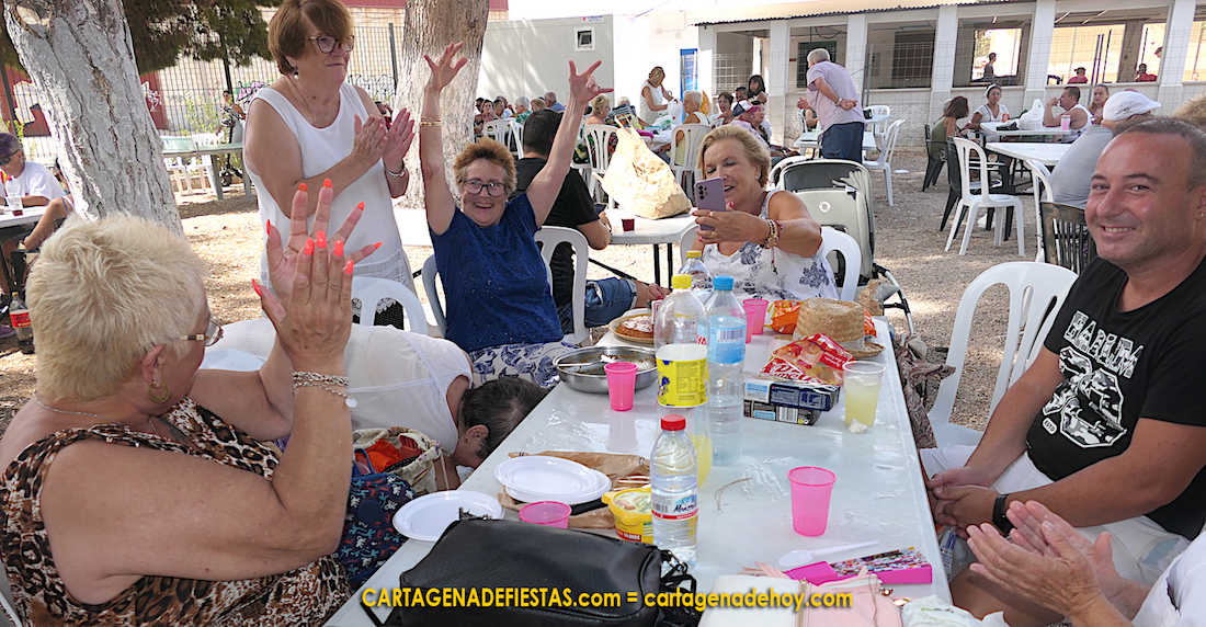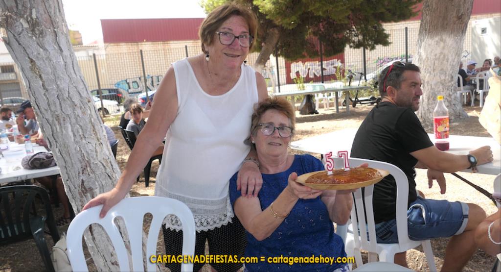 La imagen muestra el momento en que las amigas aplauden tras cantar la popular canción a una vecina que cumplía 75 años y que lo celebró en un agradable día de las fiestas de la barriada cartagenera, que tuvo un gran arroz como protagonista de la comida de convivencia.