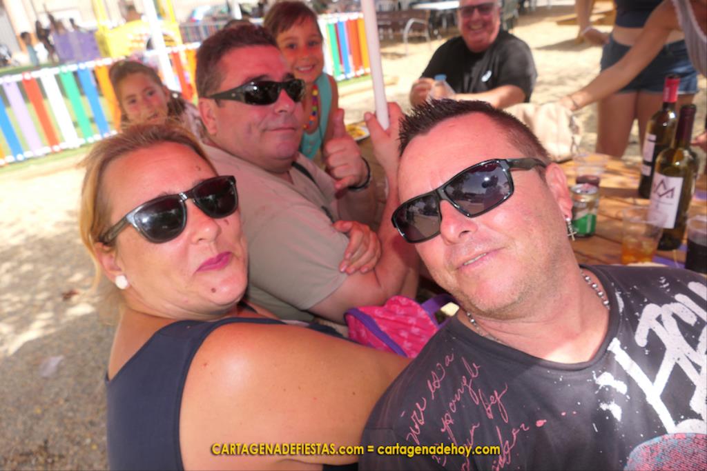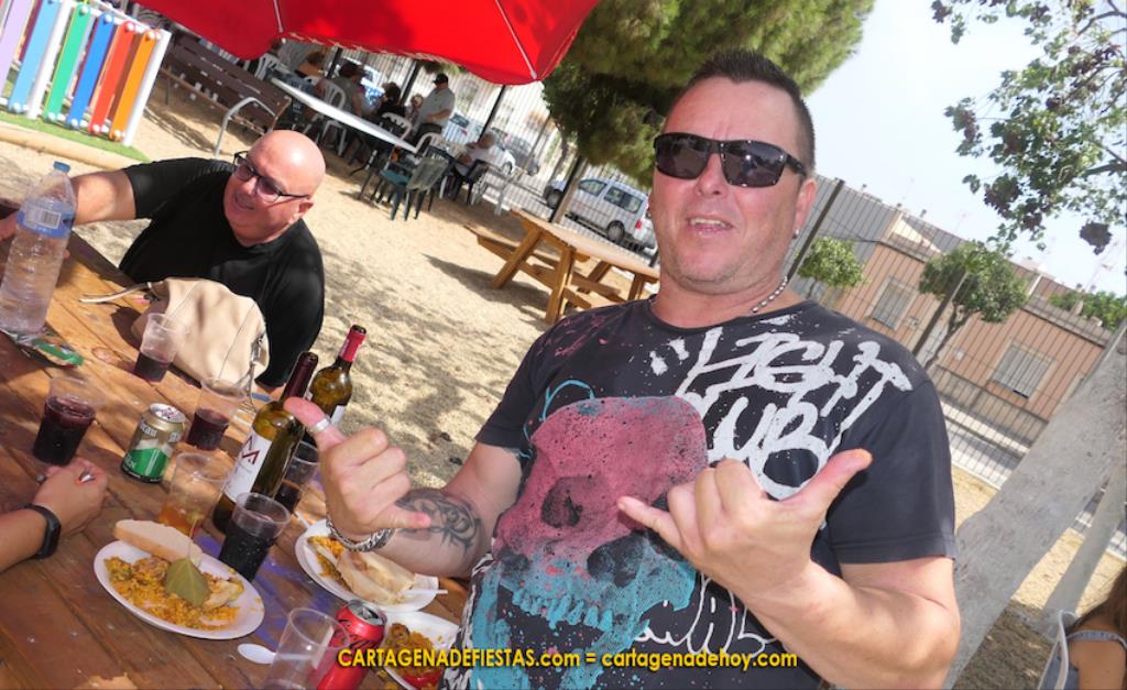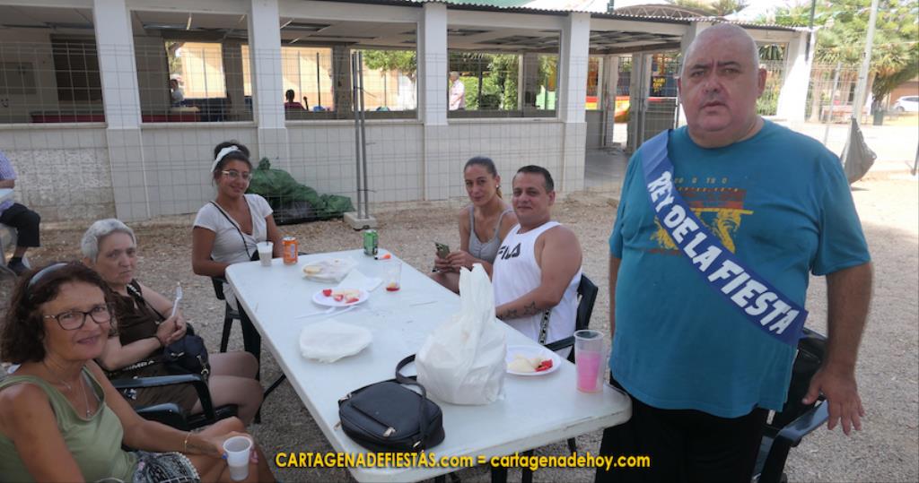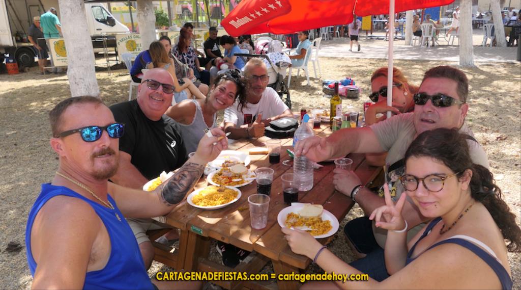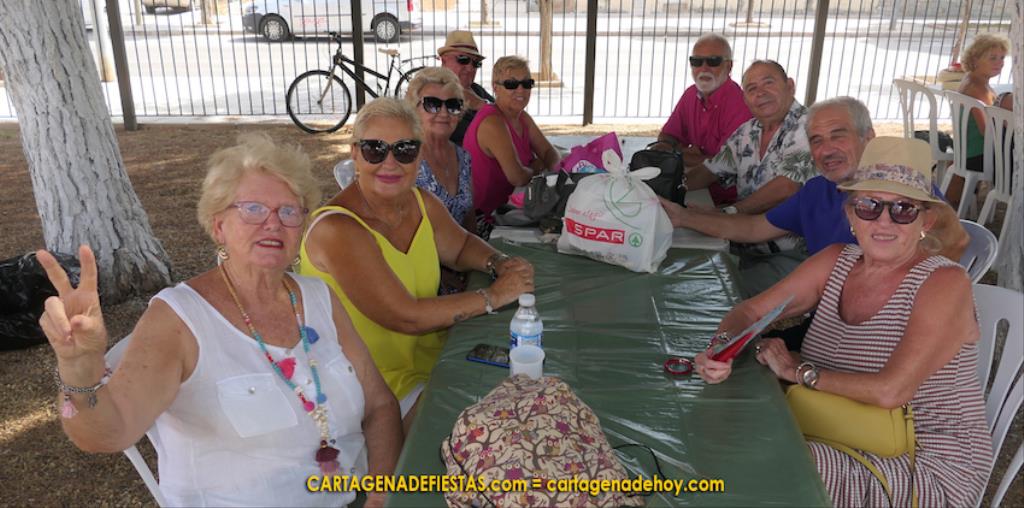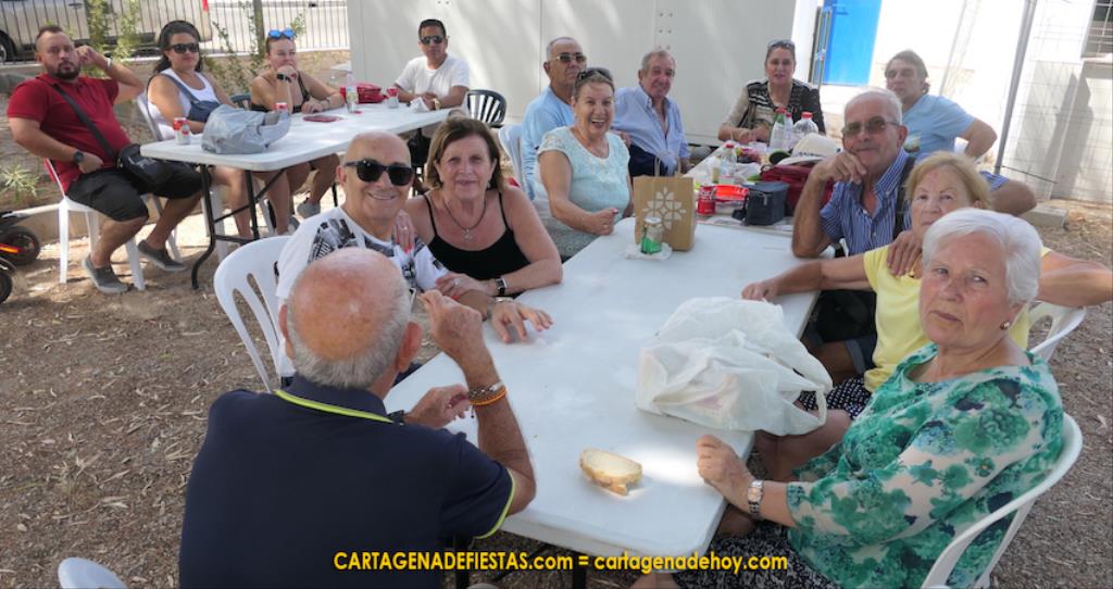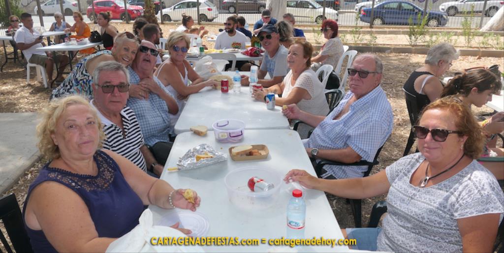 La imagen muestra el momento en que las amigas aplauden tras cantar la popular canción a una vecina que cumplía 75 años y que lo celebró en un agradable día de las fiestas de la barriada cartagenera, que tuvo un gran arroz como protagonista de la comida de convivencia.