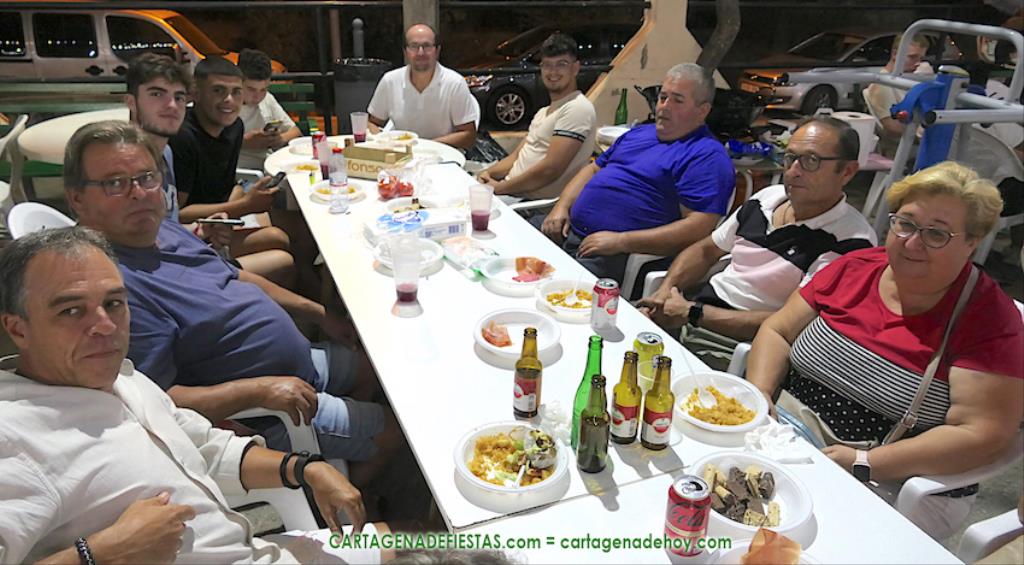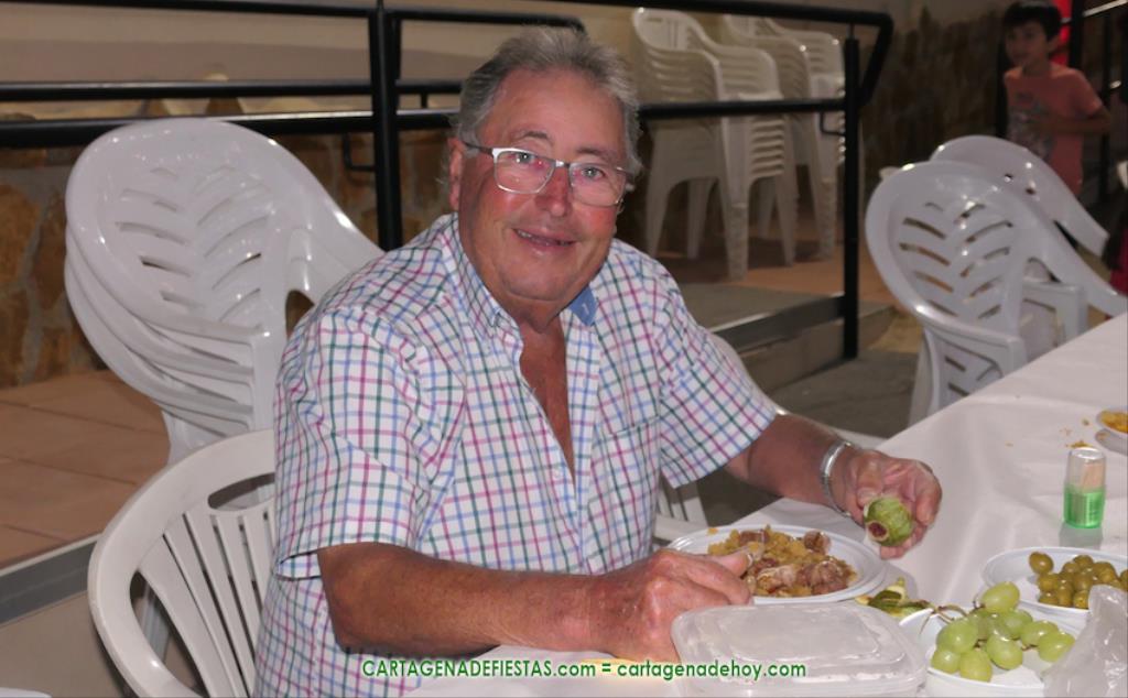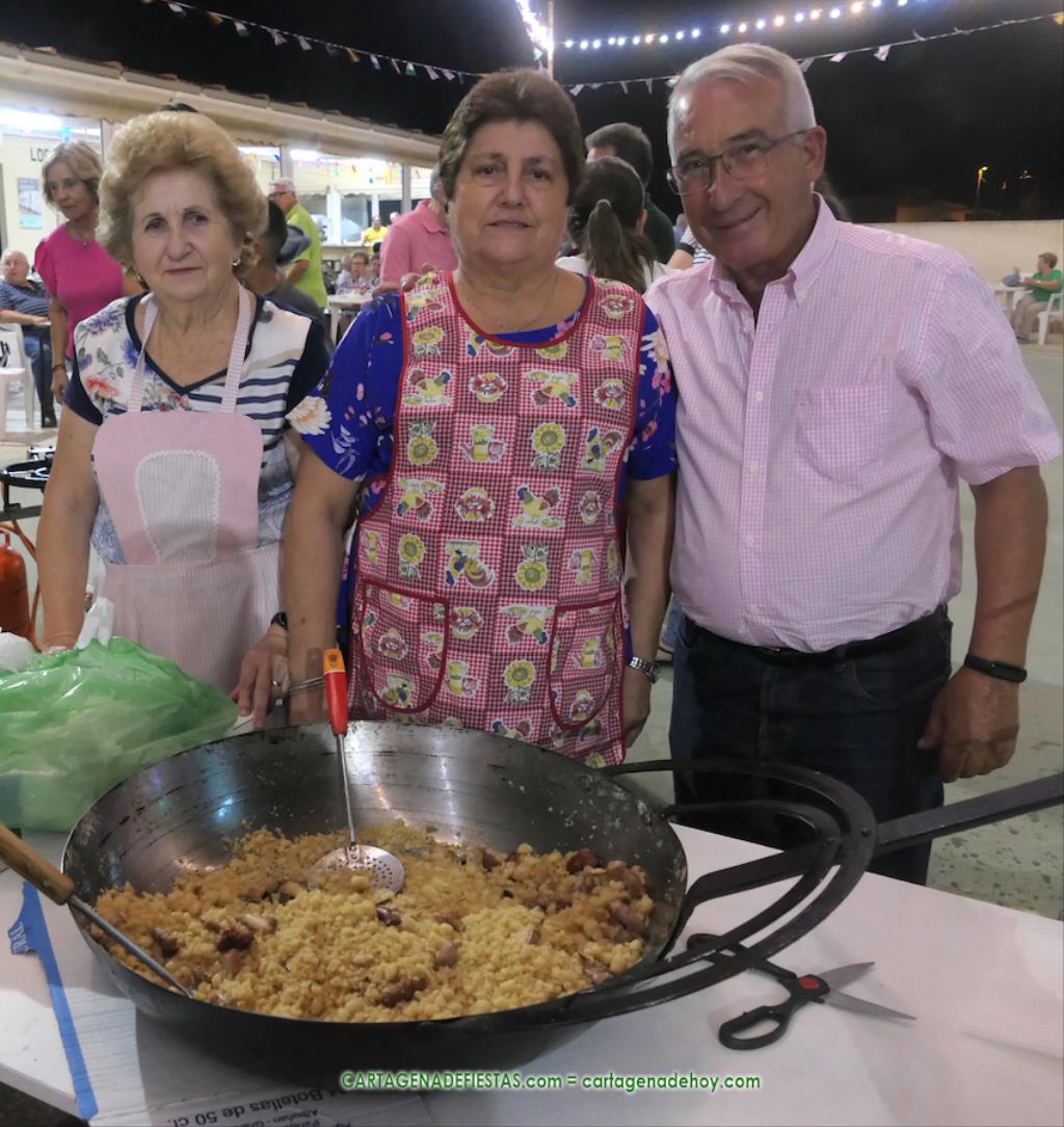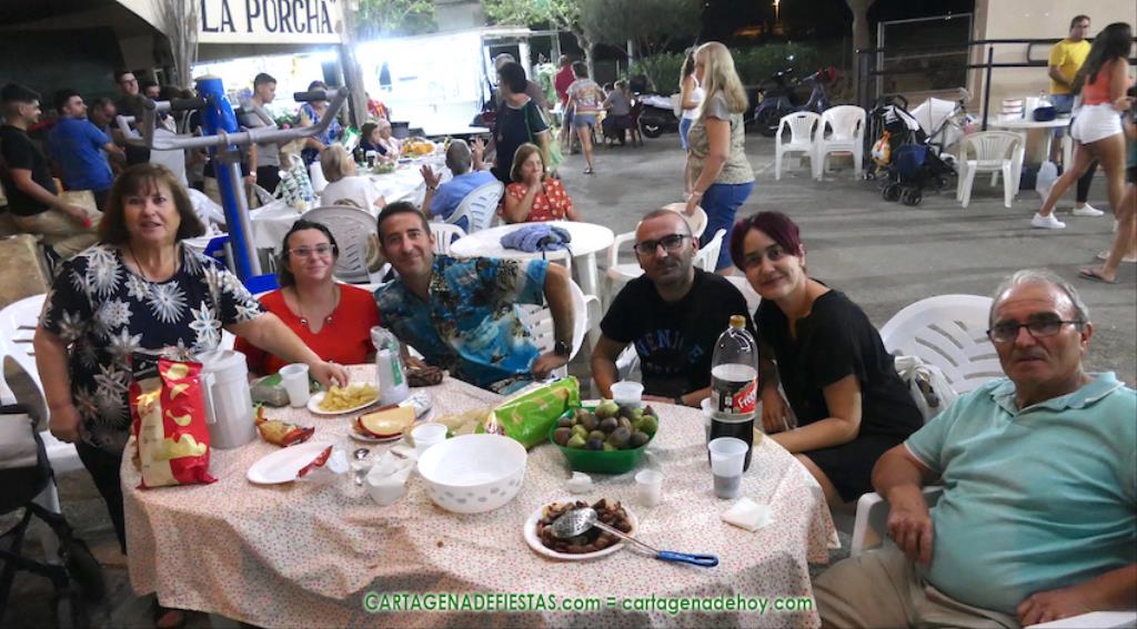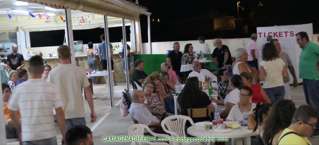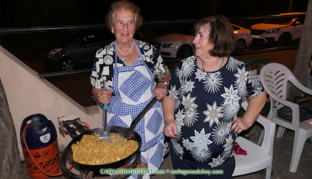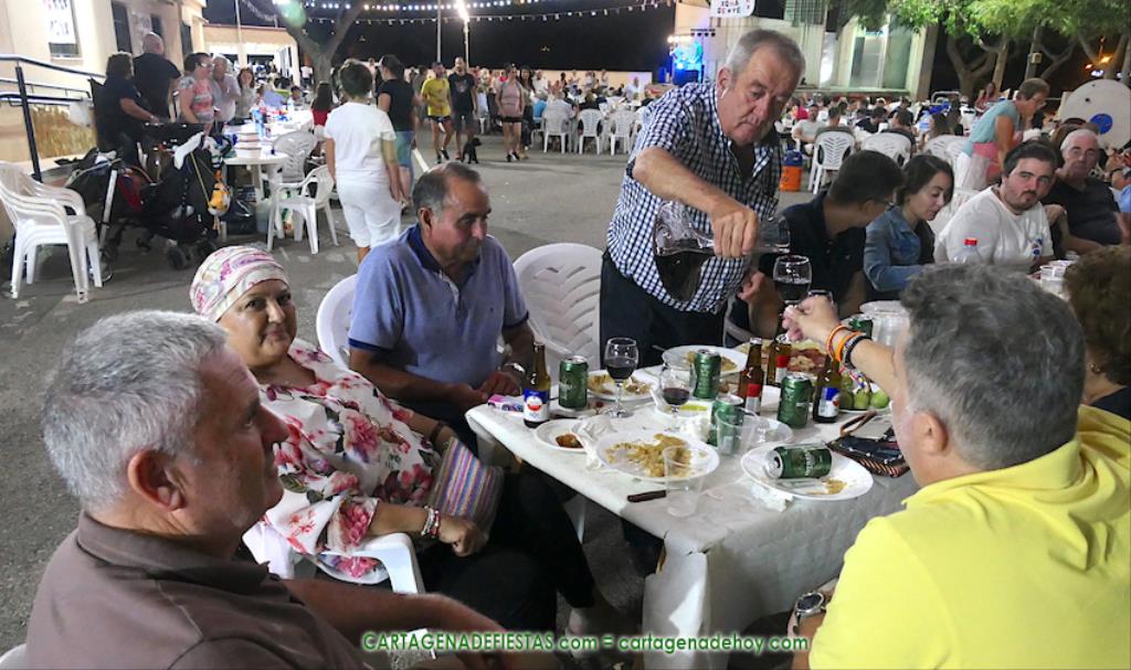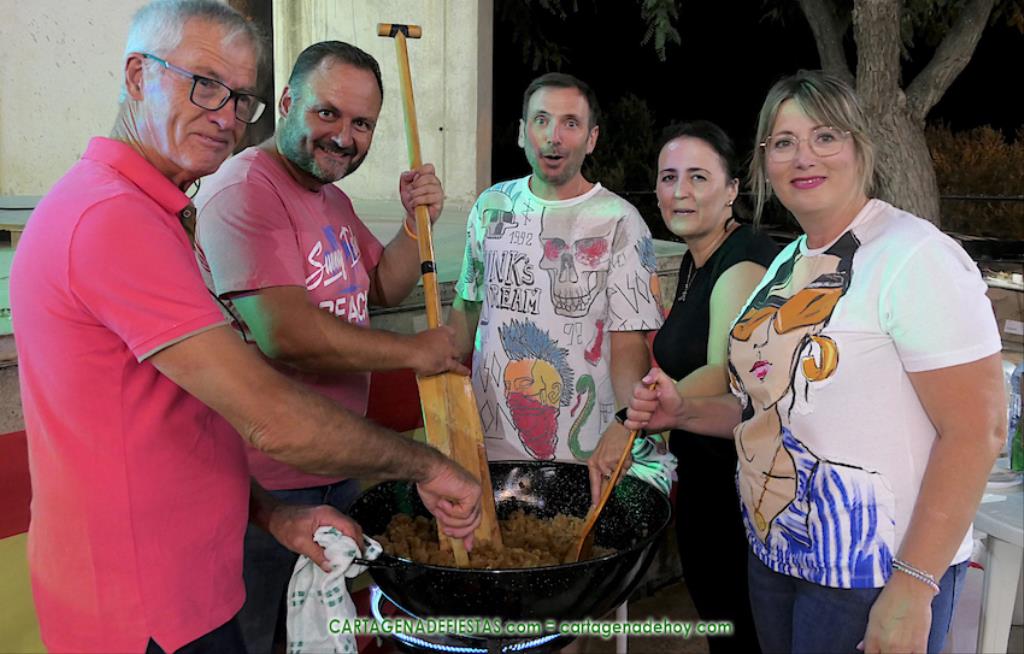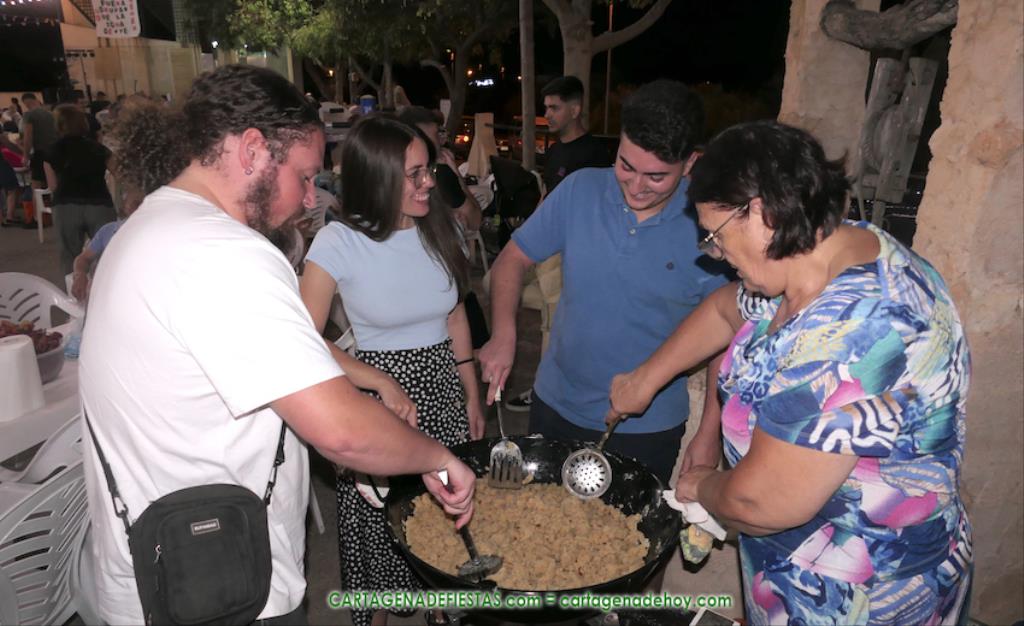 Las fiestas de los pueblos cartageneros y las migas van ligadas en la mayoría de ocasiones, convirtiendo los recintos festeros, en la mayoría de ocasiones, en gigantescos comedores donde manjares de todo tipo acompañan veladas en las que la harina elaborada con aceite, sal, longaniza, ajos y tocino, entre otros productos, es la reina. Anoche, junto al magnífico Museo Etnográfico, pudimos comprobarlo. Por un lado agradaba ver a jóvenes y mayores trabajar las migas con raseras, cucharas de madera y, en el caso del grupo de Molinos Marfagones, hasta con un gran remo. También nos llamó la atención María Lorente, quien, mientras meneaba las migas ruleras, nos decía que tiene 86 años y que fue hace 76 cuando hizo las primeras. No ha fallado desde entonces año alguno, ya sea en casa o en las fiestas, donde es fiel participante. Luego estaban los acompañamientos, como morcillas, empanadillas, sobrasada, queso, jamón, tortilla, etc. Vamos, un gran festín, que se vio aderezado por las bebidas que se dispensaban en la cantina o se traían de casa, como el buen vino que servía, con escarciador, Domingo, otro vecino de Los Puertos. También llamaban la atención los higos y uvas, que son buenos acompañamientos para tomar las migas, y los dulces, destacando los higos confitados que, con un aspecto estupendo, elaboró para anoche Tere.