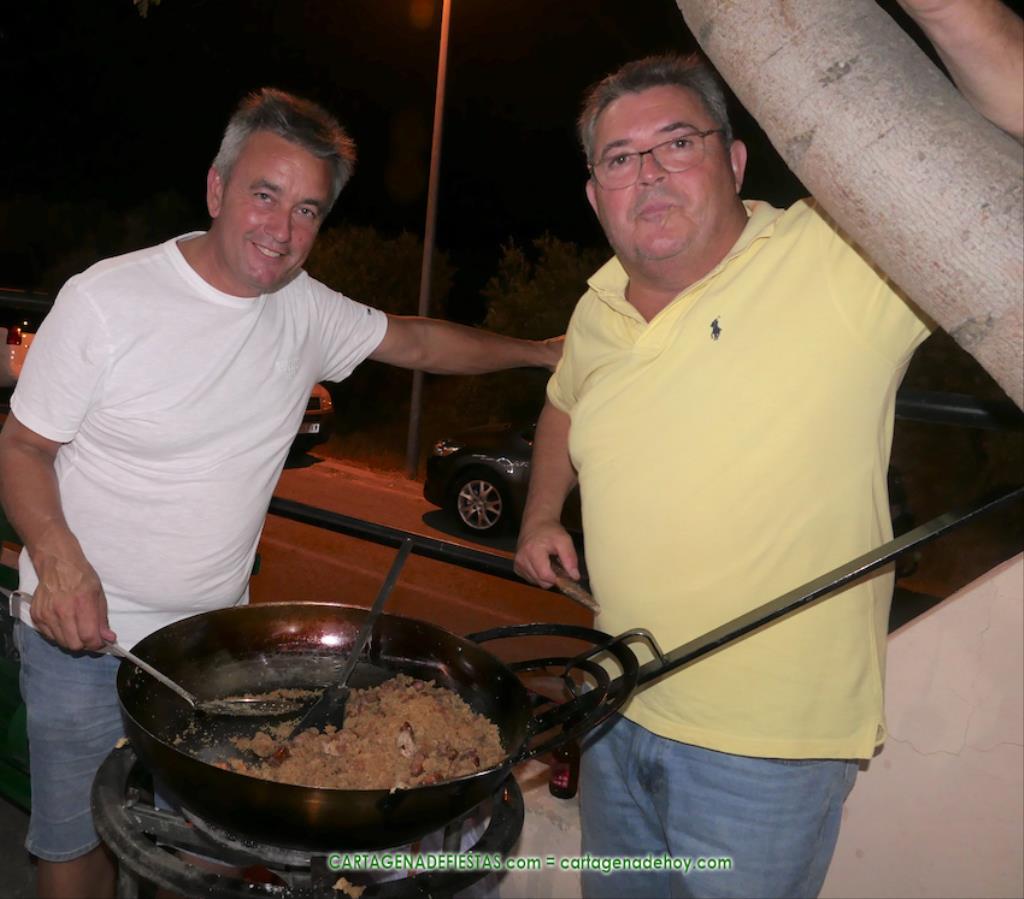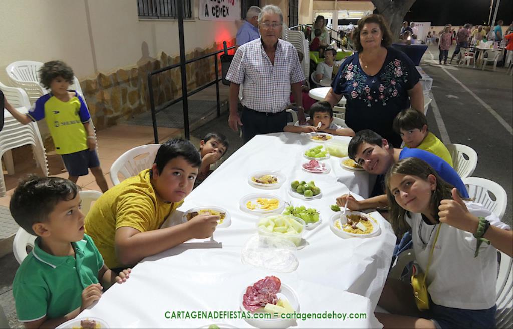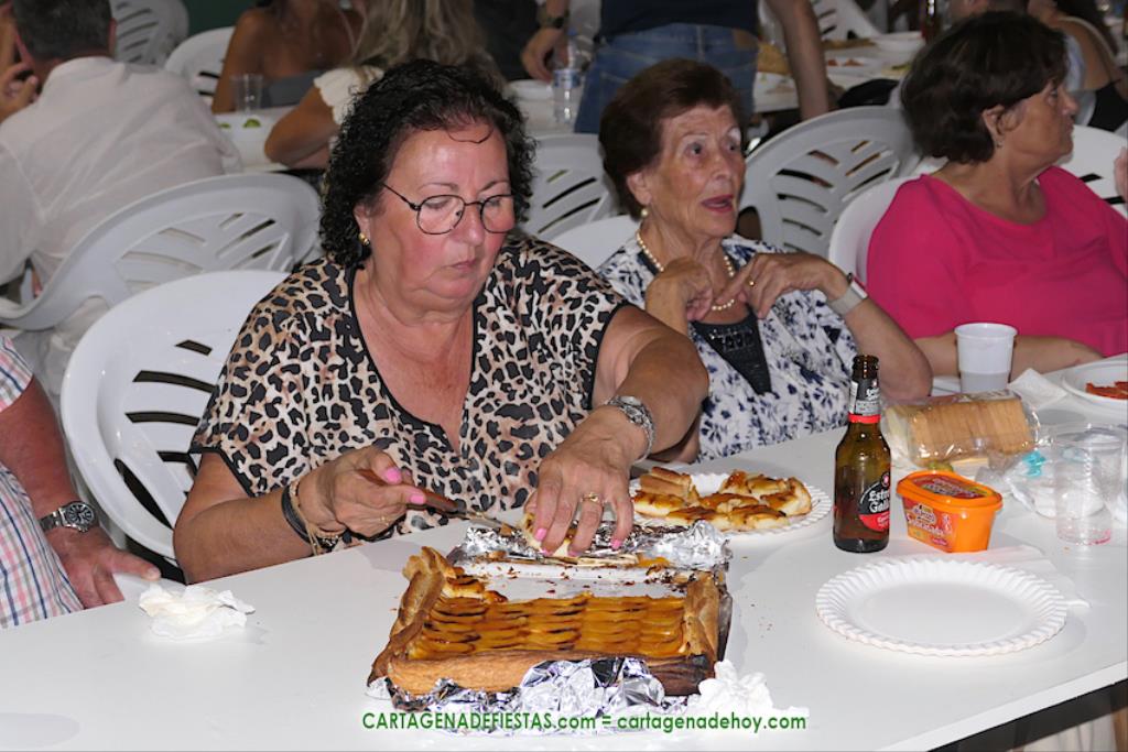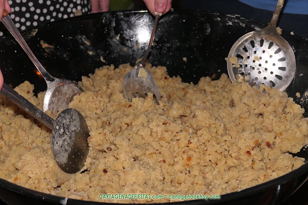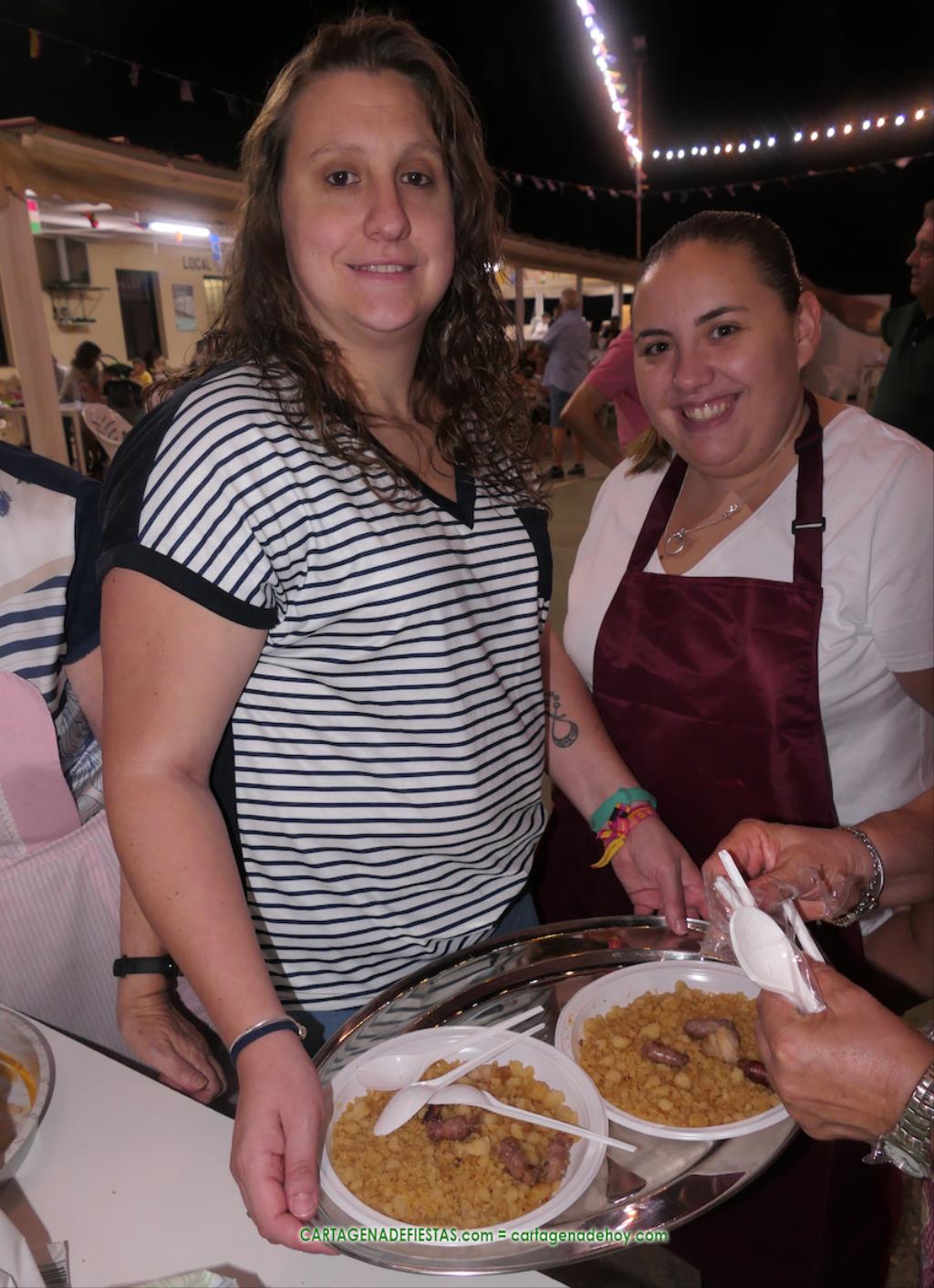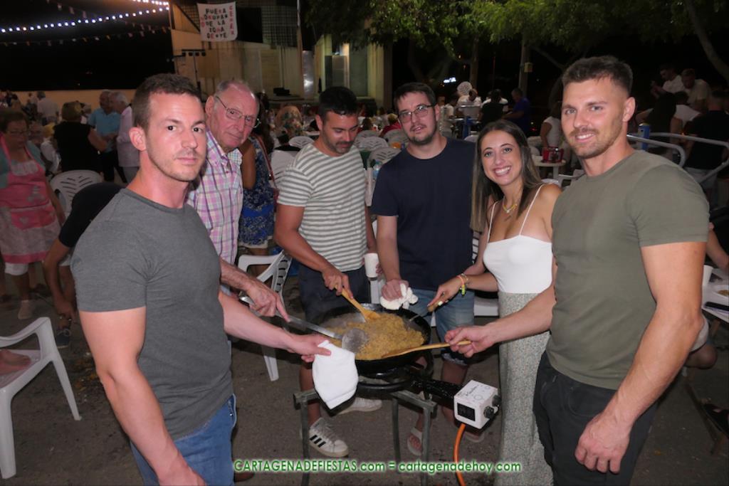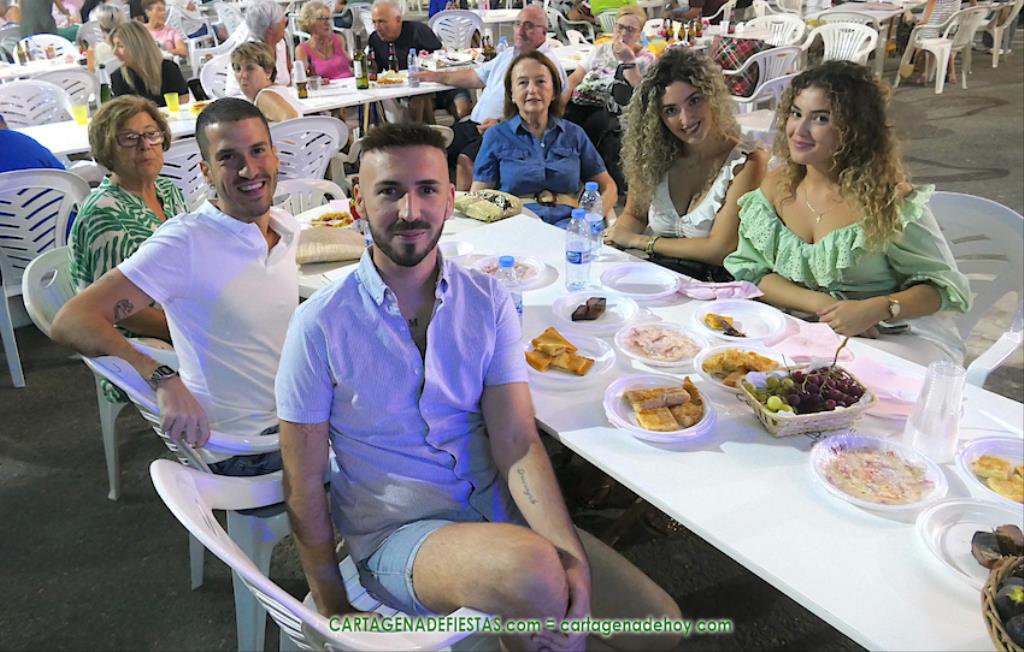 Las fiestas de los pueblos cartageneros y las migas van ligadas en la mayoría de ocasiones, convirtiendo los recintos festeros, en la mayoría de ocasiones, en gigantescos comedores donde manjares de todo tipo acompañan veladas en las que la harina elaborada con aceite, sal, longaniza, ajos y tocino, entre otros productos, es la reina. Anoche, junto al magnífico Museo Etnográfico, pudimos comprobarlo. Por un lado agradaba ver a jóvenes y mayores trabajar las migas con raseras, cucharas de madera y, en el caso del grupo de Molinos Marfagones, hasta con un gran remo. También nos llamó la atención María Lorente, quien, mientras meneaba las migas ruleras, nos decía que tiene 86 años y que fue hace 76 cuando hizo las primeras. No ha fallado desde entonces año alguno, ya sea en casa o en las fiestas, donde es fiel participante. Luego estaban los acompañamientos, como morcillas, empanadillas, sobrasada, queso, jamón, tortilla, etc. Vamos, un gran festín, que se vio aderezado por las bebidas que se dispensaban en la cantina o se traían de casa, como el buen vino que servía, con escarciador, Domingo, otro vecino de Los Puertos. También llamaban la atención los higos y uvas, que son buenos acompañamientos para tomar las migas, y los dulces, destacando los higos confitados que, con un aspecto estupendo, elaboró para anoche Tere.