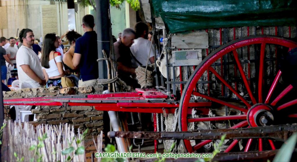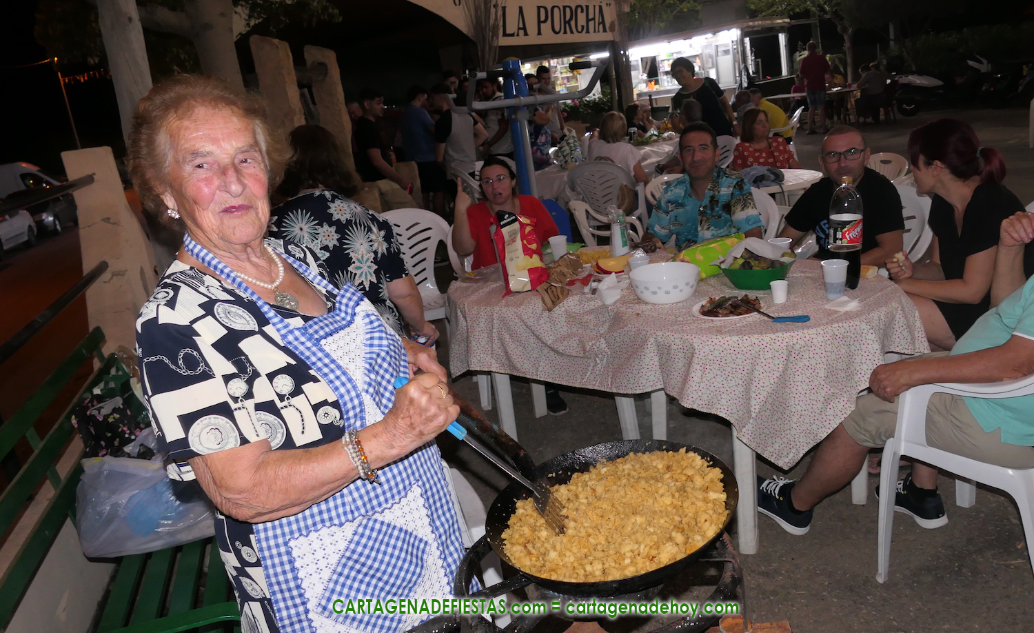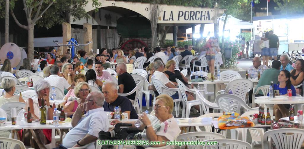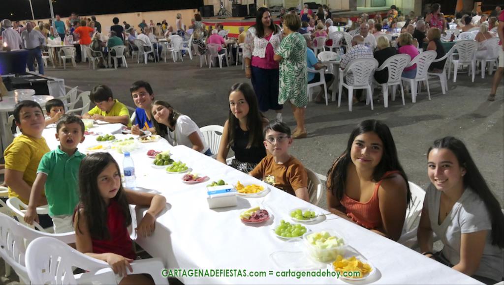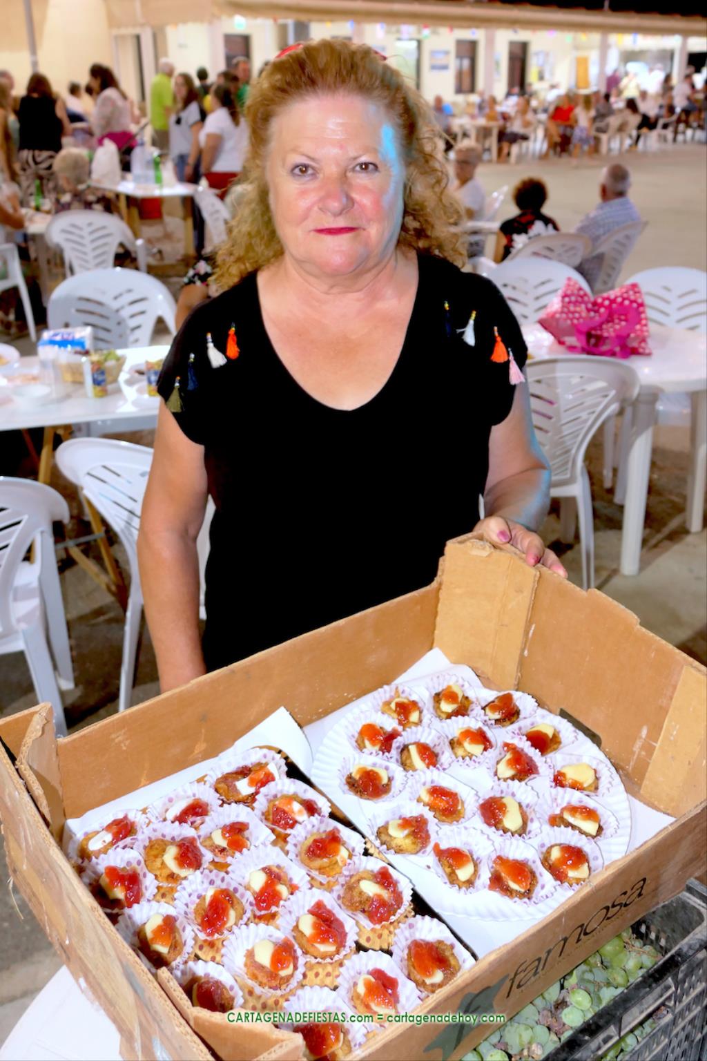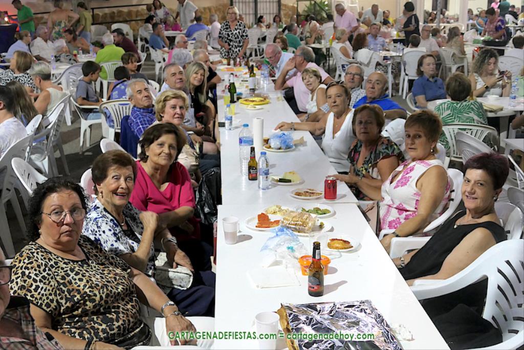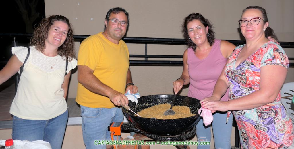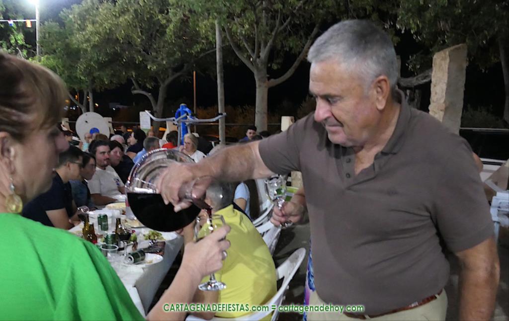 Las fiestas de los pueblos cartageneros y las migas van ligadas en la mayoría de ocasiones, convirtiendo los recintos festeros, en la mayoría de ocasiones, en gigantescos comedores donde manjares de todo tipo acompañan veladas en las que la harina elaborada con aceite, sal, longaniza, ajos y tocino, entre otros productos, es la reina. Anoche, junto al magnífico Museo Etnográfico, pudimos comprobarlo. Por un lado agradaba ver a jóvenes y mayores trabajar las migas con raseras, cucharas de madera y, en el caso del grupo de Molinos Marfagones, hasta con un gran remo. También nos llamó la atención María Lorente, quien, mientras meneaba las migas ruleras, nos decía que tiene 86 años y que fue hace 76 cuando hizo las primeras. No ha fallado desde entonces año alguno, ya sea en casa o en las fiestas, donde es fiel participante. Luego estaban los acompañamientos, como morcillas, empanadillas, sobrasada, queso, jamón, tortilla, etc. Vamos, un gran festín, que se vio aderezado por las bebidas que se dispensaban en la cantina o se traían de casa, como el buen vino que servía, con escarciador, Domingo, otro vecino de Los Puertos. También llamaban la atención los higos y uvas, que son buenos acompañamientos para tomar las migas, y los dulces, destacando los higos confitados que, con un aspecto estupendo, elaboró para anoche Tere.