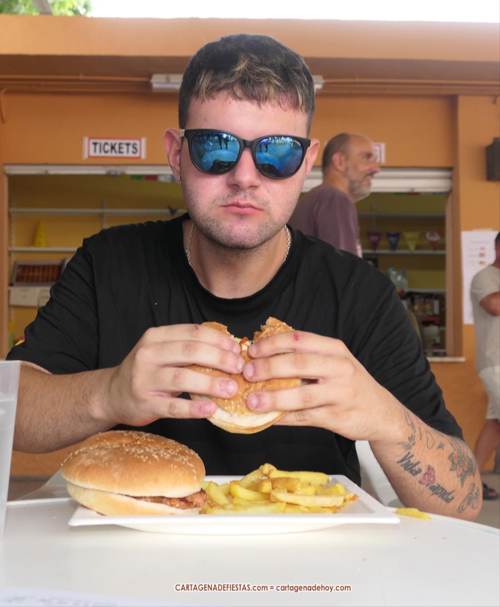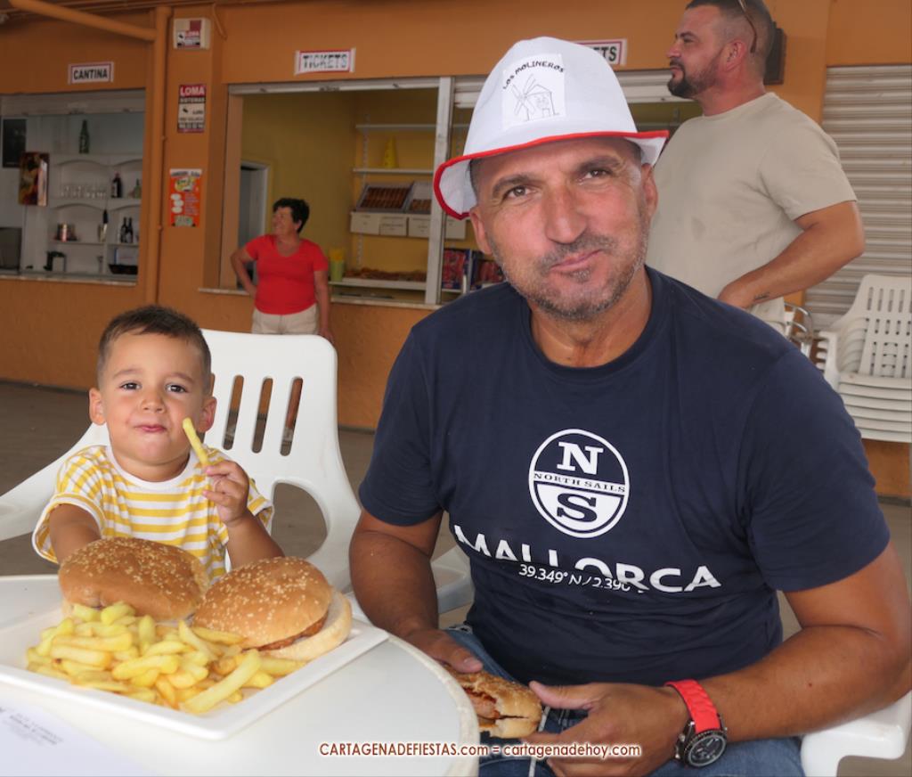 De pronto, comienza a sonar en el recinto festero la popular y motivadora música de 'Gonna Fly Now'. El motivo es que va a comenzar el concurso que premiará al que más hamburguesas coma en 10 minutos, novedad de las muy renovadas fiestas de Molinos Marfagones. Mientras suena el tema que compuso Bill Conti para la película 'Rocky', Salvador Madrid va a anunciando a los siete participantes, quienes se van sentando en mesas alineadas bajo la techumbre del área de cantina. A cada uno, la organización le proporciona una botella de dos litros de agua.