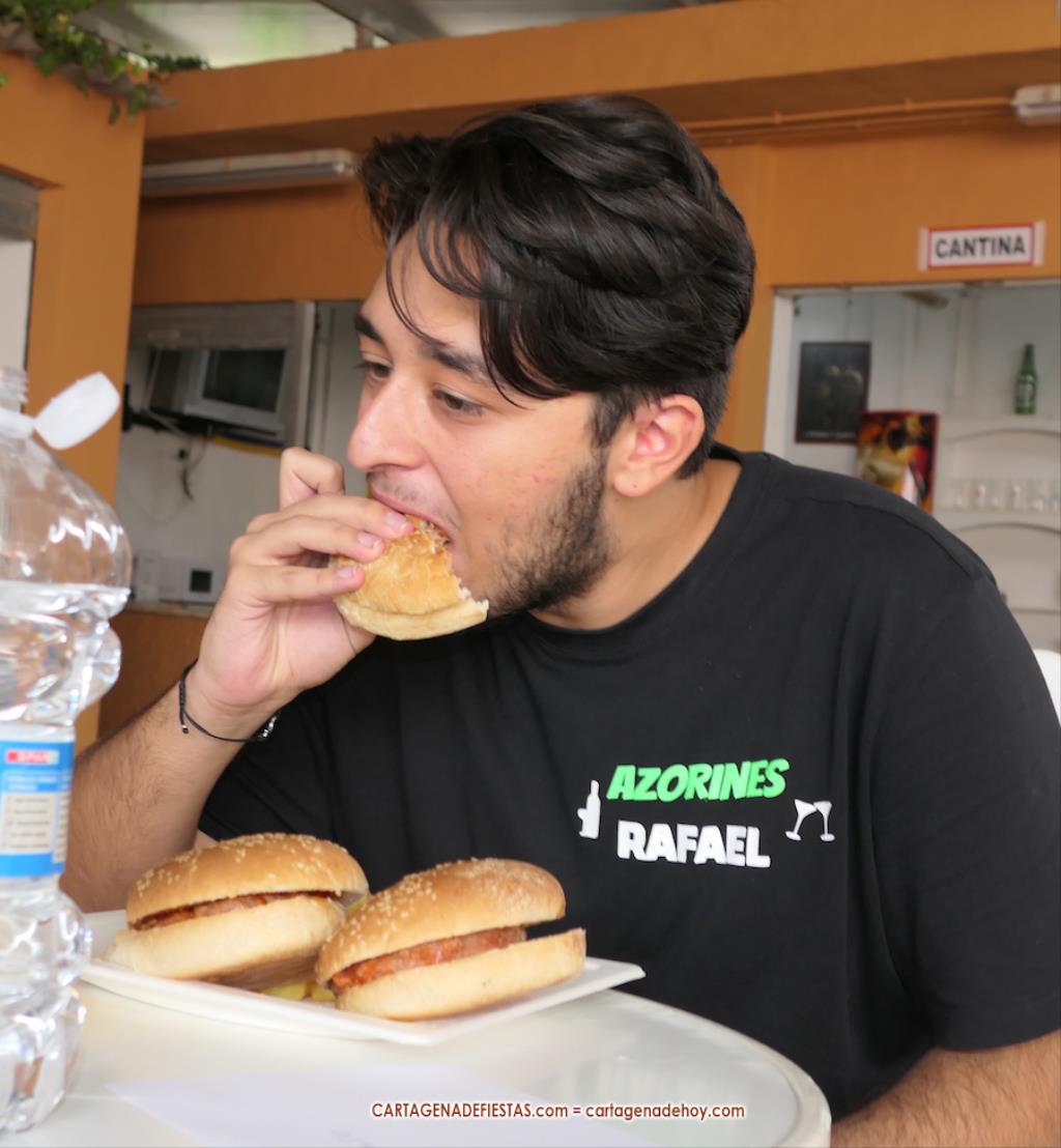 Damián, Chanete y Juan ocuparon los primeros puestos del podio del novedoso y simpático concurso de 'glotones' de las fiestas tras comerse tres hamburguesas picantes cada uno en 10 minutos, resolviendo el concurso el número de patatas que dejaron en el plato cada uno.