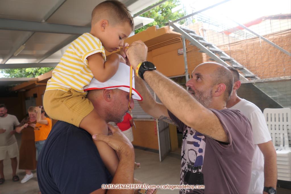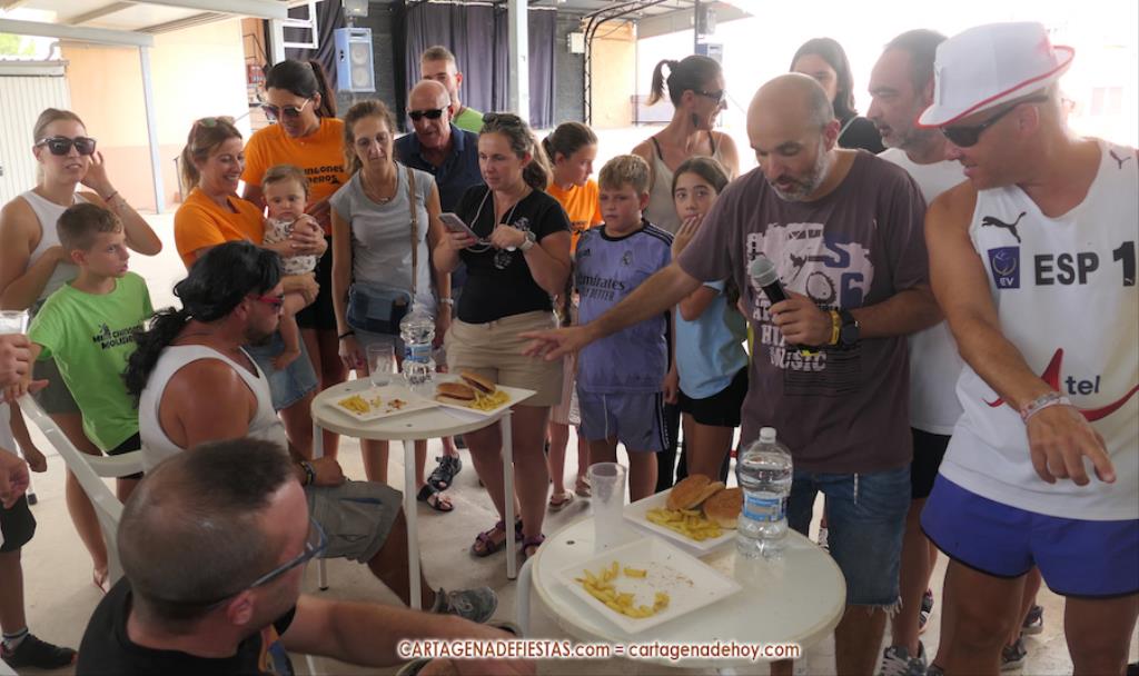 El reto es quien come más hamburguesas que se anuncian que son de 'padrón, porque unas picas y otras no', pero en las que en realidad el picante es para todas. Tres, dos, uno... ¡A comer! Son siete aspirantes, pero algunos se encuentran que la empresa es más complicada de lo que pensaban y apenas avanzan, mientras que hay tres concursantes en un lateral que van muy bien y que terminan siendo los mejores comilones, resolviendo el orden las patatas que han dejado en sus respectivos platos. Damián y Chanete, quienes son compañeros en la peña 'Los chingones molineros', han quedado empatados y comparten los dos primeros premios, que son 50 euros en consumisiones para el vencedor y 30 euros para el subcampeón, además de sendas medallas. Tercero ha sido Juan, de 'Los molineros', quien se marcó un ritmo propio de principio a fin y, aunque parecía que los dos primeros le superaban con cierta claridad, lo cierto es que al final no era así. Se llevó 20 euros en consumisiones durante las fiestas y medalla de bronce.