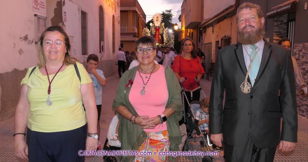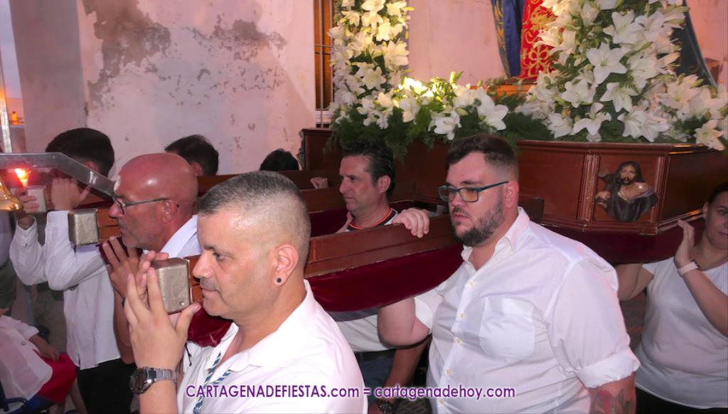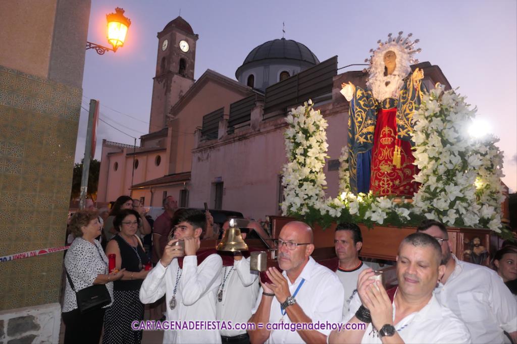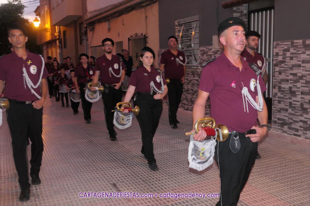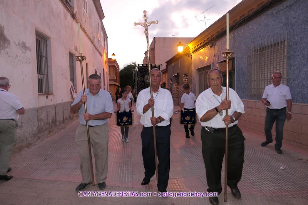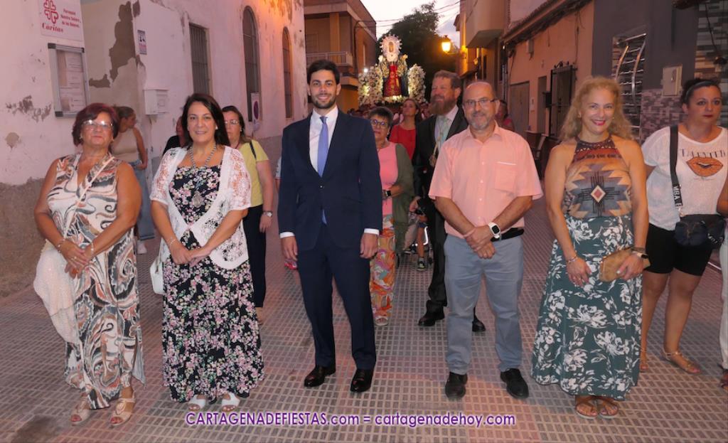 Pasadas las ocho de la tarde, y tras una jubilosa salida de su templo, el cortejo se puso en marcha por las calles del entorno de la vía principal del barrio, formando parte de la comitiva el párroco, Antonio José Palazón; los hermanos mayores de las hermandades de la Virgen de los Dolores, del Cristo de la Salud y de los romeros de San Ginés de la Jara, respectivamente, Salvador Vázquez, Ángel Valverde y Andrés García; el concejal de Cultura, Nacho Jáudenes; la presidenta de la Junta Vecinal Municipal, Julia Otón; el presidente de la Asociación de Vecinos de Los Dolores, Ángel Mario Ros; y la presidenta de Mujeres Cartagonova, Adela Gutiérrez, entre otros, siendo la banda de tambores y cornetas de Fuente de Cubas la que puso la música procesionista durante la marcha.