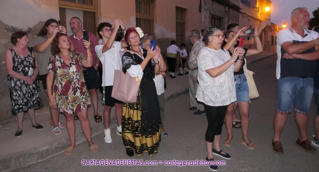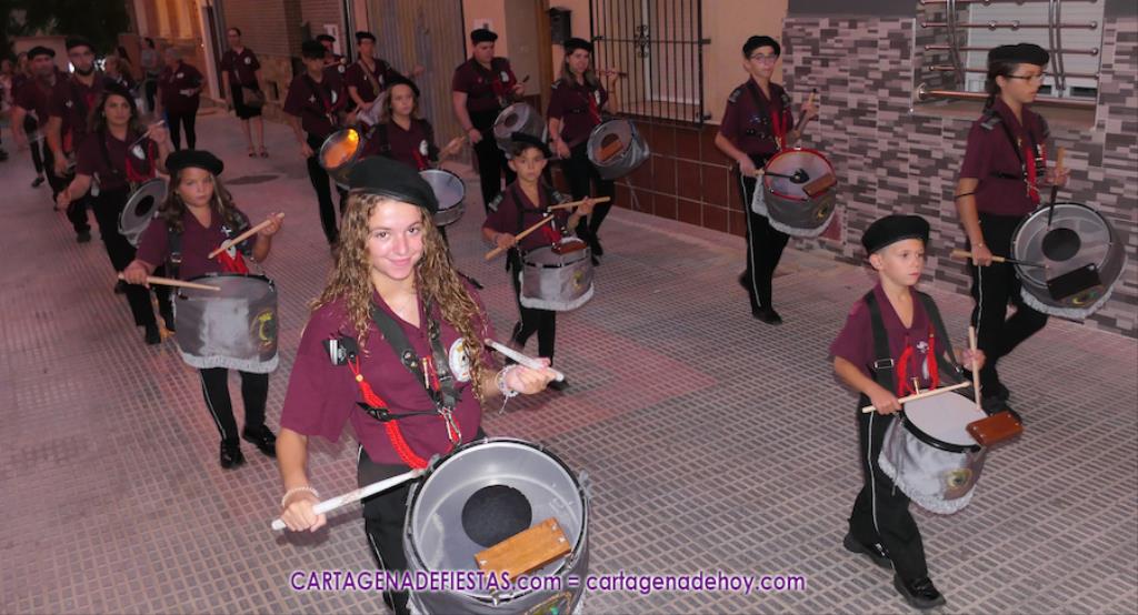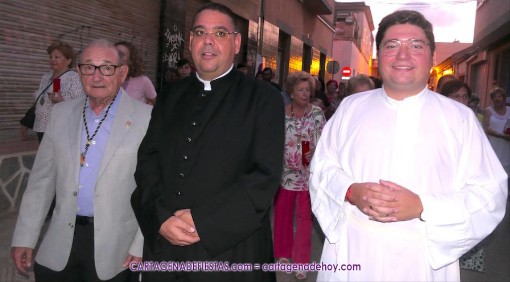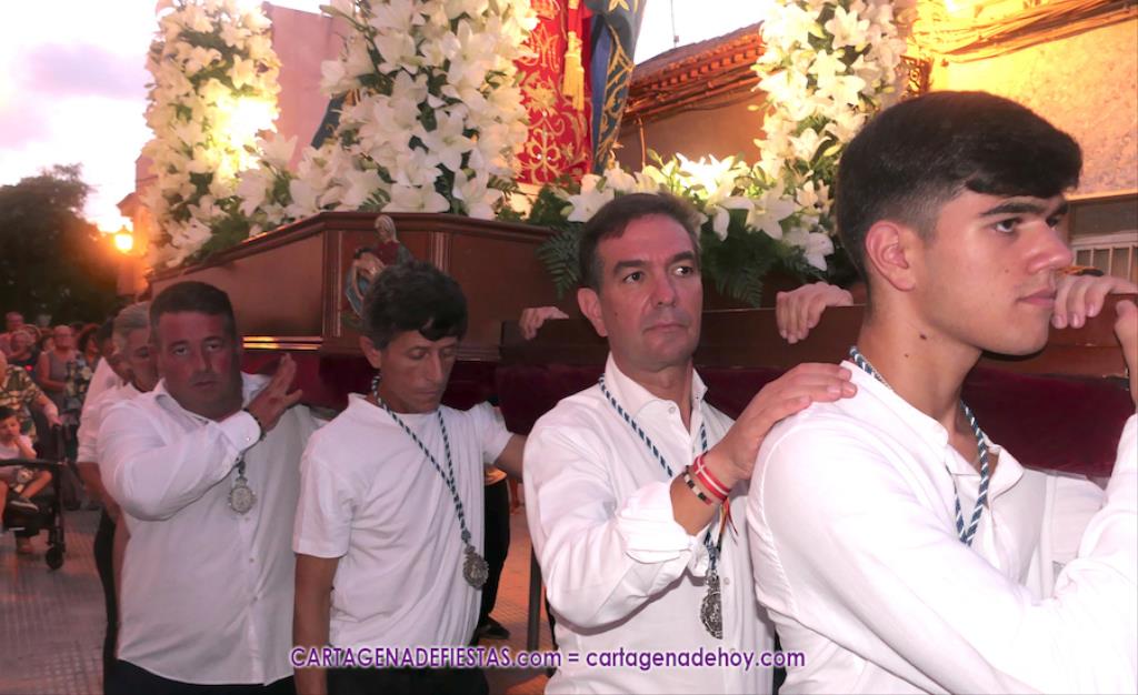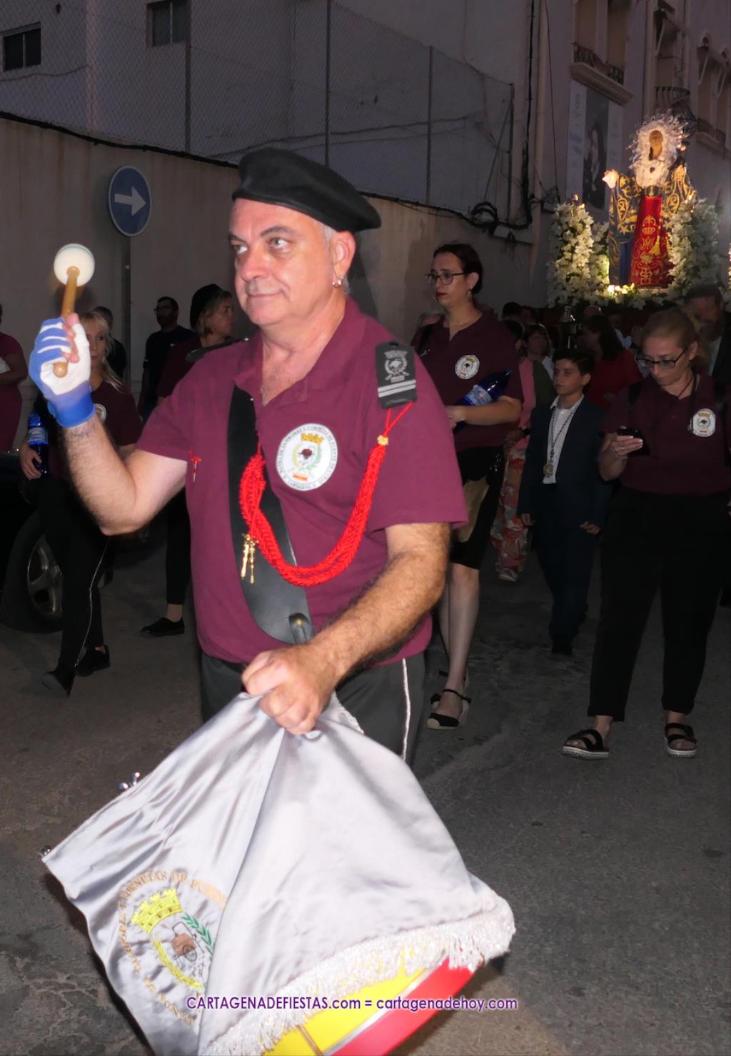 Pasadas las ocho de la tarde, y tras una jubilosa salida de su templo, el cortejo se puso en marcha por las calles del entorno de la vía principal del barrio, formando parte de la comitiva el párroco, Antonio José Palazón; los hermanos mayores de las hermandades de la Virgen de los Dolores, del Cristo de la Salud y de los romeros de San Ginés de la Jara, respectivamente, Salvador Vázquez, Ángel Valverde y Andrés García; el concejal de Cultura, Nacho Jáudenes; la presidenta de la Junta Vecinal Municipal, Julia Otón; el presidente de la Asociación de Vecinos de Los Dolores, Ángel Mario Ros; y la presidenta de Mujeres Cartagonova, Adela Gutiérrez, entre otros, siendo la banda de tambores y cornetas de Fuente de Cubas la que puso la música procesionista durante la marcha.