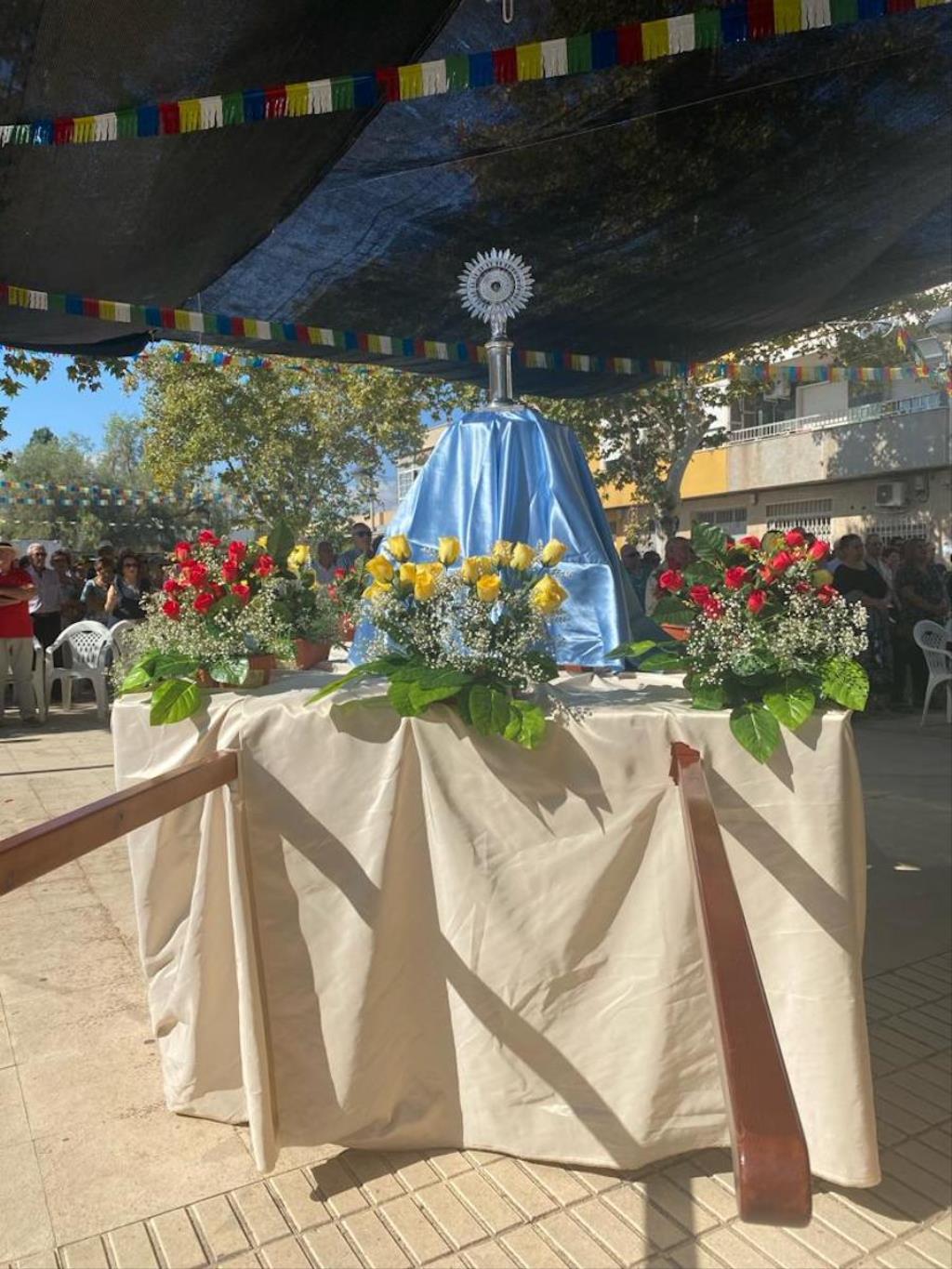 La pequeña talla de la también patrona de España salió a hombros sobre su peana desde la iglesia salesiana, recorriendo varias calles hasta llegar a la plaza de María Auxiliadora, recinto de las fiestas, donde fue izada por sus costaleros, para después celebrarse una misa oficiada por el párroco, José Sorando Sanz, la cual estuvo enriquecido por las voces y música del grupo rociero ‘Reina de las marismas’.