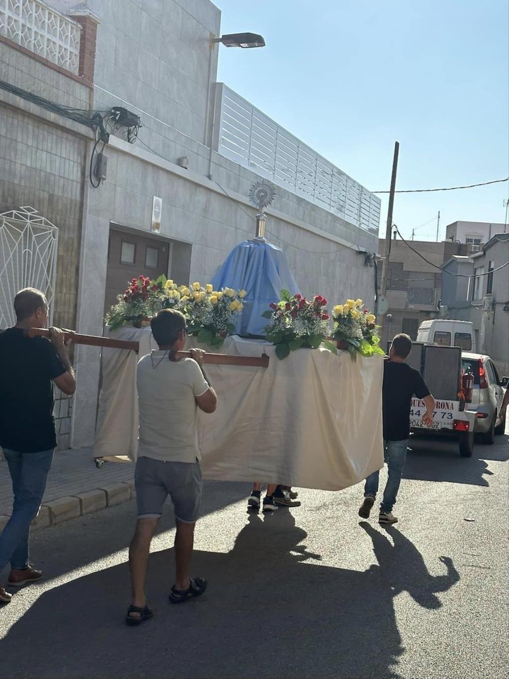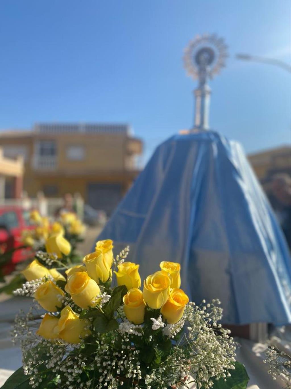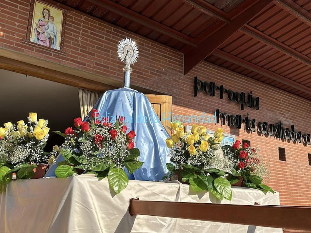 La Barriada de Hispanoamérica tiene ya dos procesiones anuales. Una es en mayo con el tradicional ‘paseo’ de María Auxiliadora. Otra es con la Virgen del Pilar, que tuvo su primera salida el pasado año y que con la ha protagonizado esta mañana comienza a echar raíces como patrona del 12 de octubre, ‘Día de la Hispanidad’, fecha en torno a la que cada año celebra sus festejos la Barriada de Hispanoamérica.