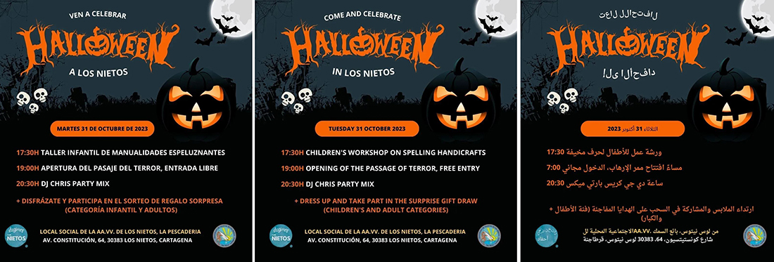 La asociación de vecinos elabora carteles en español, inglés y árabe su programa de actividades para este martes por la tarde-noche, donde habrá un taller de manualidades, un pasaje del terror gratuito y la música con DJ Chriss Party Mix, además de regalos para los que vayan disfrazados. Tendrá lugar en el local social de la plaza de La Pescadería.