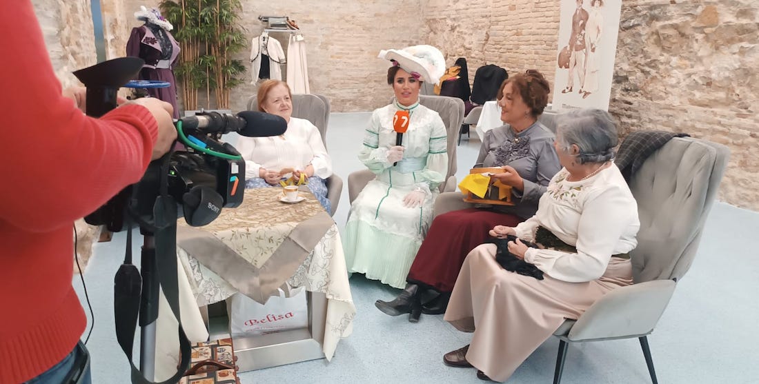 La foto y vídeo adjuntos muestra a tres integrantes de la asociación cultural Modernistas de Levante de Cartagena siendo entrevistas por Nazaret Navarro, quien aparece también vestida de época, al igual que sucedió con la presentadora de 'Ailoviu' cuando hace unas fechas estuvieron en el programa los cartageneros:
