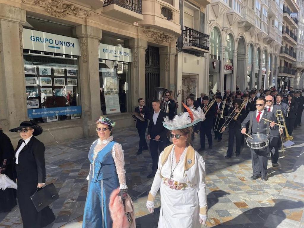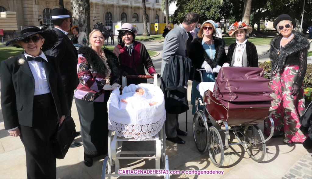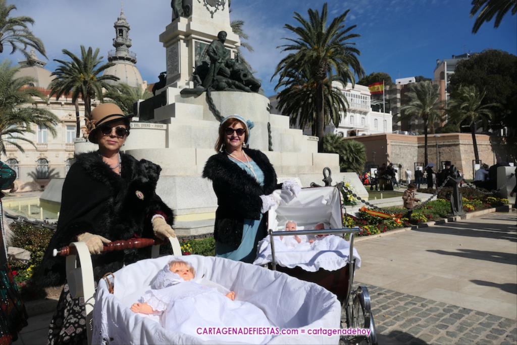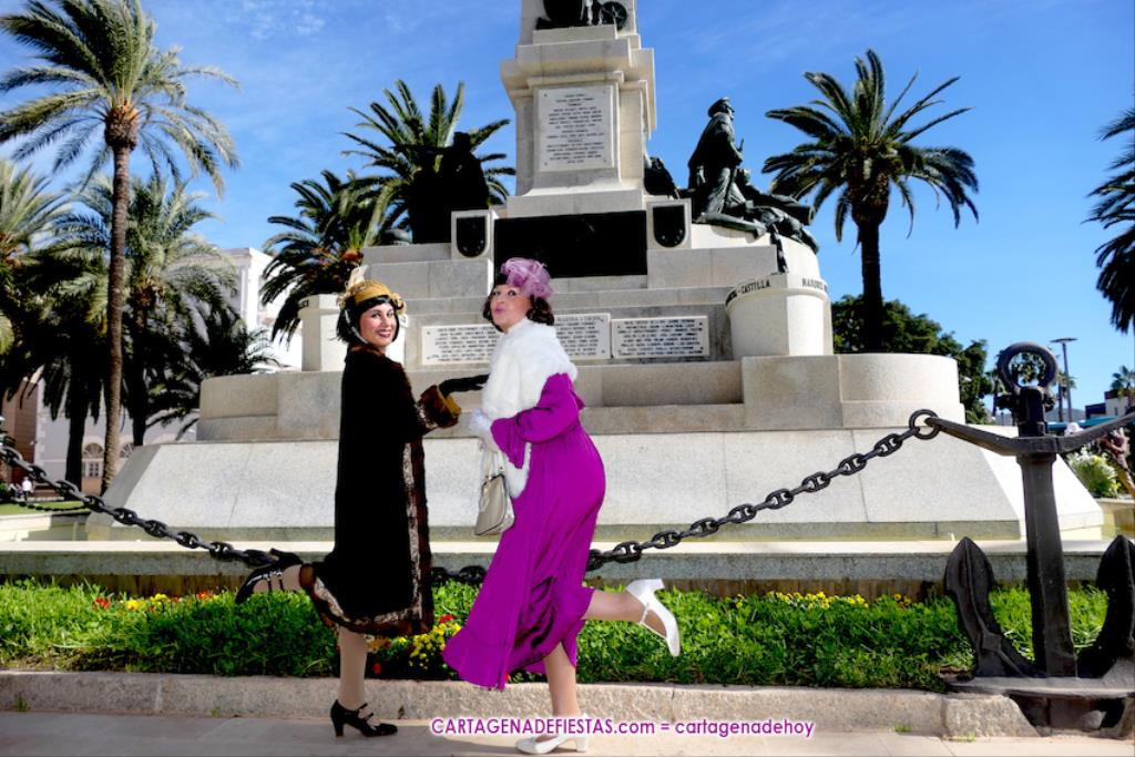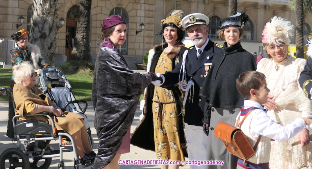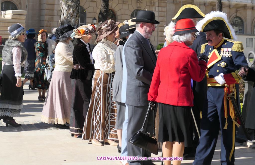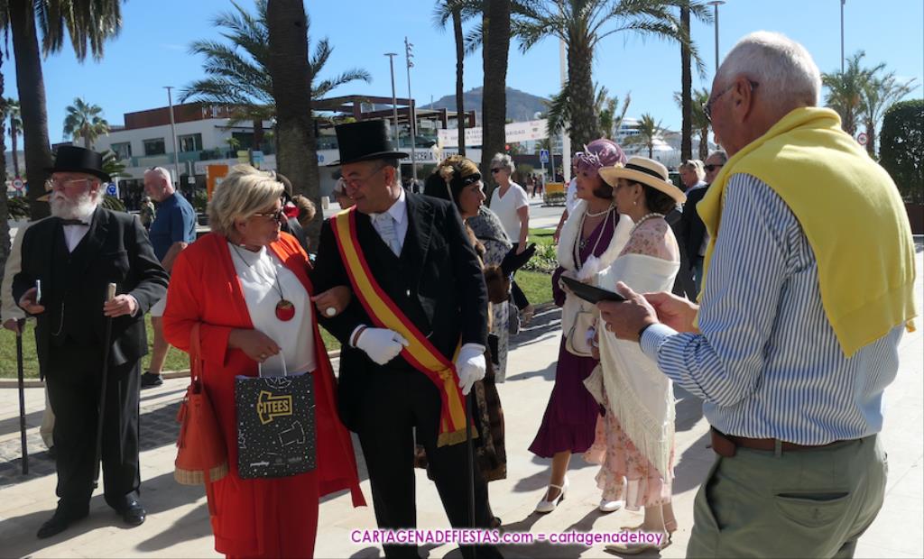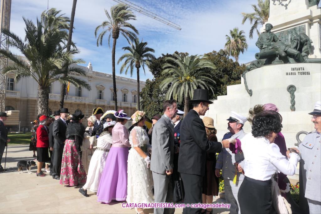 Antes de que ver la figura del monarca otra vez junto al monumento, la jornada organizada por los modernistas cartageneros acogió un pasacalles desde la sede de Hidrogea, en la calle del Carmen, con decenas de personas vestidas de época, pues a los cartageneros se unieron otros recreadores venidos de fuera de la ciudad, siendo especialmente numeroso el colectivo de Novelda y destacando, incluso, la presencia de una bilbaína de nombre Belle Djamila.