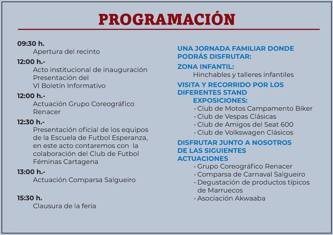 En la Feria de Asociaciones y Colectivos de la Barriada Virgen de la Caridad se desarrollaron actividades para todos los públicos. Los colectivos instalaron estands para informar sobre las actividades que se realizan en el barrio. Esta iniciativa ya consolidada desde hace varios años, nació con la idea de dar a conocer todos los recursos existentes en la zona; y que los vecinos de la zona pudieran participar y que los no residentes, conocieran el tejido asociativo y actividades organizadas desde en el barrio. Como cada año los vecinos de Las 600 utilizaron la feria para presentar y repartir a todos los asistentes el boletín informativo anual, que recoge las actividades, eventos y noticias relevantes que se han producido en la barriada. En la jornada de ayer, se desarrollaron actividades para toda la familia con hinchables, talleres y juegos infantiles, con expositores de los clubes Motos Campamento Biker, Vespas Clásicas, Amigos del Seat 600, Volkswagen Clásicos. También se llevaran a cabo actuaciones durante la jornada del grupo coreográfico Renacer, la comparsa del Carnaval Salgueiro, actúo la asociación Akwaaba y hubo degustación de productos tradicionales de Marruecos. Esta actividad, incluida en el Plan de Trabajo Comunitario, que se lleva a cabo en Barriada Virgen de la Caridad, a lo lago de todo el año, es una intervención que se planifica y desarrolla por un equipo formado por colectivos, entidades y el Ayuntamiento de Cartagena.