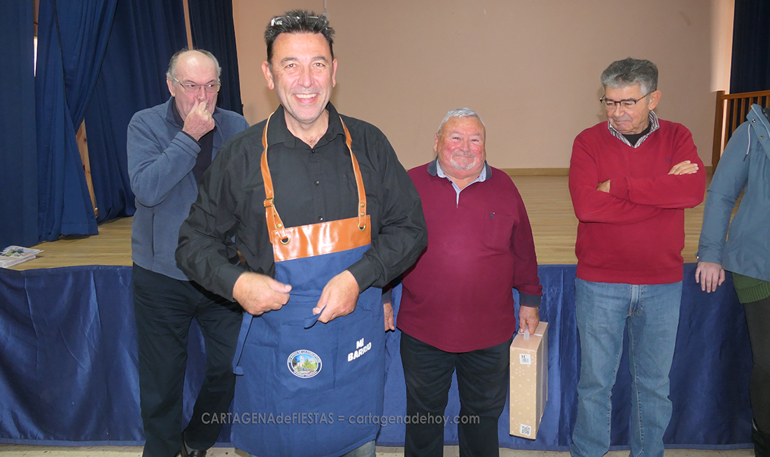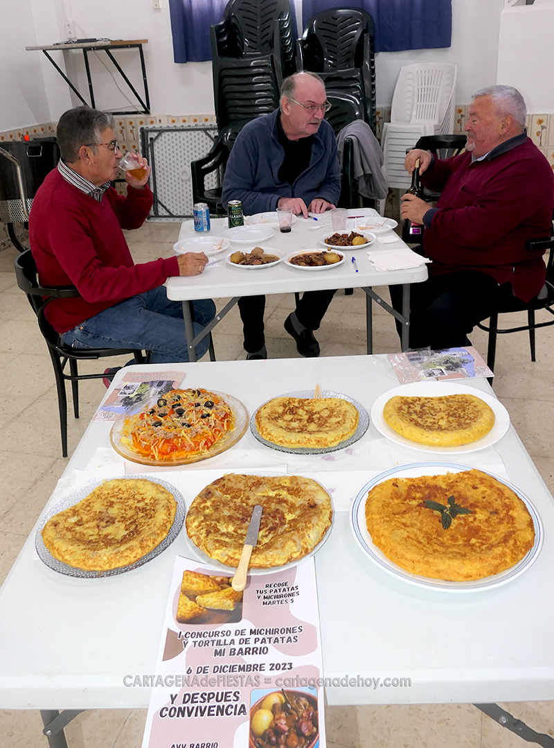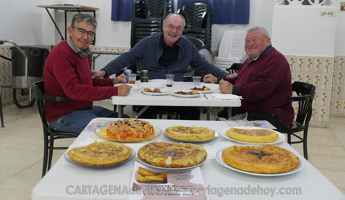 En la foto se observa a Mariano Molina, Jan García y Bartolomé Villalba. Ellos fueron el jurado que tuvo que decidir los vencedores del certamen. En el apartado de los michirones triunfó la olla elaborada por Encarna Ruiz Pastor, quien no pudo acudir por enfermedad, siendo su hija Sonia quien recogió este primer premio, al igual que el segundo en tortillas. Por su parte, María López Larios fue la elegida para el premio de mejor tortilla, mientras que el segundo puesto de michirones se lo llevó Miguel, quien estrenó el nuevo mandil creado por la asociación de vecinos para esta ocasión.