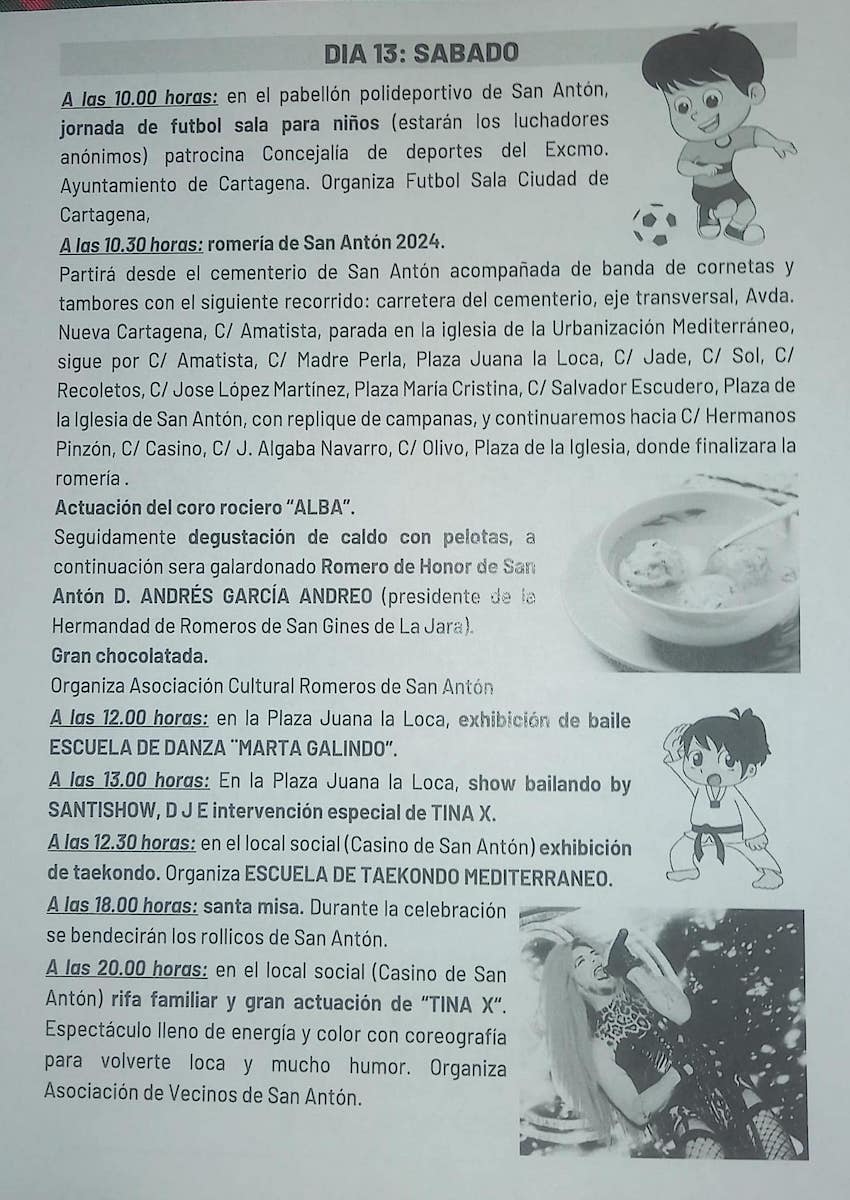El “día grande” será el miércoles 17, festividad del santo que da nombre al barrio. La programación comenzará a las 8:00 horas, con una diana floreada a cargo de la Banda de Música ‘Cartagena 1990’. A las 9:00 horas, habrá un volteo de campanas y cohetes, y a las 11:00 horas se celebrará la misa en honor de San Antón. Tras finalizar esta, a las 12:00 horas llegará uno de los momentos más esperados, la bendición de animales en la Plaza de la Iglesia. A las 18:00 horas será el turno de la procesión por las calles del barrio, seguida de una misa a las 19:00 horas y un gran baile amenizado por ‘Dúo Nerea’. Las celebraciones del día del patrón las cerrará un gran castillo de fuegos artificiales.Antes, este sábado, día 13, se llevará a cabo la gran romería del santo. Comenzará a las 10:30 en el Cementerio Municipal de San Antonio Abad y pasará por la Urbanización Mediterráneo antes de adentrarse en su barrio, finalizando en la Parroquia de San Antonio Abad.