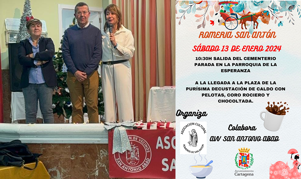 El barrio cartagenero de San Antón ya está inmerso en sus tradicionales fiestas patronales. El pasado sábado, 6 enero, se dio el pistoletazo de salida con el pregón, que corrió a cargo de la edil de Política Social, Igualdad y Familia, Cristina Mora. Las actividades principales serán la romería de este sábado, día 13; y la bendición de animales, el miércoles, día 17. Los festejos comenzaron el sábado con un gran baile celebrado en el Casino de San Antón, en la que se entregó el reconocimiento de ‘sanantonero del año’ a José Fernández Martínez, y en la que la concejal Cristina Mora dio su pregón.