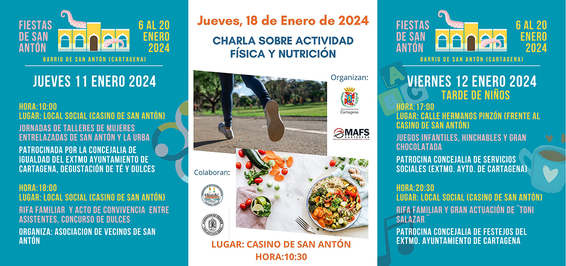 Muchos de los actos de estos festejos cuentan con el patrocinio del Área de Festejos del Ayuntamiento de Cartagena. Las actividades se completan con espectáculos y actividades que se llevarán a cabo en el Casino de San Antón y en la Plaza Juana la Loca.