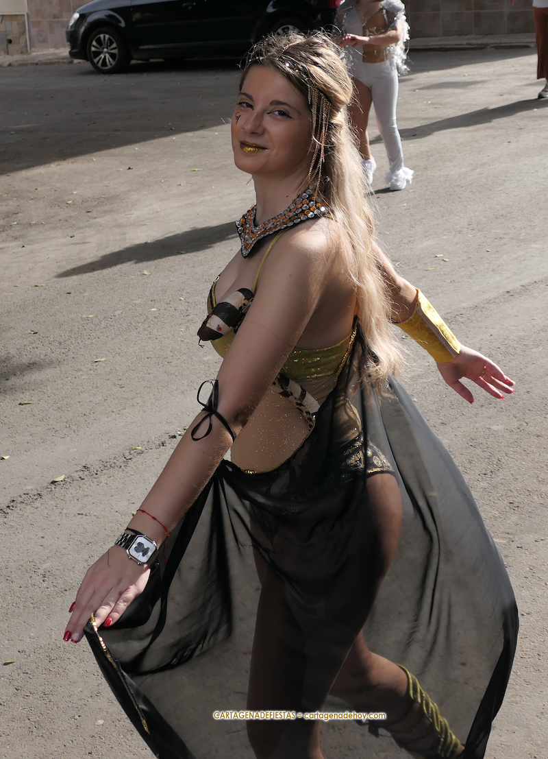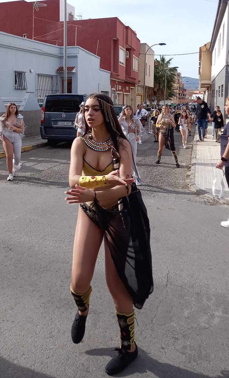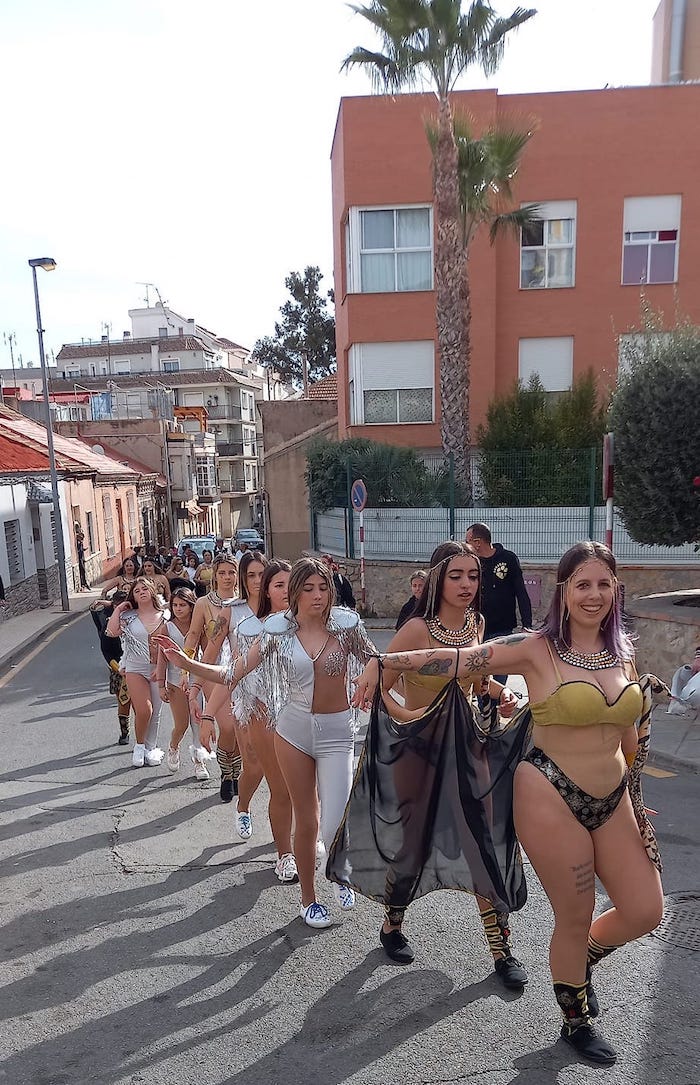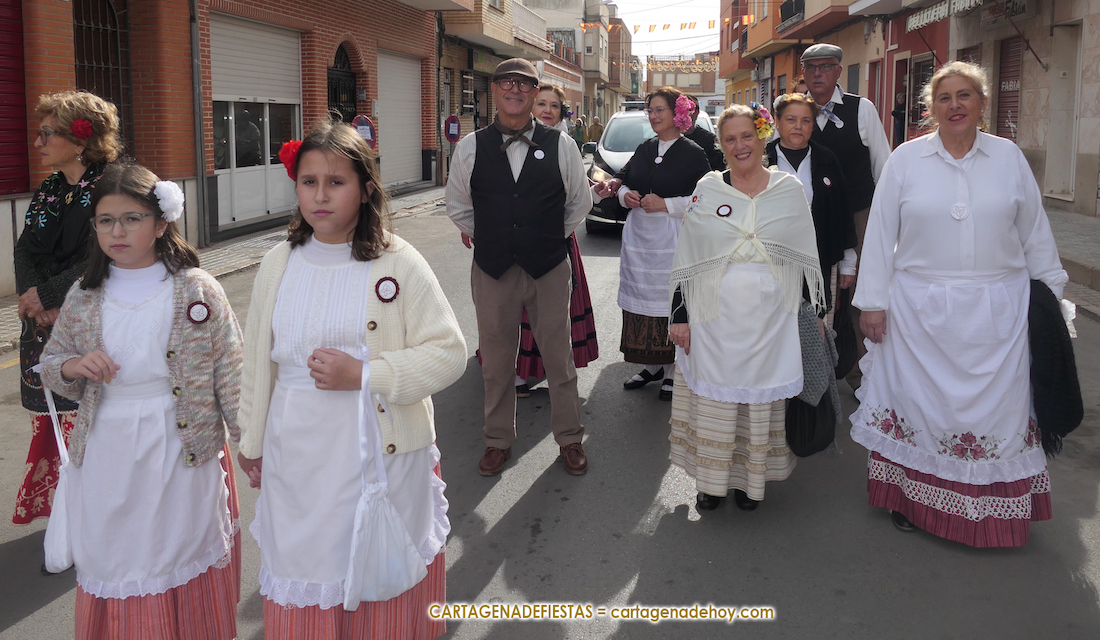 La comparsa 'Las villas de San Antón', con sus alegres vestuarios, y la asociación de mujeres 'Carmesí', con los trajes modernistas, recorren las calles más castizas del barrio en una soleada mañana.