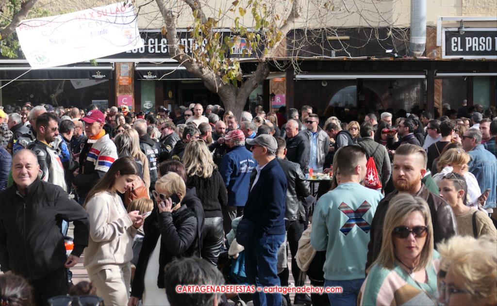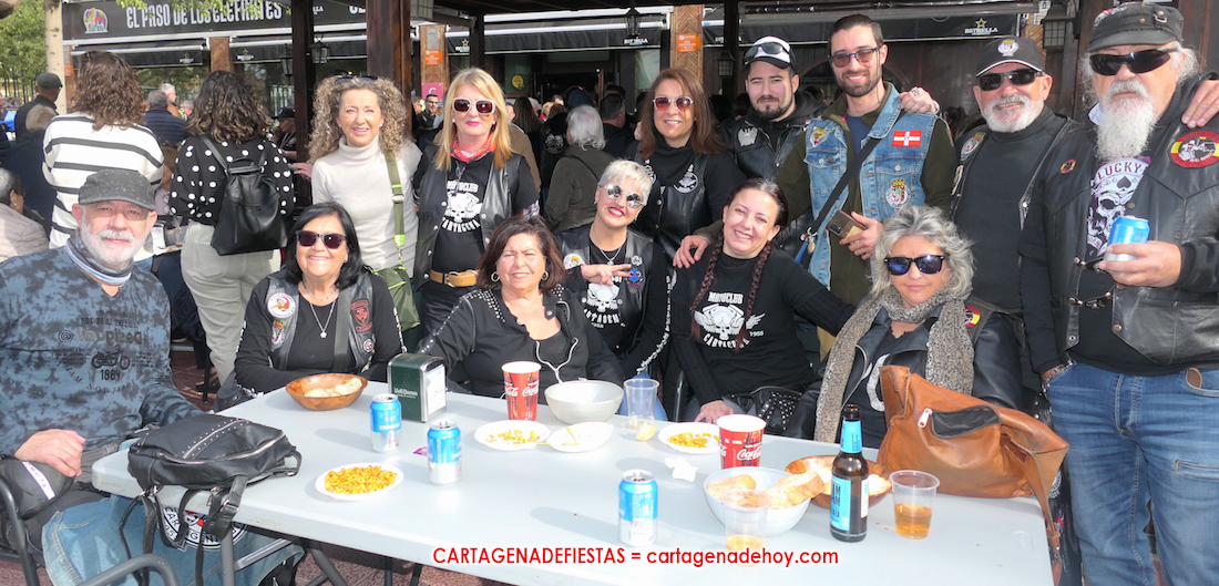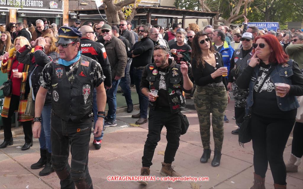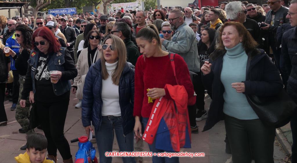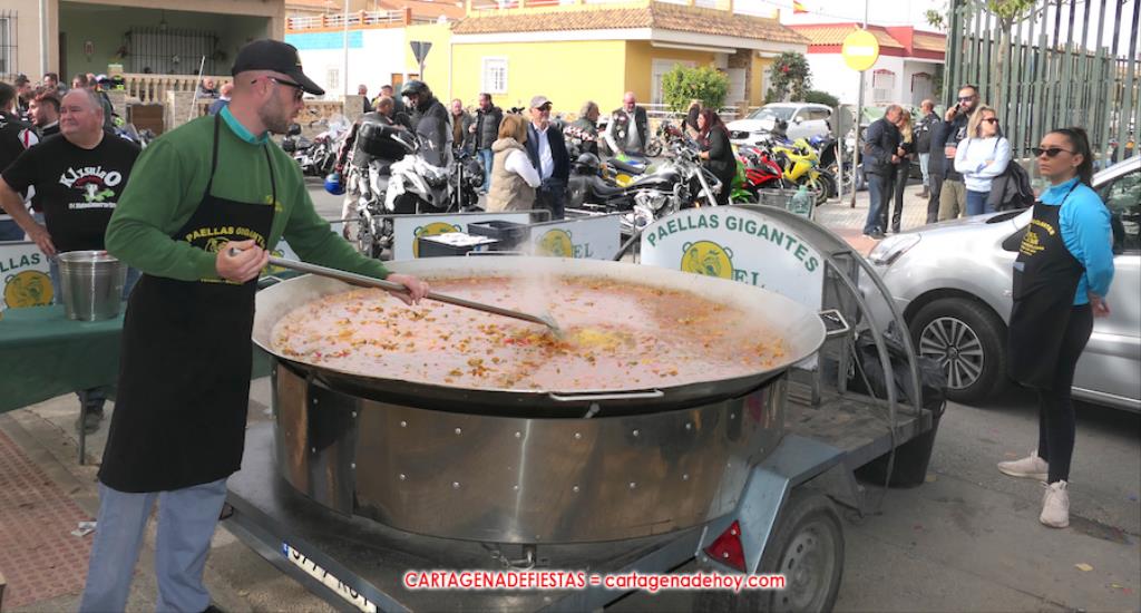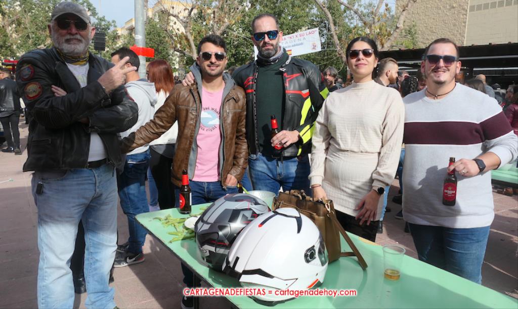 Cientos motos han confluido en San Antón en el regreso, después de varios años, del motoalmuerzo de la peña 'K1 X su lao', que ha contado con alicientes paralelos gastronómicos además de un payaso, exhibición de trialbici, sorteos y cuatro horas de actuación de 'Kar-P-Diem', a lo que se suma una multitudinaria ruta motera que ah 'petado' las calles de la ciudad de Cartagena por las que ha pasado.
