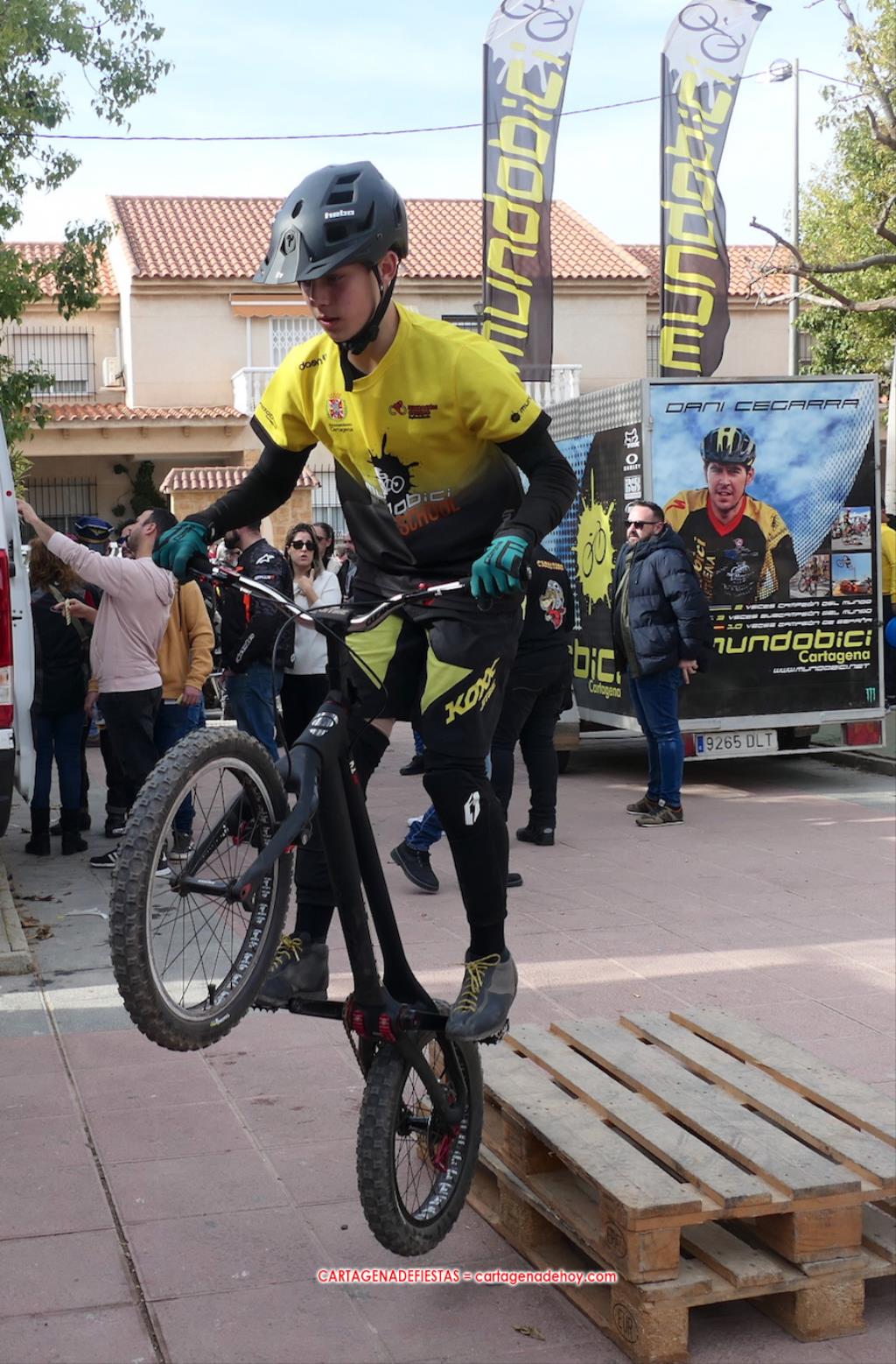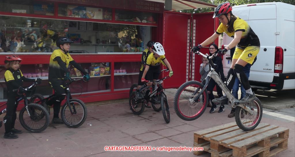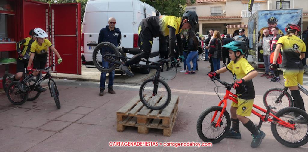 En la plaza, todo perfectamente organizado, incluido los muy visibles carteles indicando donde estaban los cubos de basura, los aseos portátiles y las zonas de barras y compra de tickets, además de un mercadillo y una zona habilitada para la exhibición de la escuela de trialbici que dirige Dani Cegarra (padre), quien fue varias veces campeón del mundo. A escasos metros, un payaso (con mascarilla) regalaba globos a los más pequeños delante de un panel donde se exhibían los carteles oficiales de las ediciones anteriores de este motoalmuerzo.