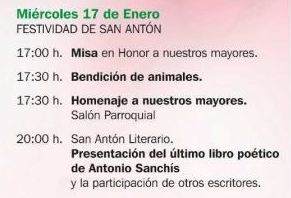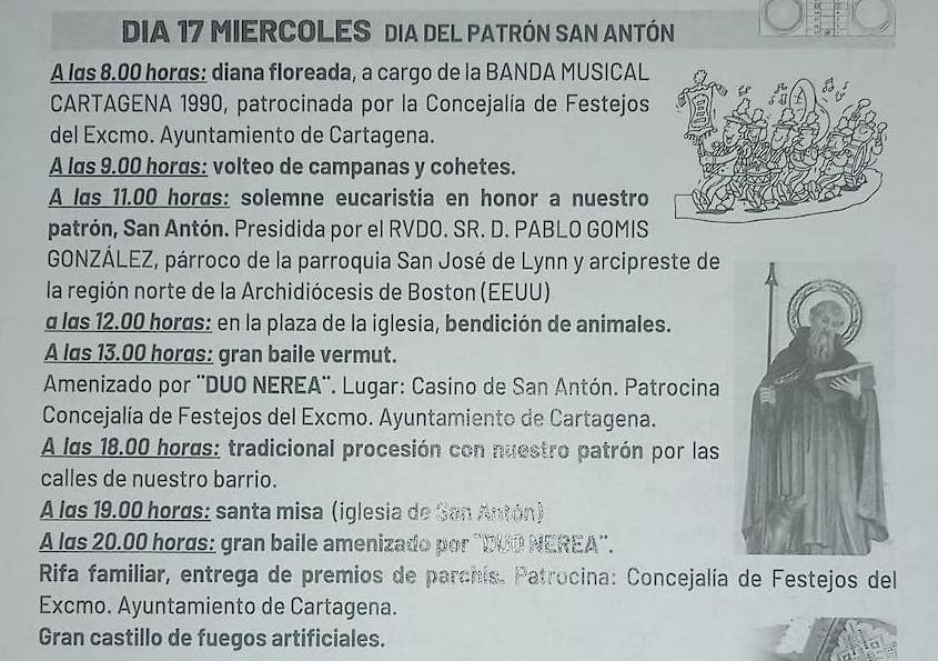 A las 12 horas tendrá lugar el popular acto de bendición a los animales ante la fachada de la iglesia de San Antonio Abad, patrón de la villa cartagenera y de los animales. No es el único lugar de nuestro municipio donde se celebra, pues también tendrá lugar en Pozo Estrecho a las 17.30 horas (foto adjunta del pasado año) y en la iglesia de la Virgen de los Llanos de El Algar (18 horas). Por cierto, en el barrio sanantonero también es noticia que hoy regresa el sorteo de un cerdo después de varios años.