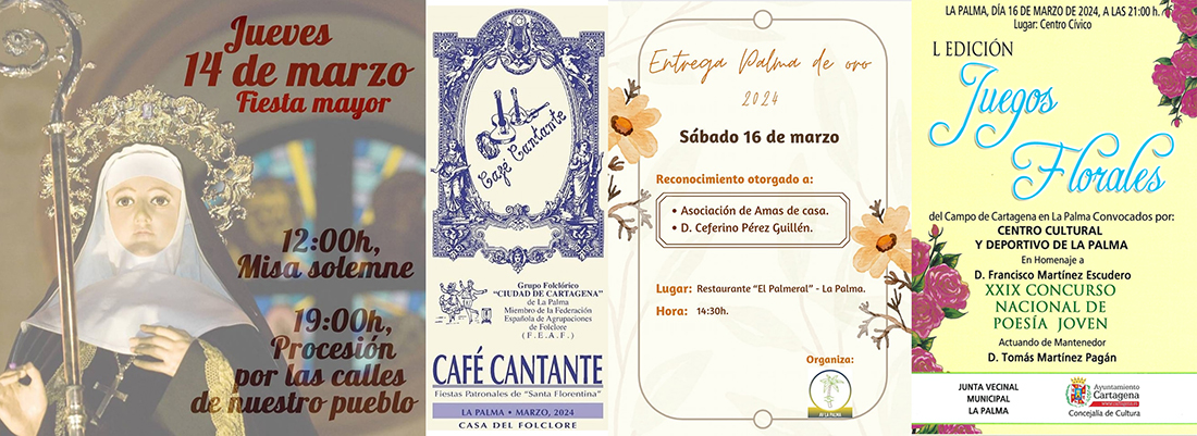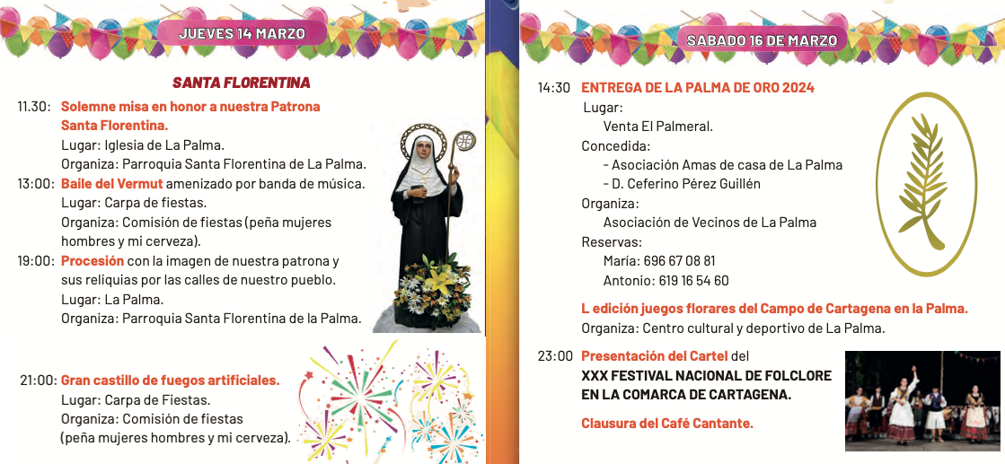 La fiestas patronales tienen un intenso programa del 14 de marzo con misa en honor a Santa Florentina a las 11.30 horas y procesión a las siete de la tarde, completando el día el baile del vermú, la inauguración de la reforma de la plaza Manuel Zamora y el castillo de fuegos artificiales. El día 16 culminan los festejos con los 'Juegos florales' (en homenaje a Francisco Martínez Escudero), cierre del Café Cantante con Pedro Guerra y presentación del cartel del 'XXX festival nacional del folclore' de julio y la entrega de 'La palma de oro', que concede la asociación de vecinos, al colectivo de amas de casa y a Ceferino Pérez Guillén.