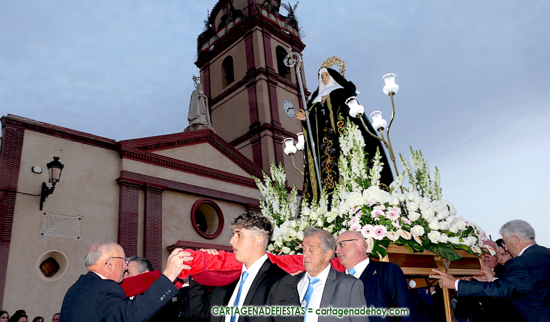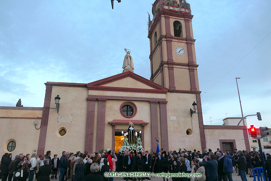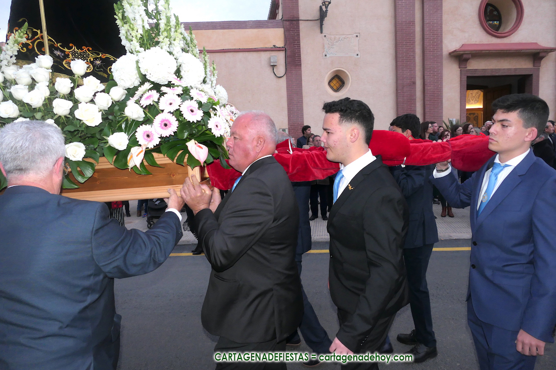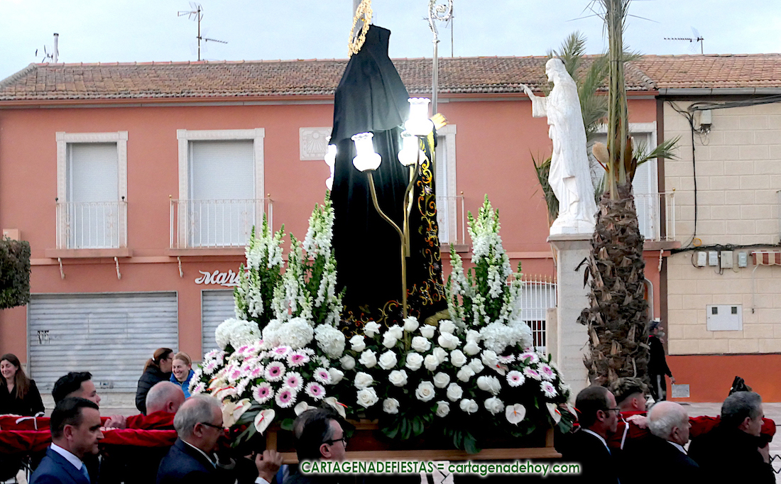 Dos hileras de mujeres con vestuario negro (algunas con peineta) abre el cortejo detrás de la cruz. A continuación, el trono, al que suceden el párroco, Daniel Díaz Candel; la corte de honor de las fiestas patronales, y, entre otros, los ediles Álvaro Valdés, Pablo Braquehais y Diego Lorente del equipo de gobierno PP-Vox y Toñi Pérez de MC, además de Juan Pedro Torralba y Fulgencio Garrido, de Sí Cartagena. El otro acompañante fue un inesperado viento frío que obligó a todos los participantes a acudir con ropas de abrigo.