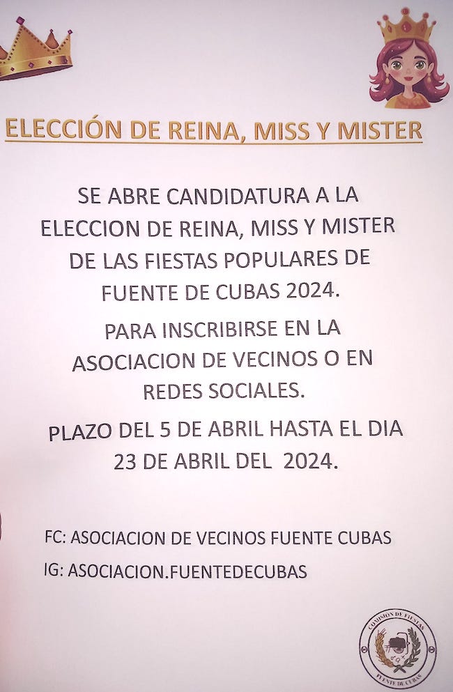 La asociación de vecinos abre el plazo para que se presenten los aspirantes a reina, miss y míster de las fiestas populares que se celebrarán en mayo coincidiendo con las 'Cruces de mayo', estando el recinto ferial en la plaza de Madrid. El plazo acaba el día 23.