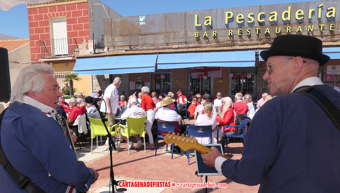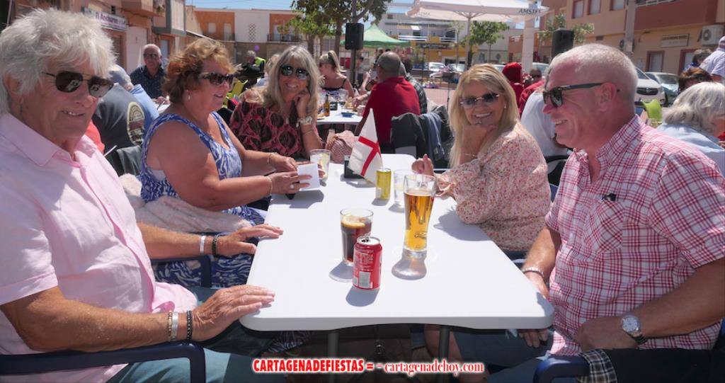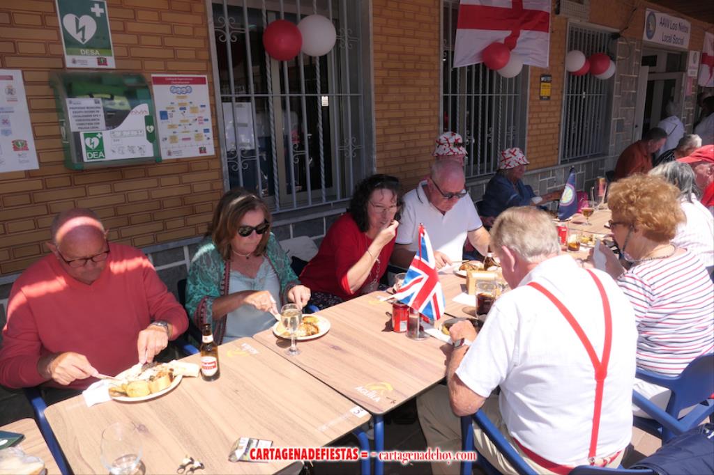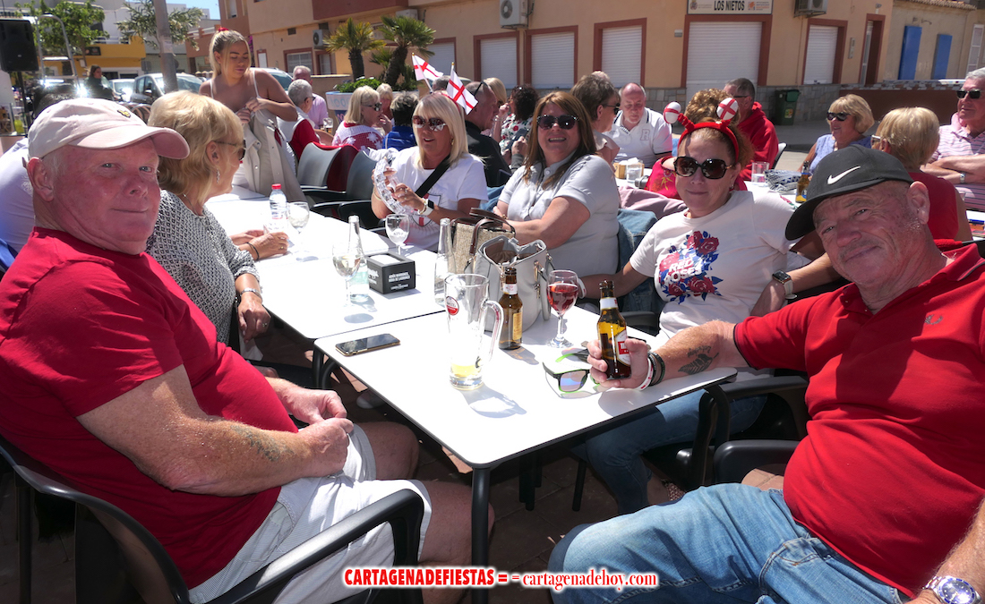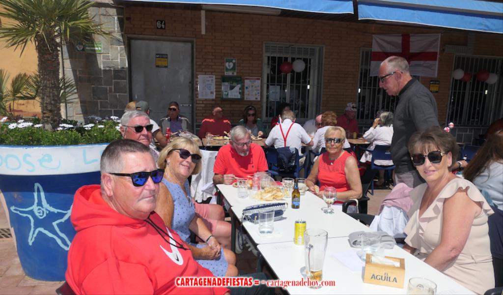 Lo cierto, es que los 138 participantes de la colonia inglesa de la asociación de vecinos disfrutó ese día como 'dragones', pues la convivencia comenzó sobre las dos de la tarde en la terraza de La Pescadería (sede vecinal con local hostelero incluido) para saborear una gran 'pollada', pues multitud de pollos asados protagonizaron el plato principal. Antes de terminar el almuerzo ya estaba tocando el dúo 'Rick&Rae' con (muy buena) música inglesa de los años sesenta, setenta y ochenta del pasado siglo de grupos como The Beatles, Rolling Stone, CCR, Cliff Richard, The Eagles, Status Quo, Rod Stewart, etc. Pasadas las diez de la noche acabó la jornada que ya se ha convertido en una tradición en este castizo pueblo cartagenero de mar.