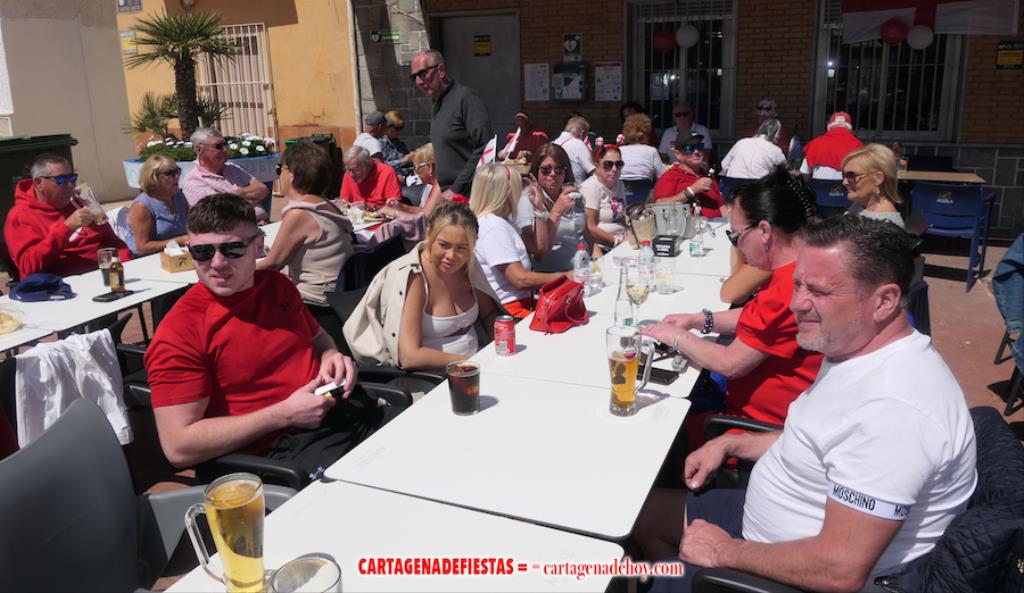 Unos ciento cincuenta británicos, la mayoría con elementos identificativos de la bandera de su país natal, celebraron el día del patrón de Inglaterra en una agradable convivencia que se prolongó unas ocho horas. Forman parte de un colectivo vecinal marmenorense de unos quinientos socios, que reúne a multitud de nacionalidades, por lo que tiene tres grupos de WhatsApp y organiza fiestas multiculturales.