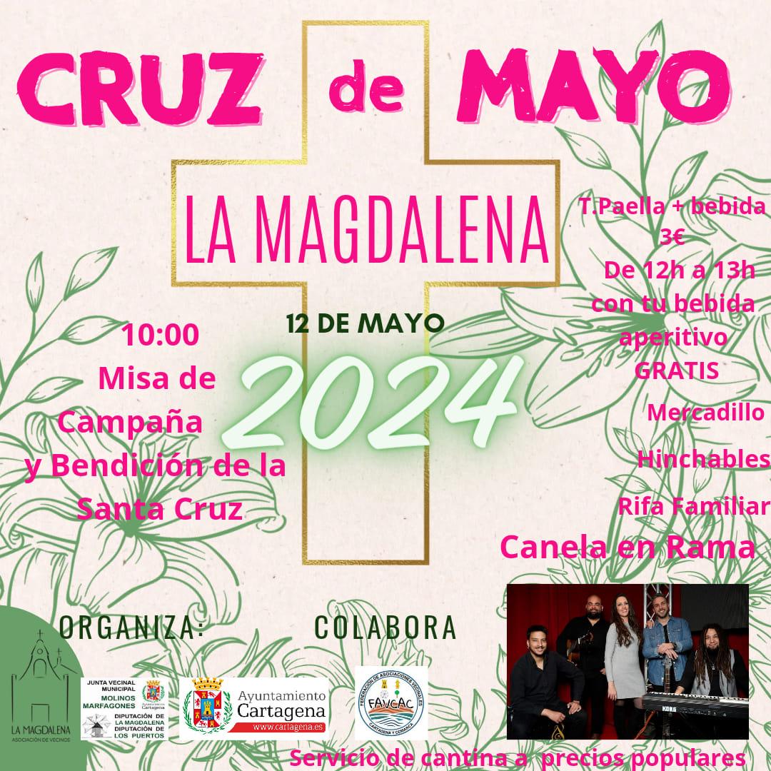 El grupo pondrá la música en directo en la celebración de la ‘Cruz de mayo’ el domingo 12 de mayo en el pueblo del oeste cartagenero, donde se prepara una celebración con misa de campaña con bendición de la floreada cruz junto a la ermita, mercadillo, hinchables, rifa familiar y cantina con aperitivo gratis con la bebida, además de arroz más bebida por tres euros.