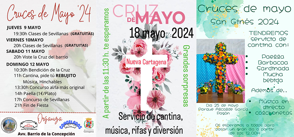 Los Dolores inaugurado su floreada cruz esta tarde (18.30 horas) en la entrada del local social, con posterior actuación de coro rociero. Mientras, se anuncian las que se celebrarán en diferentes fechas de este mes en Barrio de la Concepción, Nueva Cartagena y San Ginés.