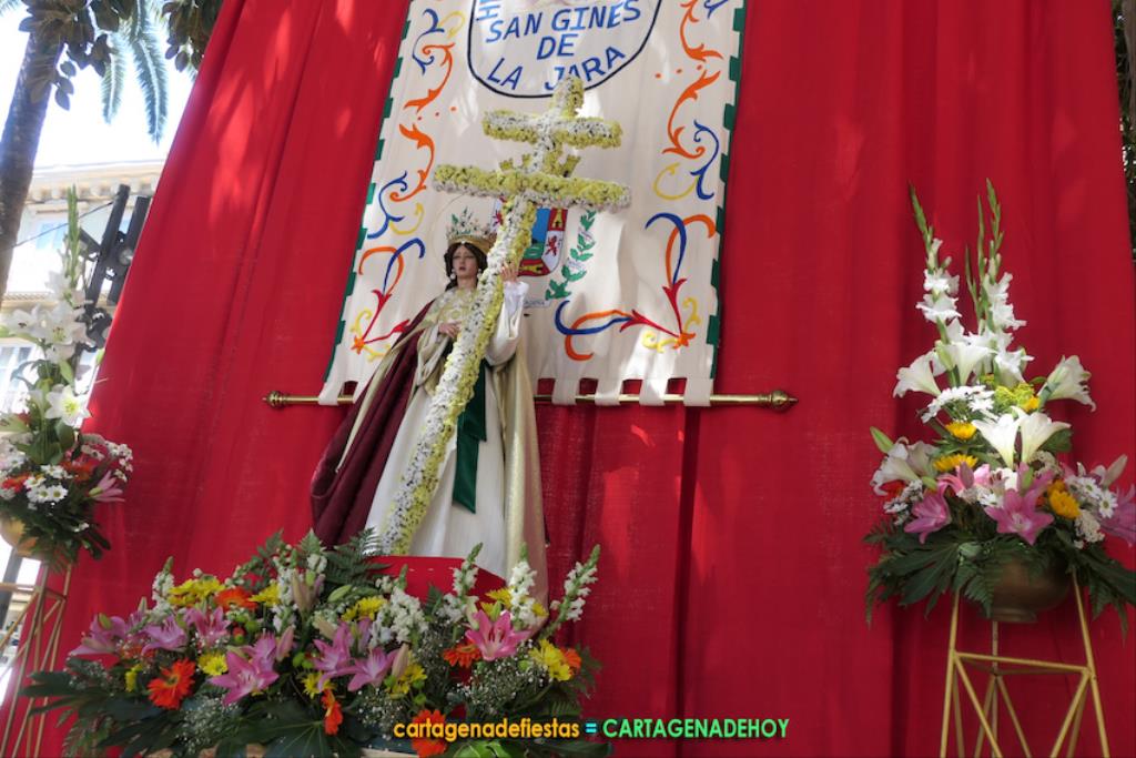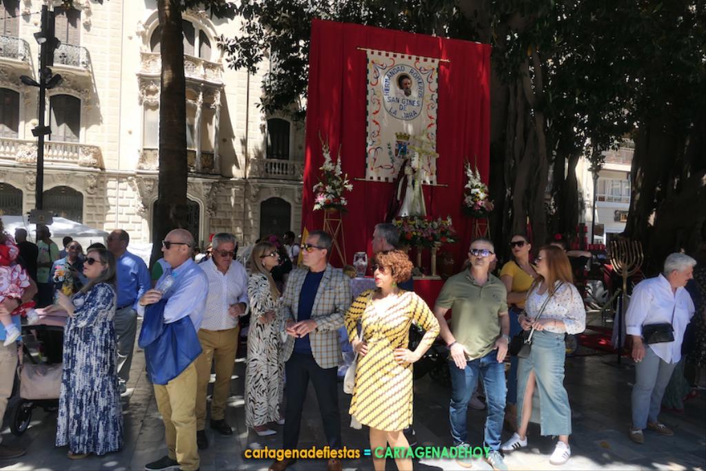 Bajos los ficus de la plaza está la cruz de la Hermandad de Romeros de San Ginés de la Jara, elaborado con flores silvestres amarillas y blancas (colores vaticanos) y que homeanaje a la Cruz de Caravaca (el domingo sacaremos un artículo monográfico), siendo el montaje enriquecido de elementos rurales. También hay una mesa donde se venden desde pulseras bendecidas hasta las dulces 'flores de la Jara'.