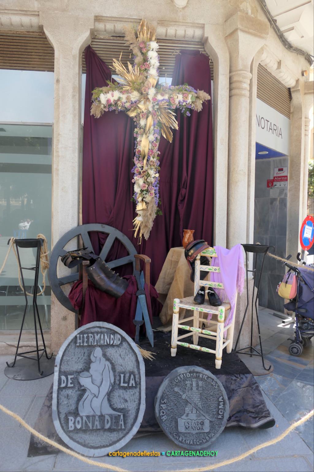 El barrio de San Diego tenía una apuesta doble. Por un lado, con la cruz montada ante la iglesia del Sagrado Corazón (mañana ofrecemos una artículo propio) y con la de la legión de Marte y Minerva, de las fiestas de Carthagineses y Romanos, junto al 'Decumano Maximo', de la que hemos publicado un artículo de su inauguración.