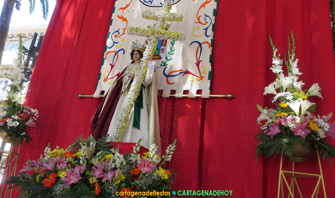 Porta la cruz (formada por flores silvestres) la imagen de la emperatriz Santa Elena de la Cruz, madre de Constantino I, conocida por buscar las reliquias de Jesús. Cuando encontró la vera cruz en el siglo IV, entregó un trozo al patriarca de Jerusalén. En el siglo XIII, el emperador Federico II Hohenstaufen fue a proclamarse rey de Jerusalén, para lo cual puso esa reliquia en su pecho. Sin embargo, debido a su escasa piedad, aparecieron dos ángeles y se la llevaron, apareciendo en Caravaca posteriormente.