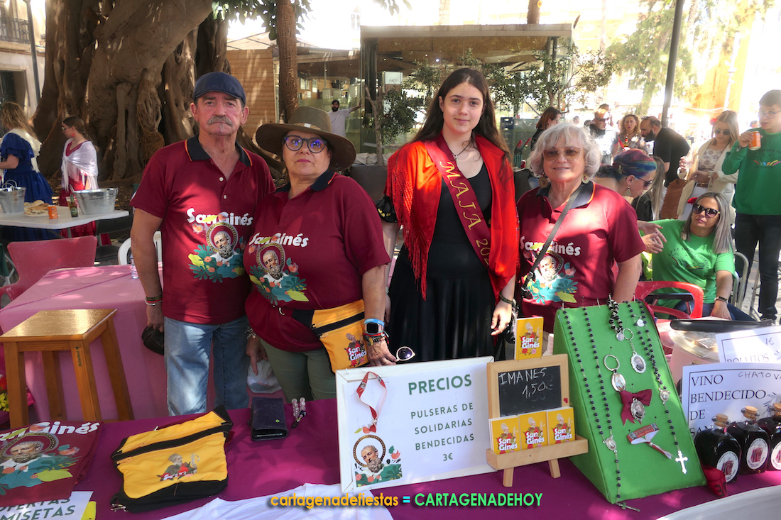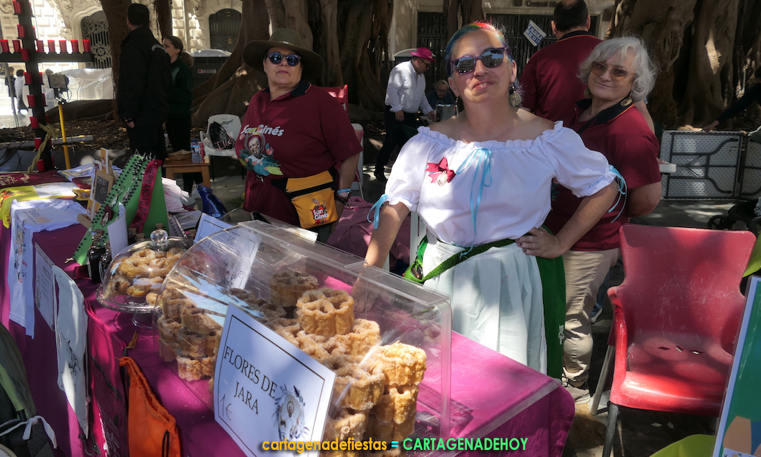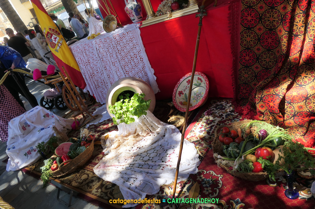 El montaje de los romeros se ubica en la glorieta de San Francisco, siendo enriquecido por elementos rurales, fruta, verdura, una guitarra, mantones, manteles, recipientes de barro, las bandera de Cartagena y de España y, entre otros, por una segunda cruz, ésta sformada con velas. También hay una mesa donde se venden desde pulseras bendecidas hasta las dulces 'flores de la Jara'.