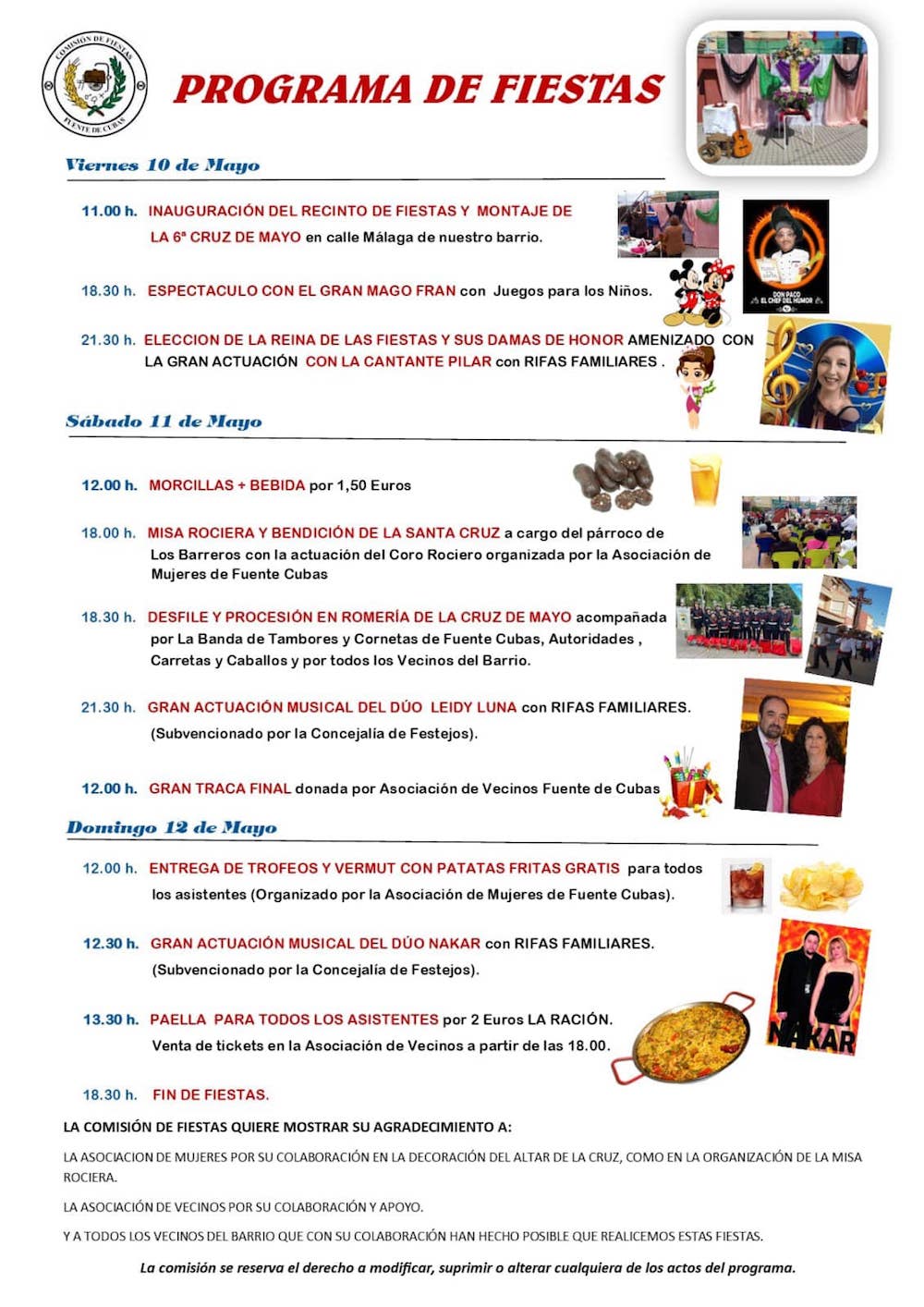 Las tres jornadas festeras arrancaron ayer, pero no en la plaza Madrid, como es habitual, debido a que "no está en condiciones pese a que se avisó con tiempo", indican desde la asociación de vecinos, apuntando que tampoco autorizaron a trasladarlas a una calle. Ayer fue montada en el interior del salón de actos la cruz de mayo, que esta tarde saldrá en procesión por la barriada, dentro de un fin de semana donde dominan los capítulos gastronómico y musical.