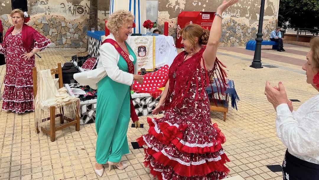 La concejala Paqui Martínez Sotomayor, después de recibir la distinción de la hermandad de romeros de San Antón, se marcó unas sevillanas con una de las integrantes del coro rociero 'Alba'.