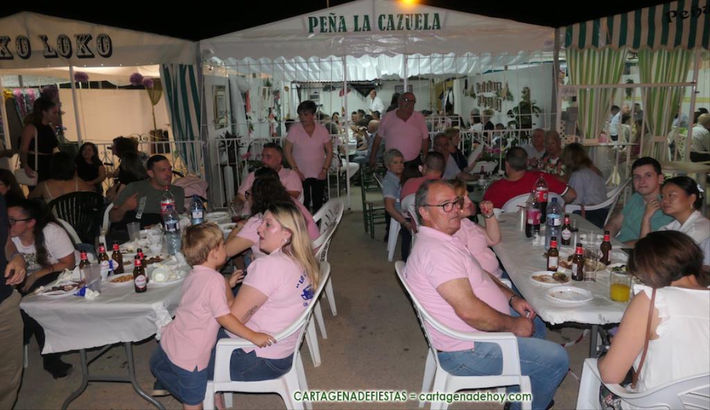 Las sartenadas de migas se despliegan entre las casetas (hay 47 peñas) y en mitad de la amplia calle, pues también se apuntan familias y grupos de amigos a elaborarlas para pasar una amena noche en torno a mesas donde la luce la riqueza gastronómica.