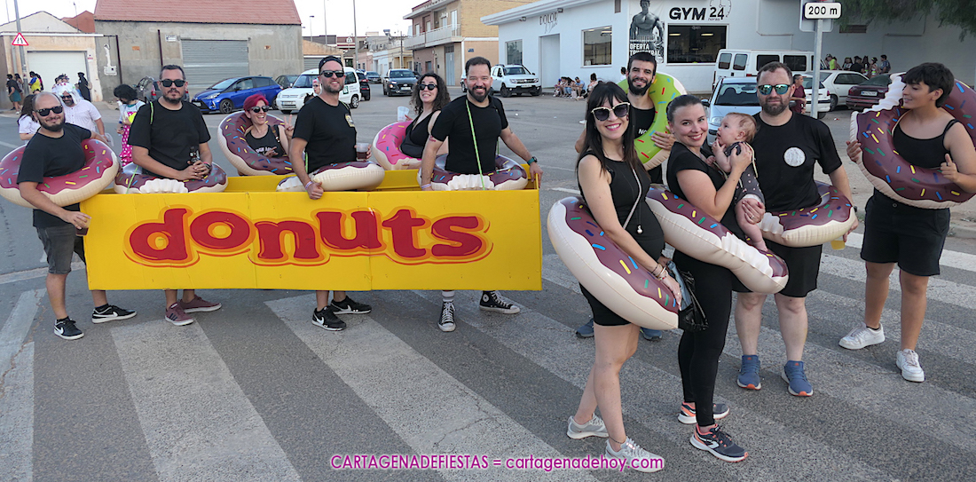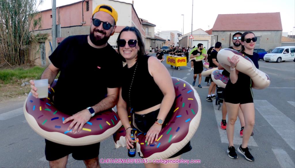 La parte central del desfile ha sido para los grupos que iban a pie, los cuales han mostrado variadas temáticas, desde las fregonas hasta los extraterrestres, pasando por un grupo sanferminero o por los grupos andantes de donuts y de cajitas de música, por citar algunos ejemplos.