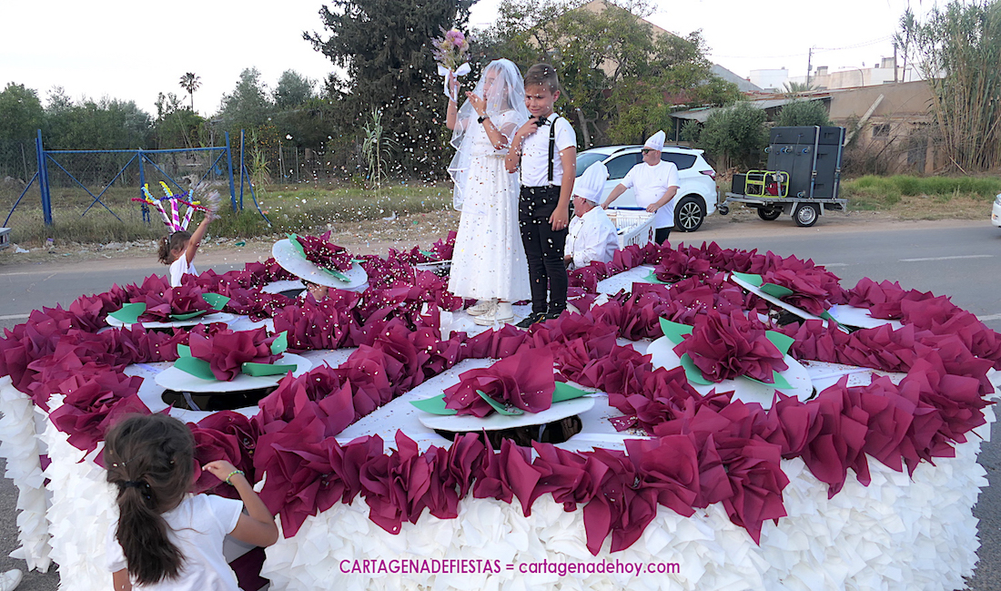 Porciones que se desplazan y que cuando se unen forman el pastel sobre el que se colocan las ‘figuras’ de los novios. La propuesta de la peña 'El límite' ha sido uno de los imaginativos disfraces del desfile de disfraces y carrozas de las primaverales fiestas aljorreñas.