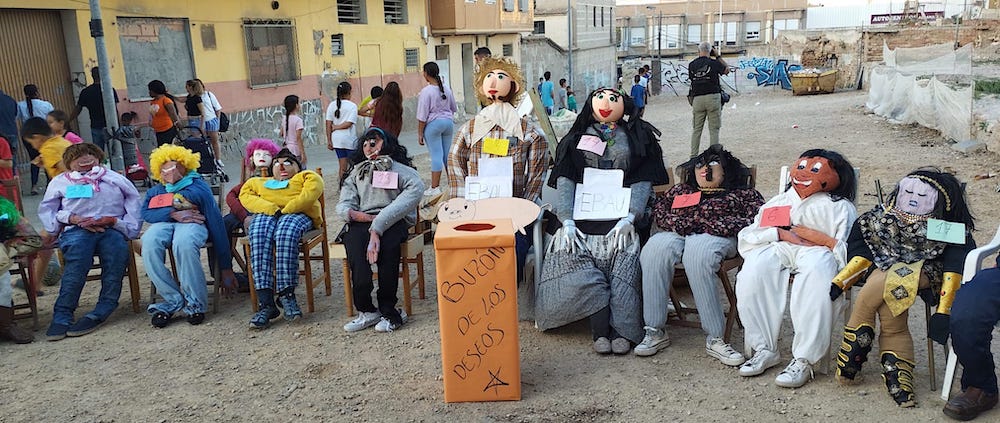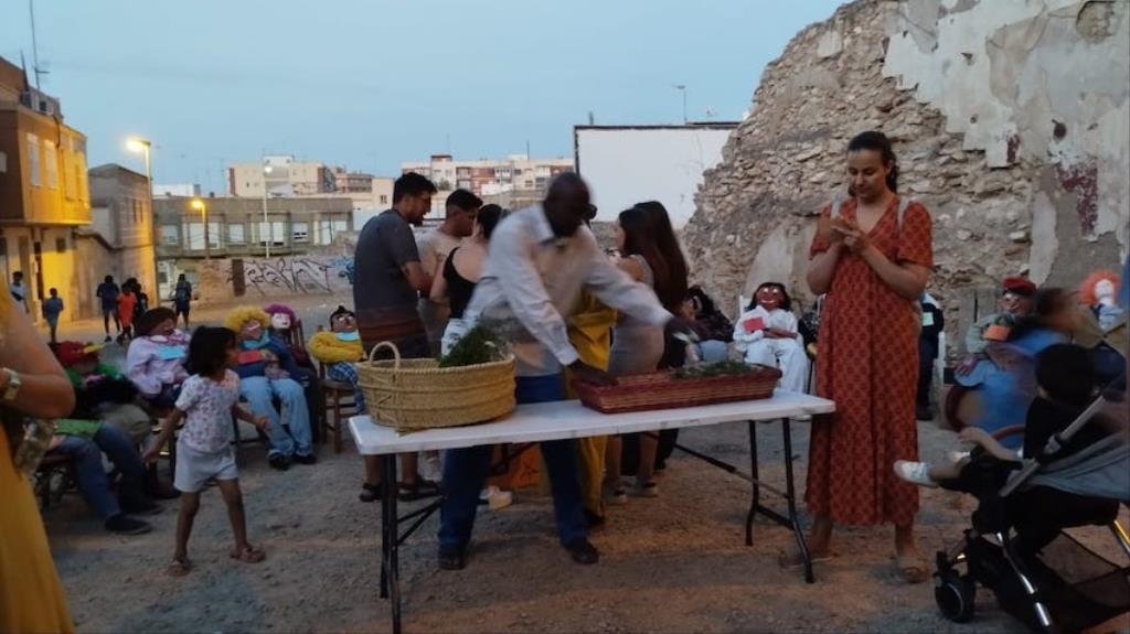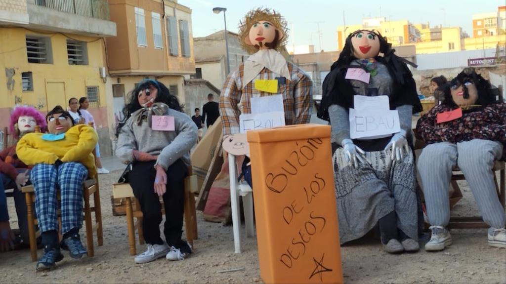 Todo lo desarrollado fue presenciado, junto a un 'buzón de deseos', por los numerosos 'juanes y juanas' elaborados para la ocasión, lo que se ha convertido en una seña de identidad del barrio, pues parece que cada edición se multiplican, aunque el final para casi todos (fueron dos los indultados) es arder en el fuego de la tradicional hogareta.