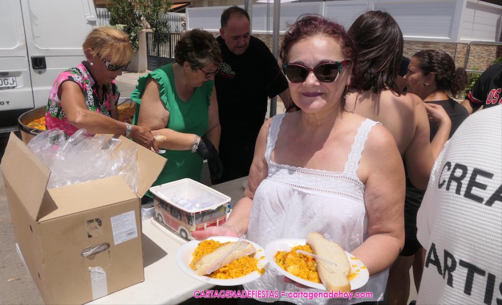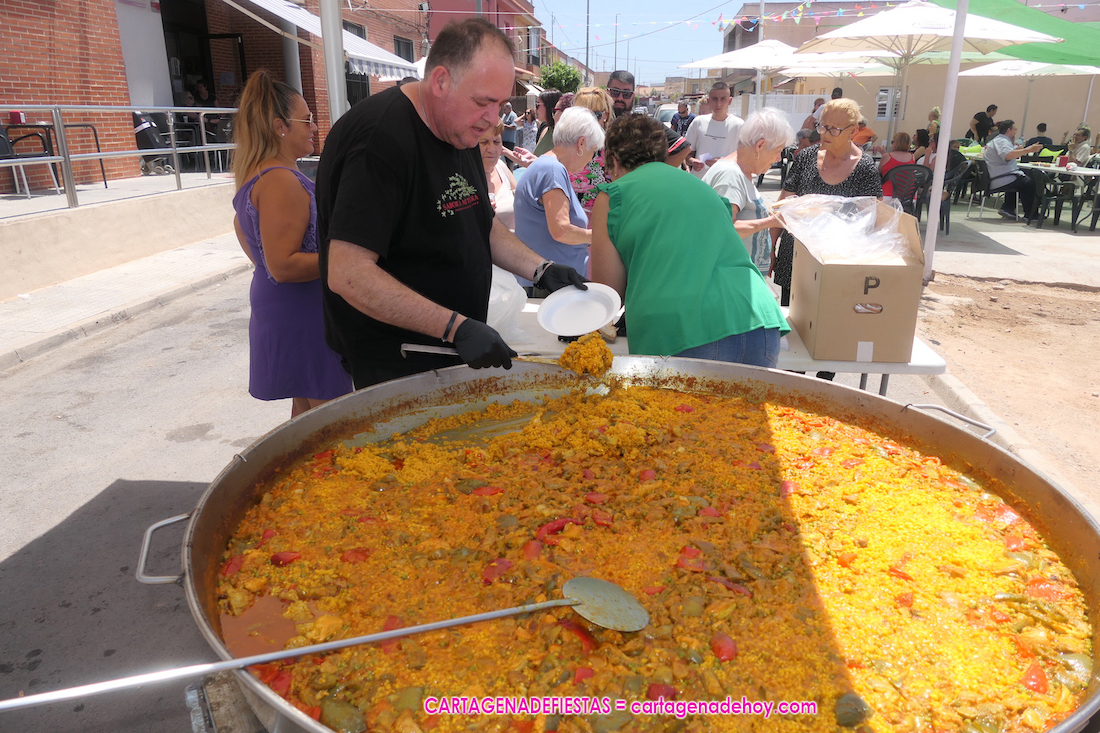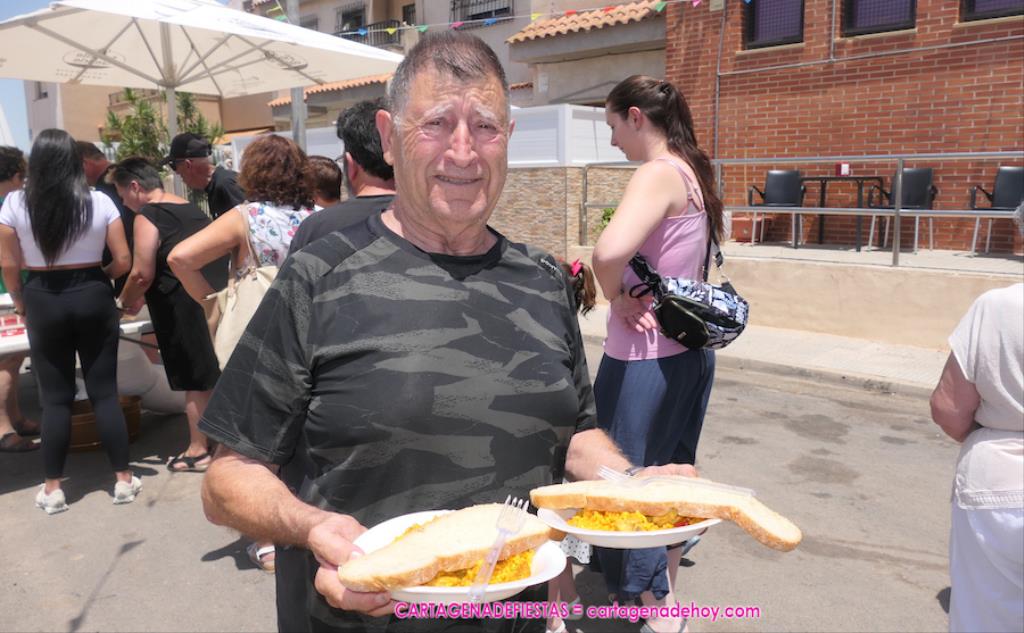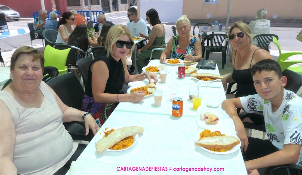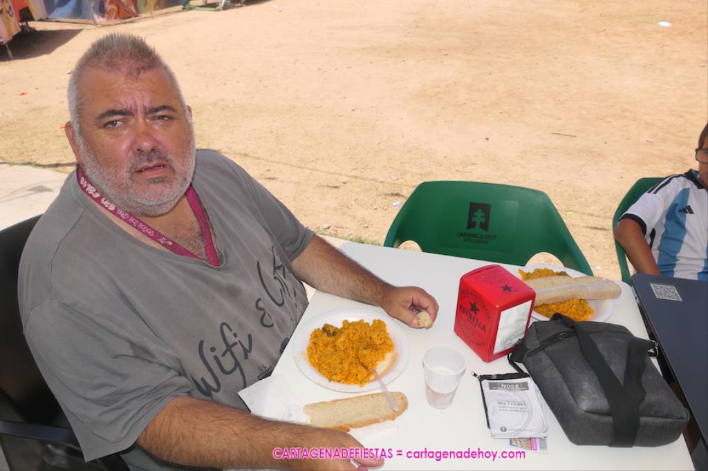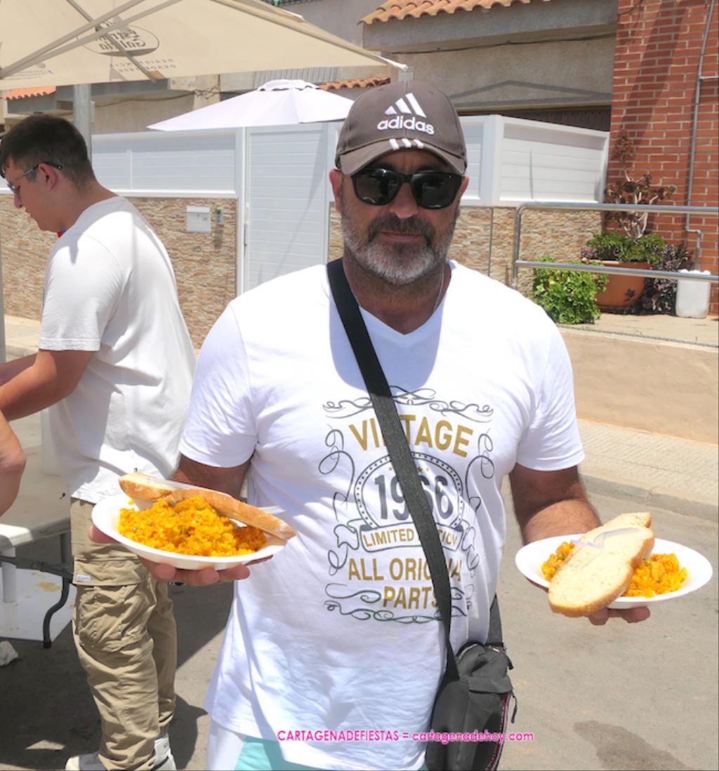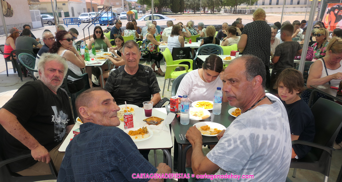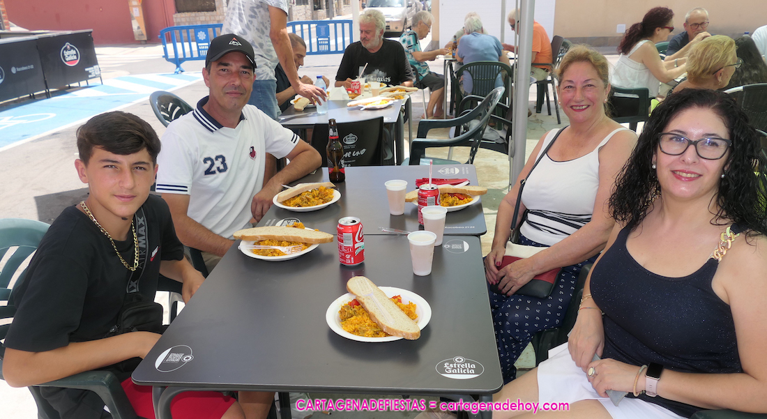 Después llegó la jornada del epílogo, que empezó a las diez con una chocolatada con bollos en la fachada del local social, frente a la que se ha ubicado estos días el recinto festero. Fue un buen punto de arranque gastronómico, pues después vinieron el pan con sobrasada y un sabroso y meloso arroz elaborado por Santiago con pollo, costillejas, pimientos y alcaciles, que fue el epicentro de una gran comida de hermandad, regada con cañas de cerveza que brotaban sin coste para los asistentes.