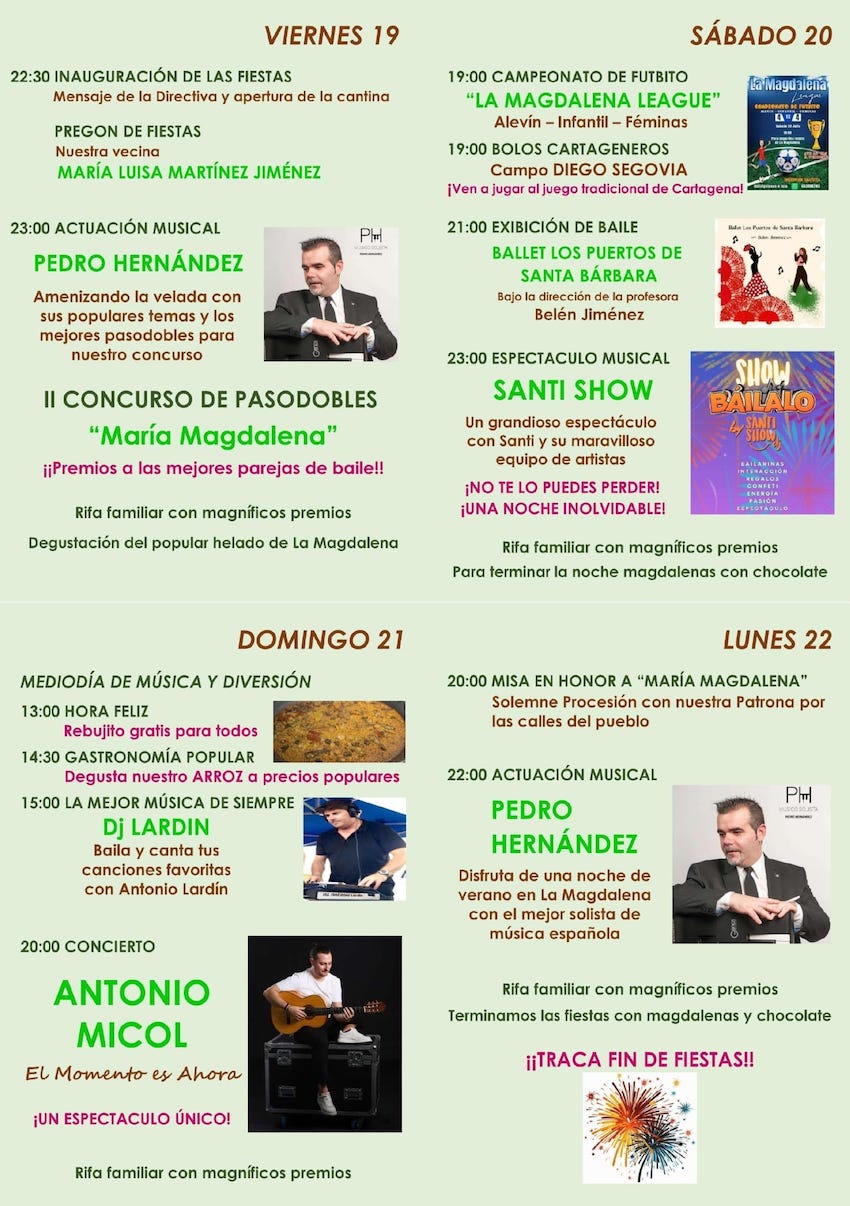 María Luis Martínez será la pregonera de unos festejos que se celebrarán del 19 al 22 de este mes y que en su programa incluye música en directo, gastronomía tradicional, acto religioso en honor a a patrona y bolos cartagenero.