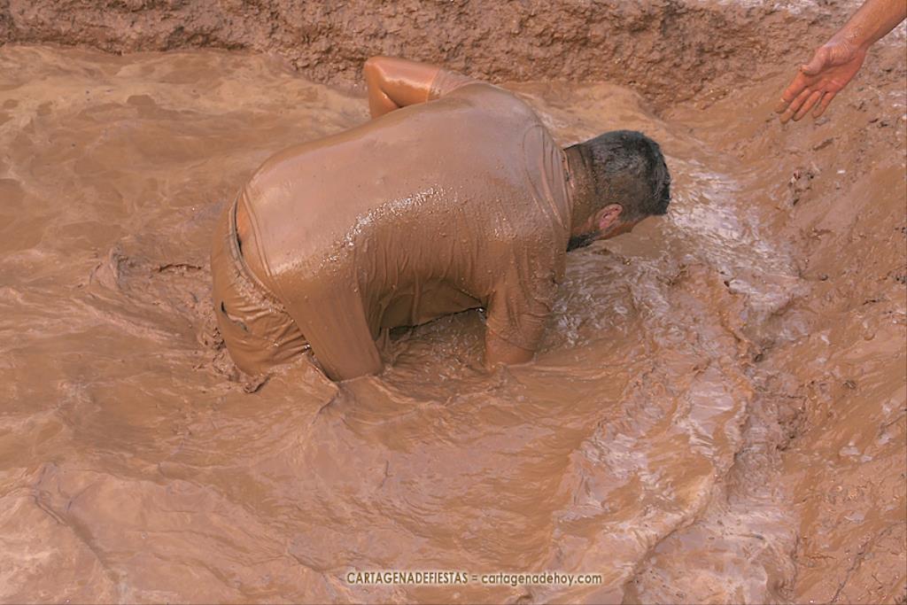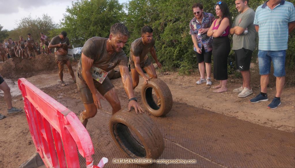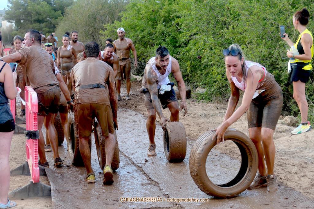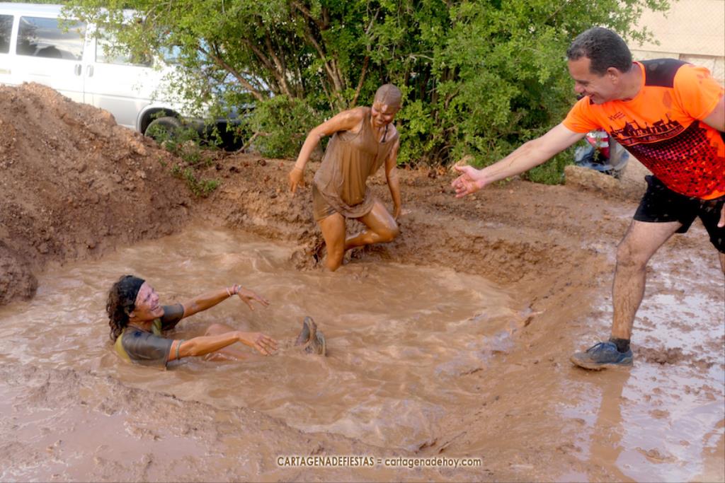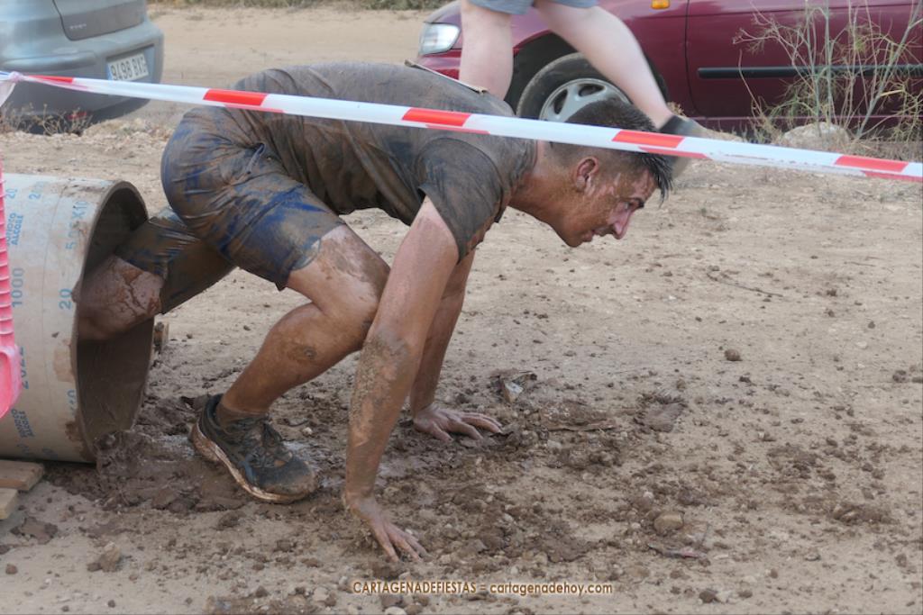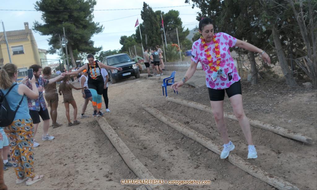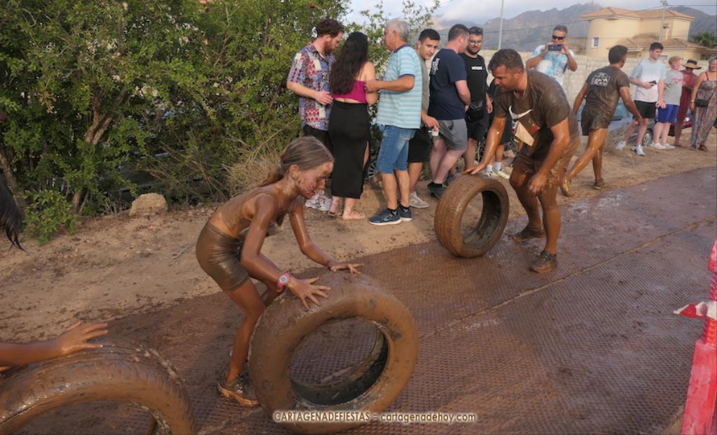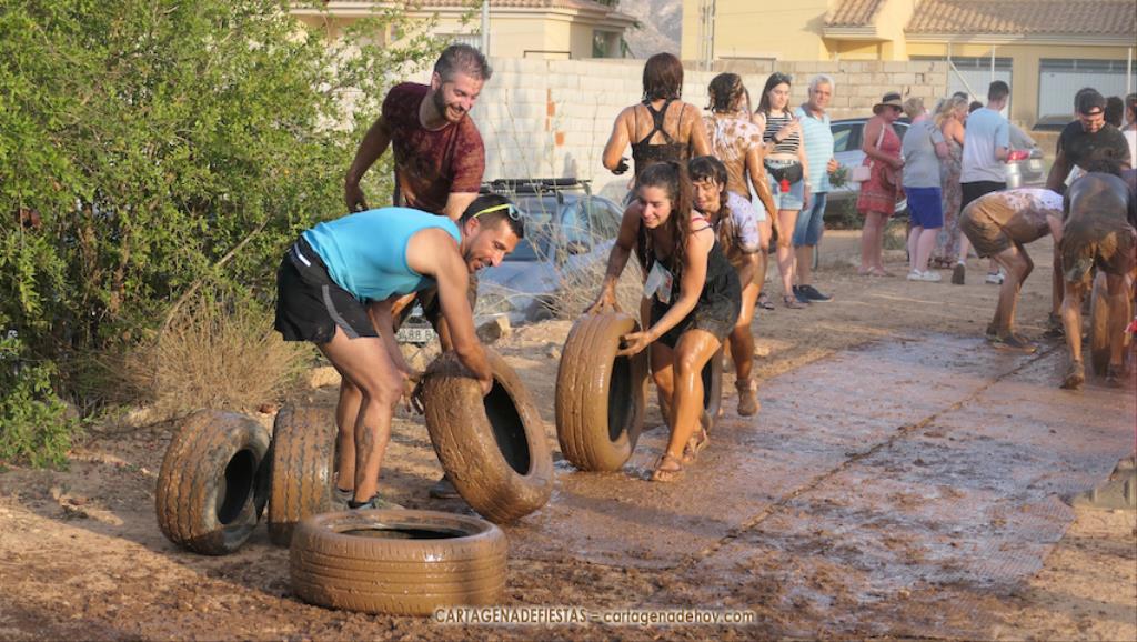 Después de las balsas, carrera con ruedas de coche y paso por bidones huecos arrastrándose. Toda una yincana de fiestas populares que generó infinidad de sonrisas al ver a personas de muy variadas edades darse remojones en el barro.