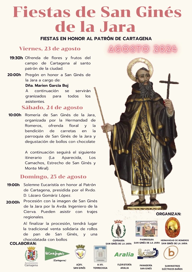 El viernes 23, a las 20 horas tendrá lugar el pregón, a cargo de Marien García Boj, Hermana Mayor de la Cofradía del Resucitado, en la Parroquia de San Ginés de La Jara (C/ Ingeniero de la Cierva). Se trata de un acto promovido por la Parroquia de San Ginés de la Jara, la Cofradía de San Ginés de la Jara y la Hermandad de Romeros de San Ginés de la Jara, con la colaboración del Ayuntamiento de Cartagena.