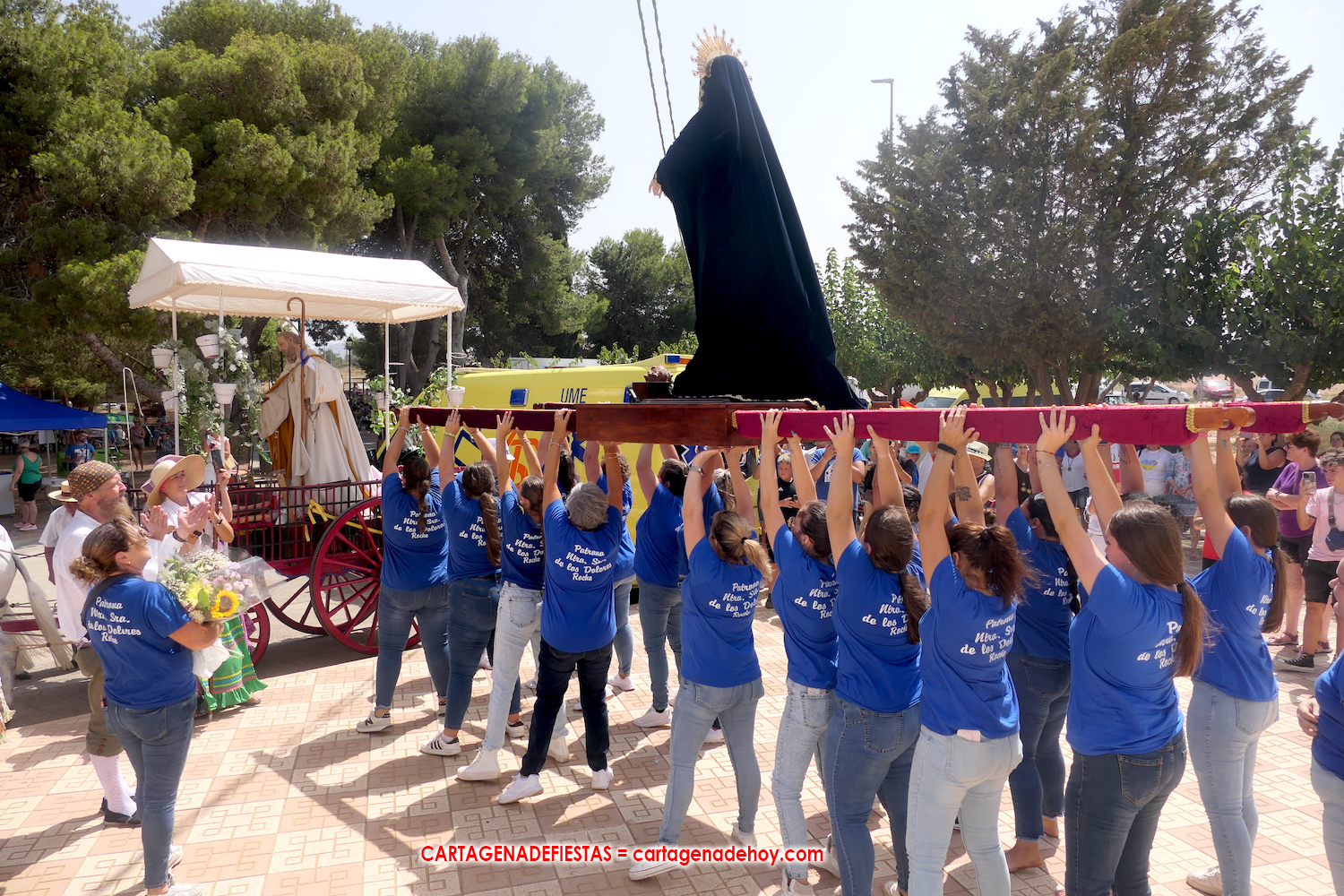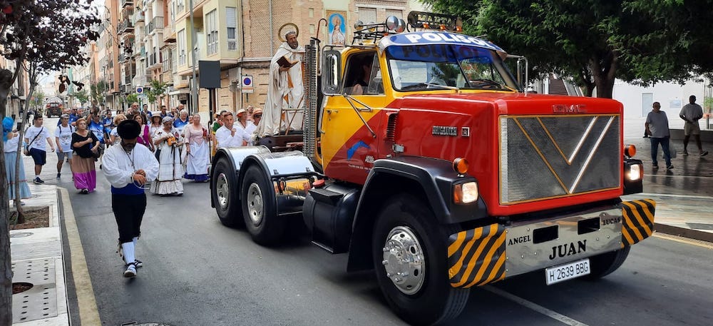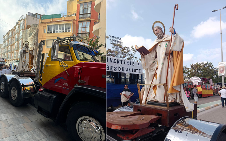 La primera solución ha sido llevar al santo en brazos hasta la plaza del Parque de Artillería, donde ha sido colocado en la parte posterior de un camión de Grúas Polisol, que han llevado Jesús y Juan hasta la barriada de San Ginés, donde ha tenido lugar la bendición de carretas y otra eucaristía, además de ofrecerse a los integrantes de la comitiva chocolate con bollos para coger fuerzas para el largo camino que les quedaban fuera de la ciudad. En esa primera parte del trayecto, la agrupación musical 'Cartagena 1990' ha animado la marcha.
