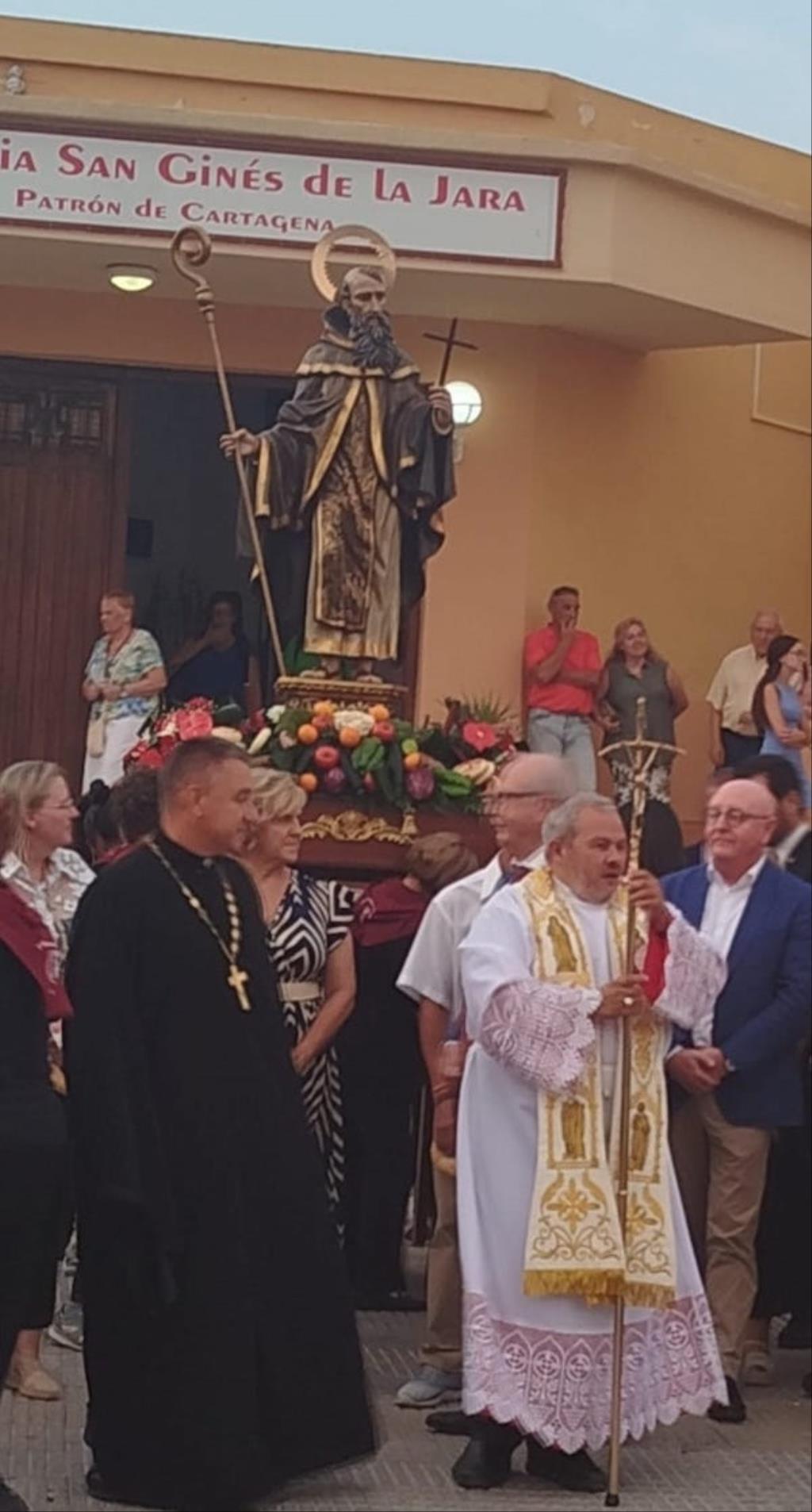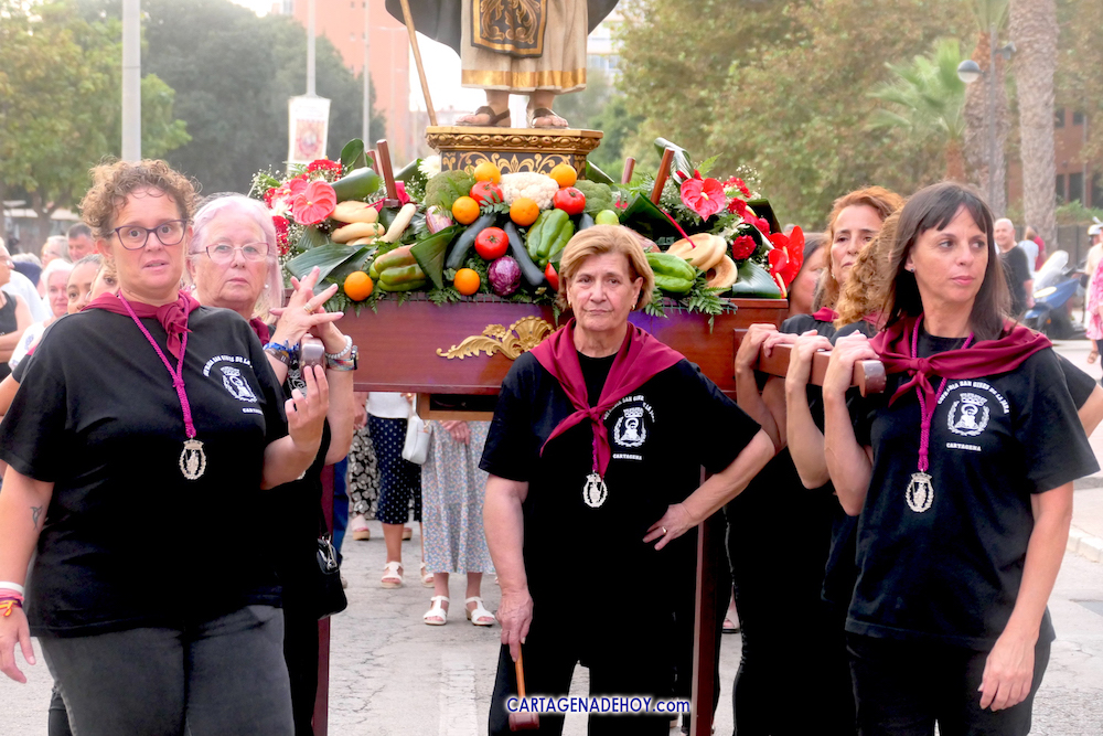 Tomates, pepinos, pimientos, naranjas y otras verduras, además de los rollicos del santo, forman desde hace dos años el frontal de la peana que lleva en procesión a San Ginés de la Jara. Todos son productos naturales, completándose el adorno con la flor de 'anthurium'.