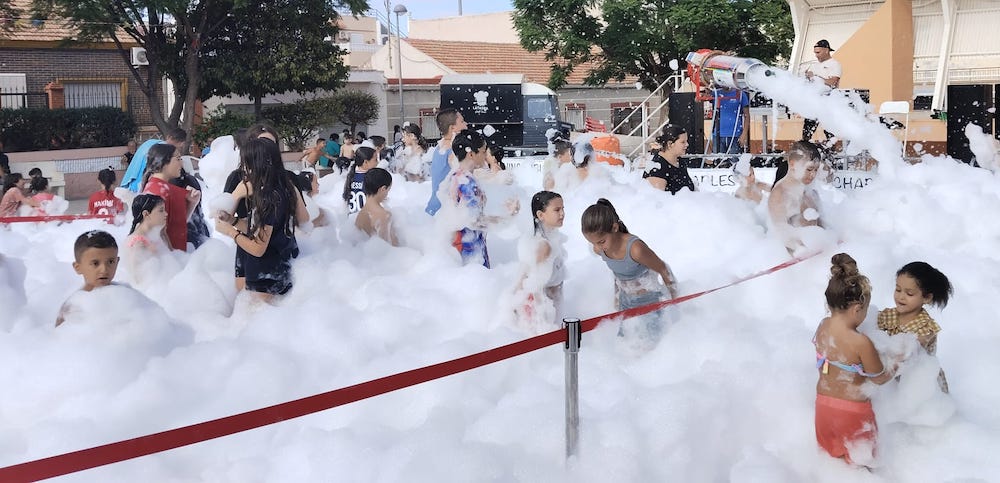 Una novedad de este año en las fiestas patronales dolorense ha sido el regreso, después de mucho tiempo, de la fiesta de la espuma, lo que ha tenido lugar hoy, tras la comida de convivencia de los vecinos.
